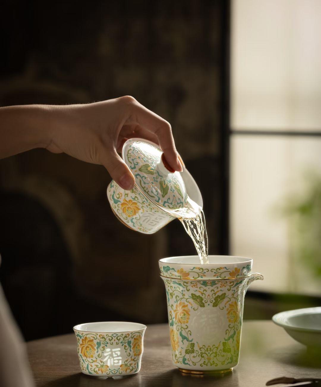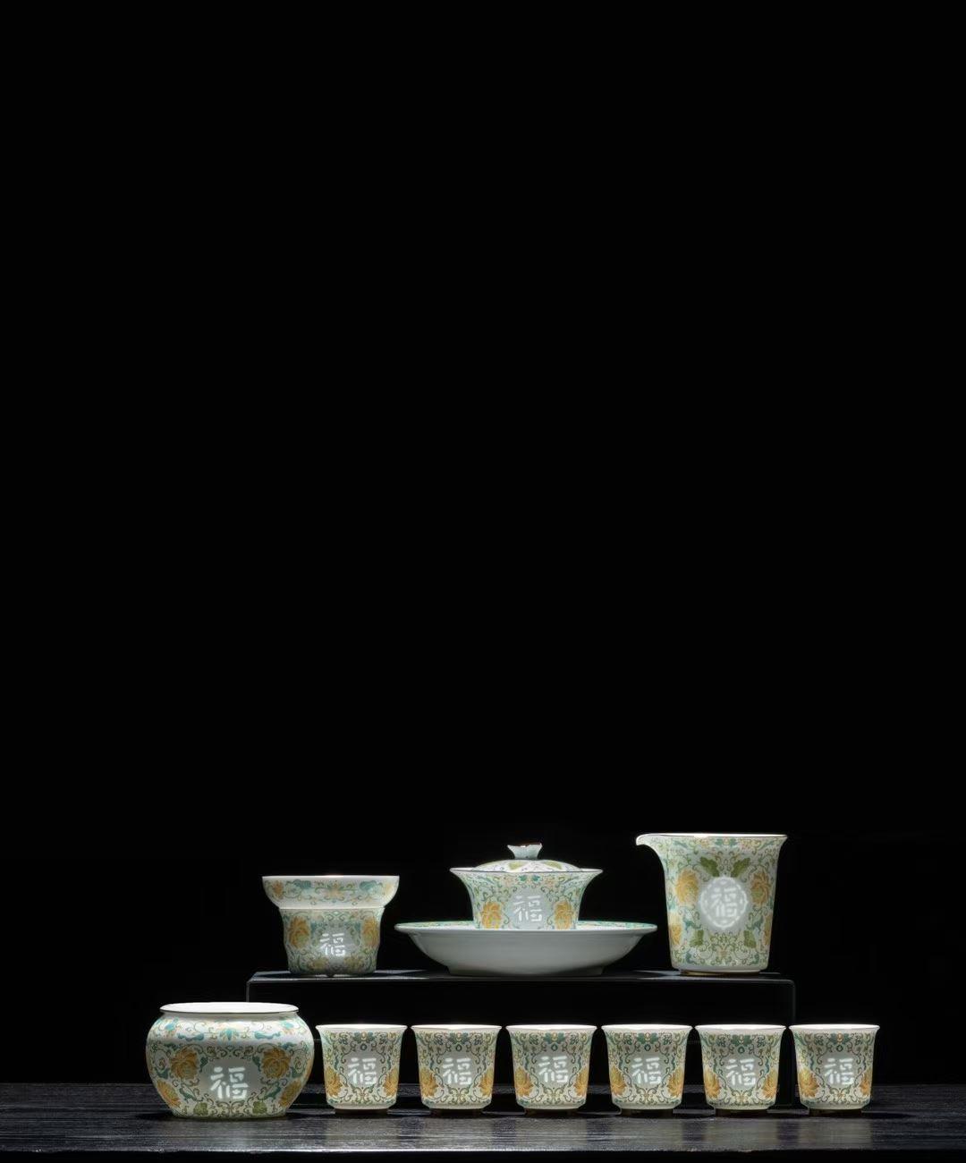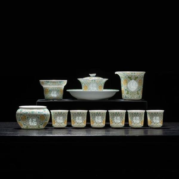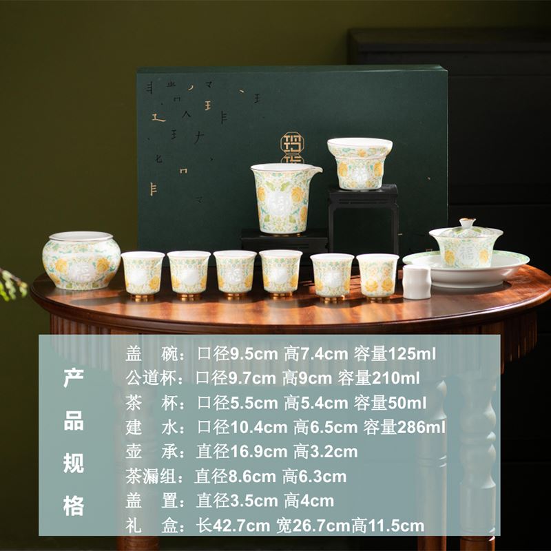款式:青花缠枝莲/福言吉语 配置:盖碗:口径9.1cm 高8.6cm 容量158ml, 公道杯:口径9.7cm 高9cm 容量210ml, 茶杯:口径5.5cm 高5.4cm 容量50ml, 建水:口径10.4cm 高6.5cm 容量286ml, 壶承:直径16.9cm 高3.2cm, 茶漏组:直径8.6cm 高6.3cm, 盖 置:直径3.5cm 高4cm, 礼 盒:长42.7cm 宽26.7cm高11.5cm。