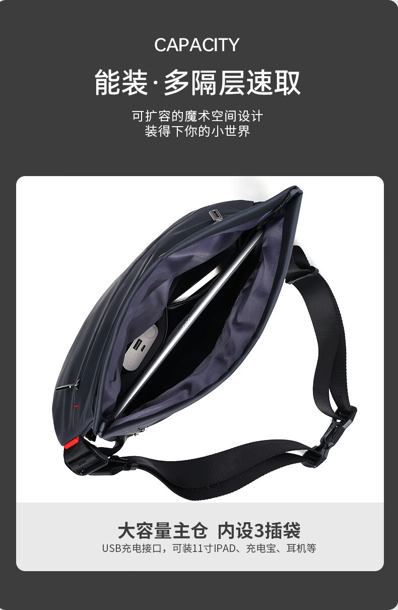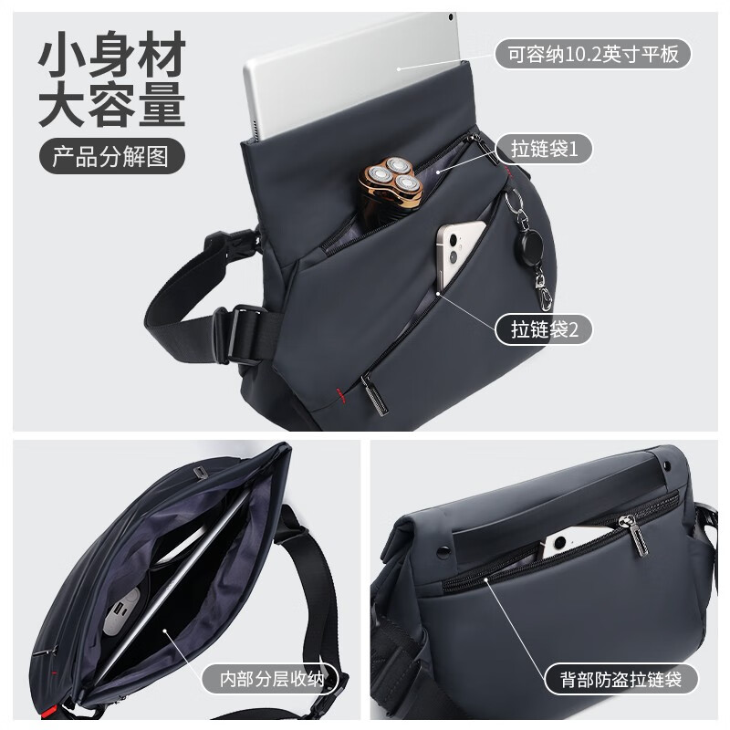型号:33015磁扣 重量:0.55kg 尺寸:350*165*100(MM) 材质:涤纶覆皮膜材质 颜色:黑 斜挎背包:可放ipad- 防水面料 - 美观实用而且不增加您的负担,可户外使用