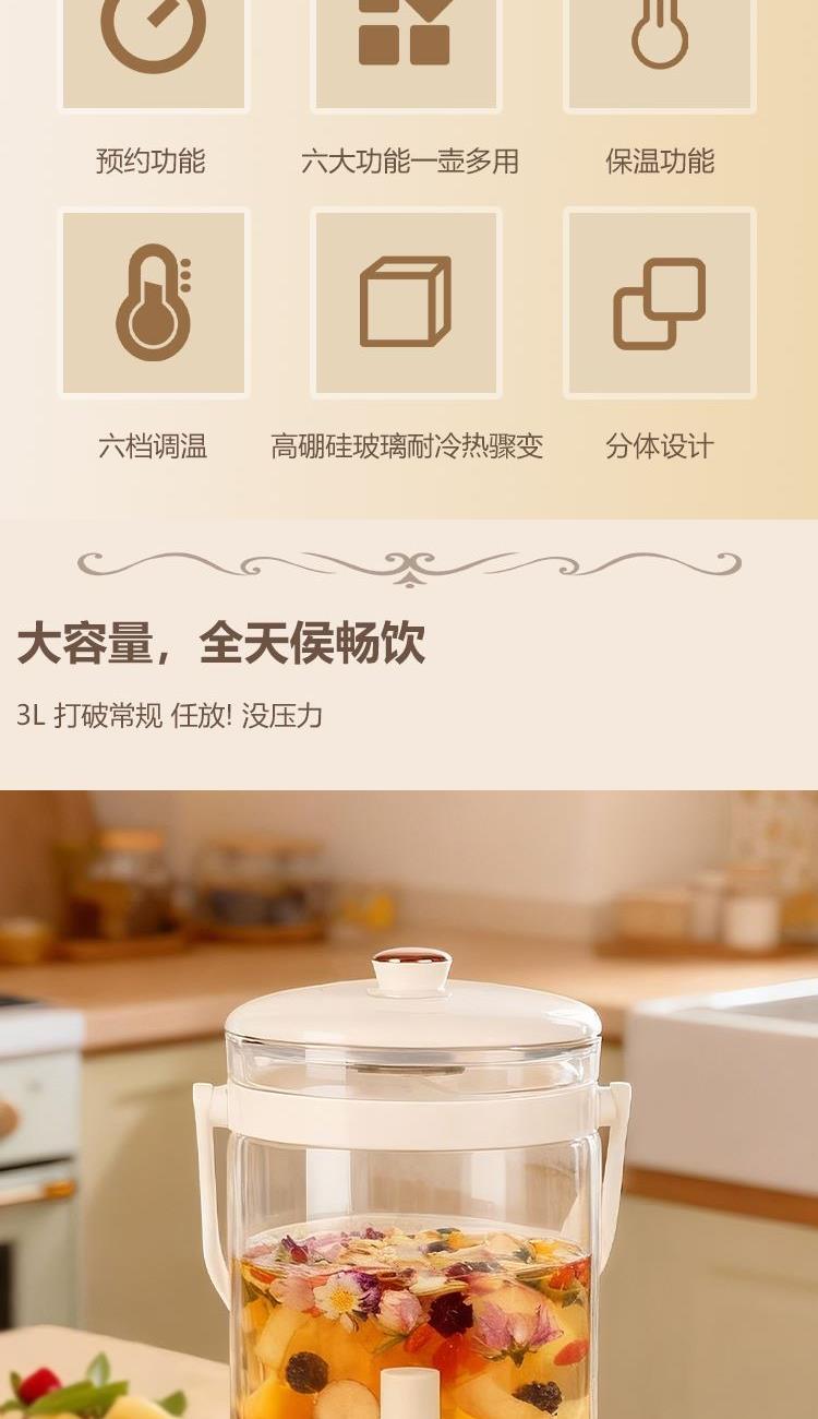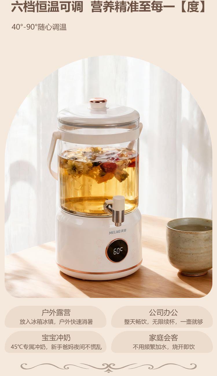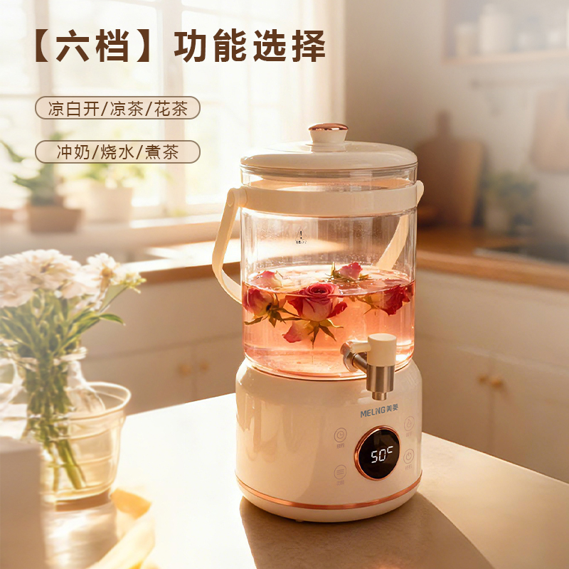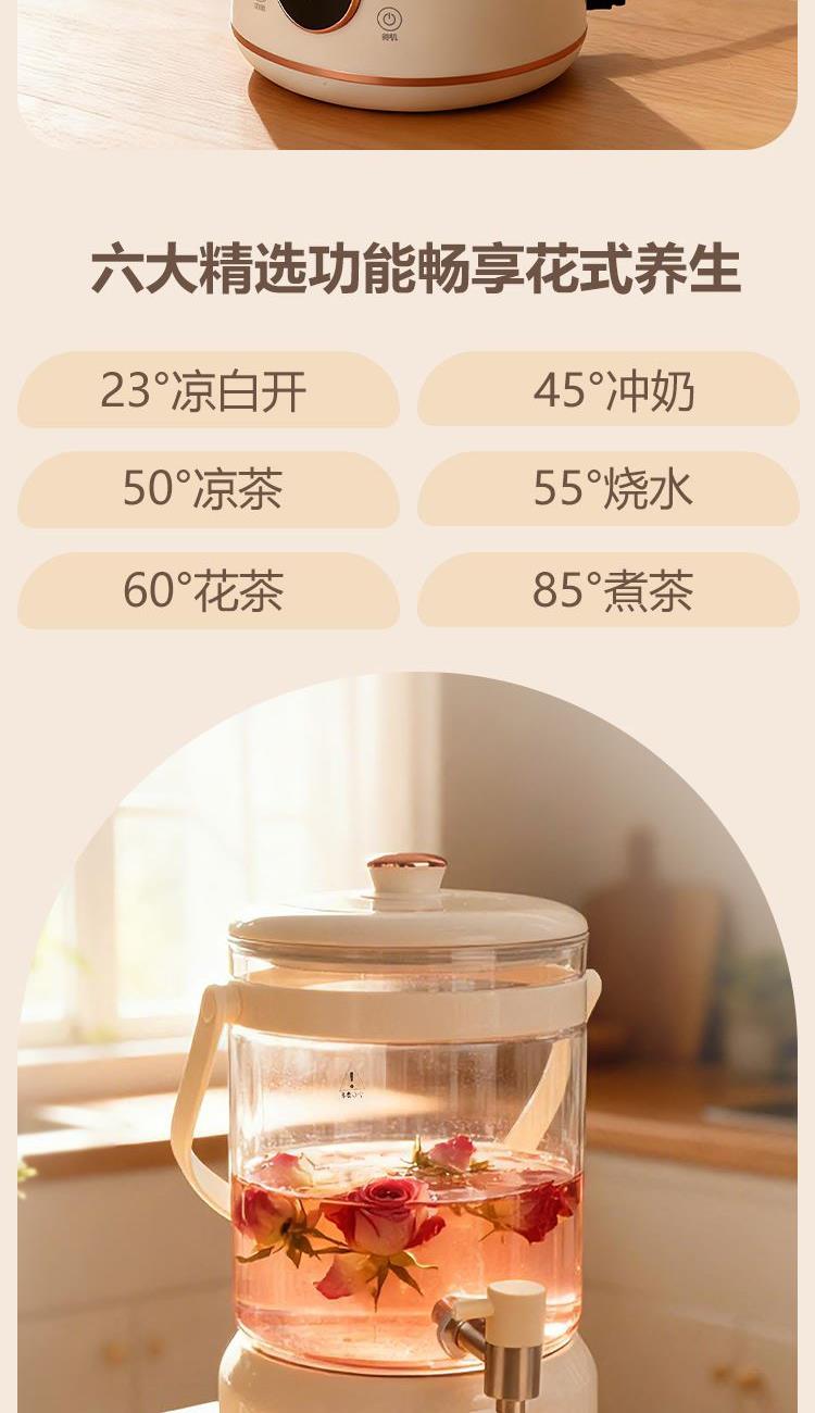 1、6个功能:烧水、花茶、煮茶、凉茶、凉白开、冲奶、,含24小时保温,24小时预约功能,40-90℃调温,