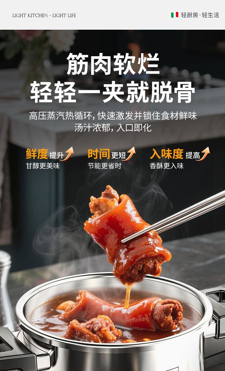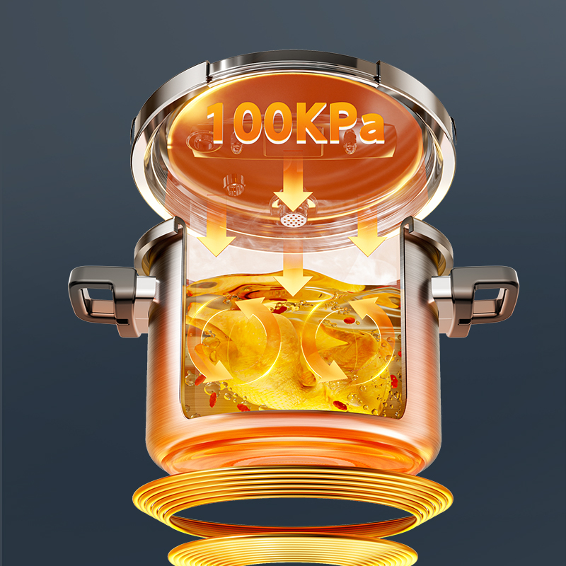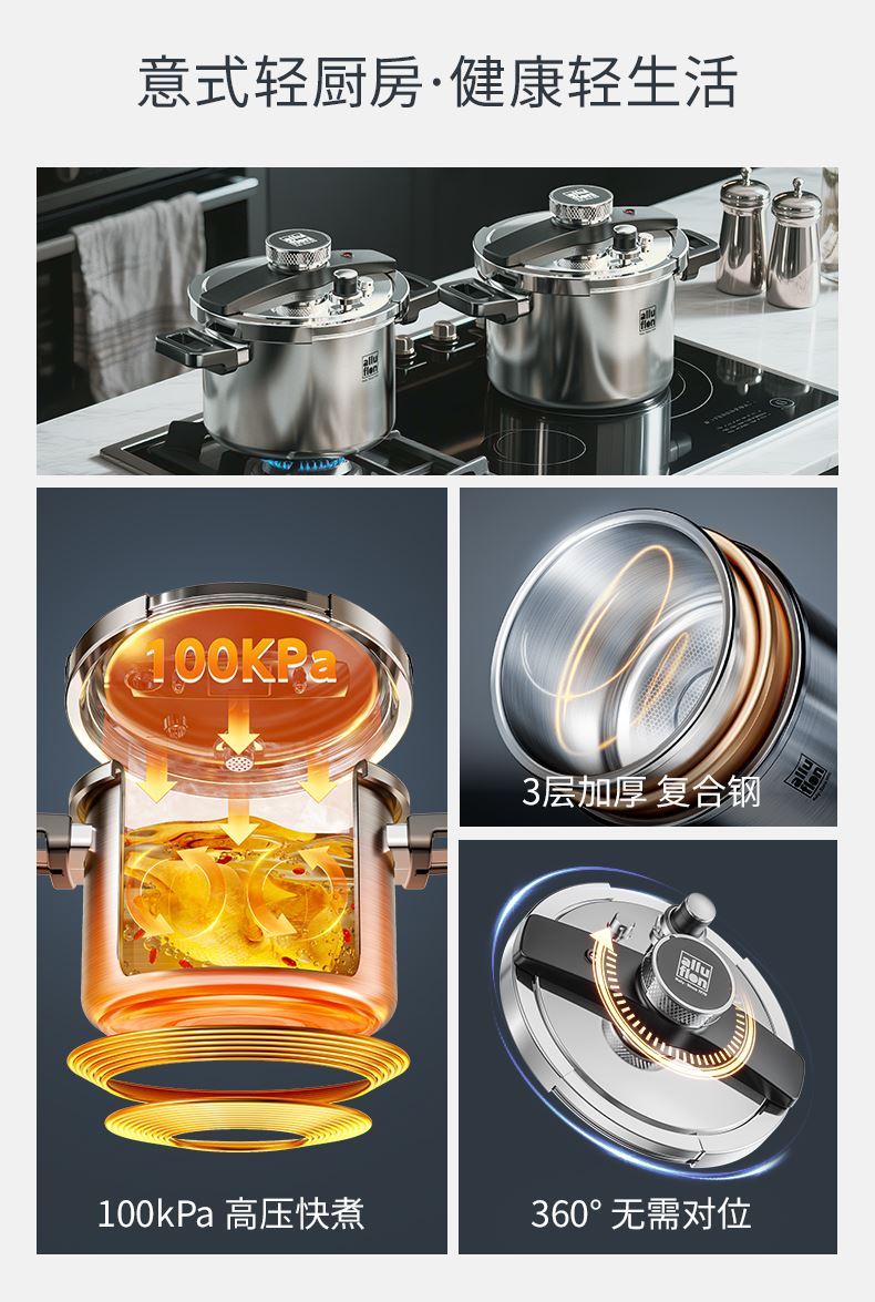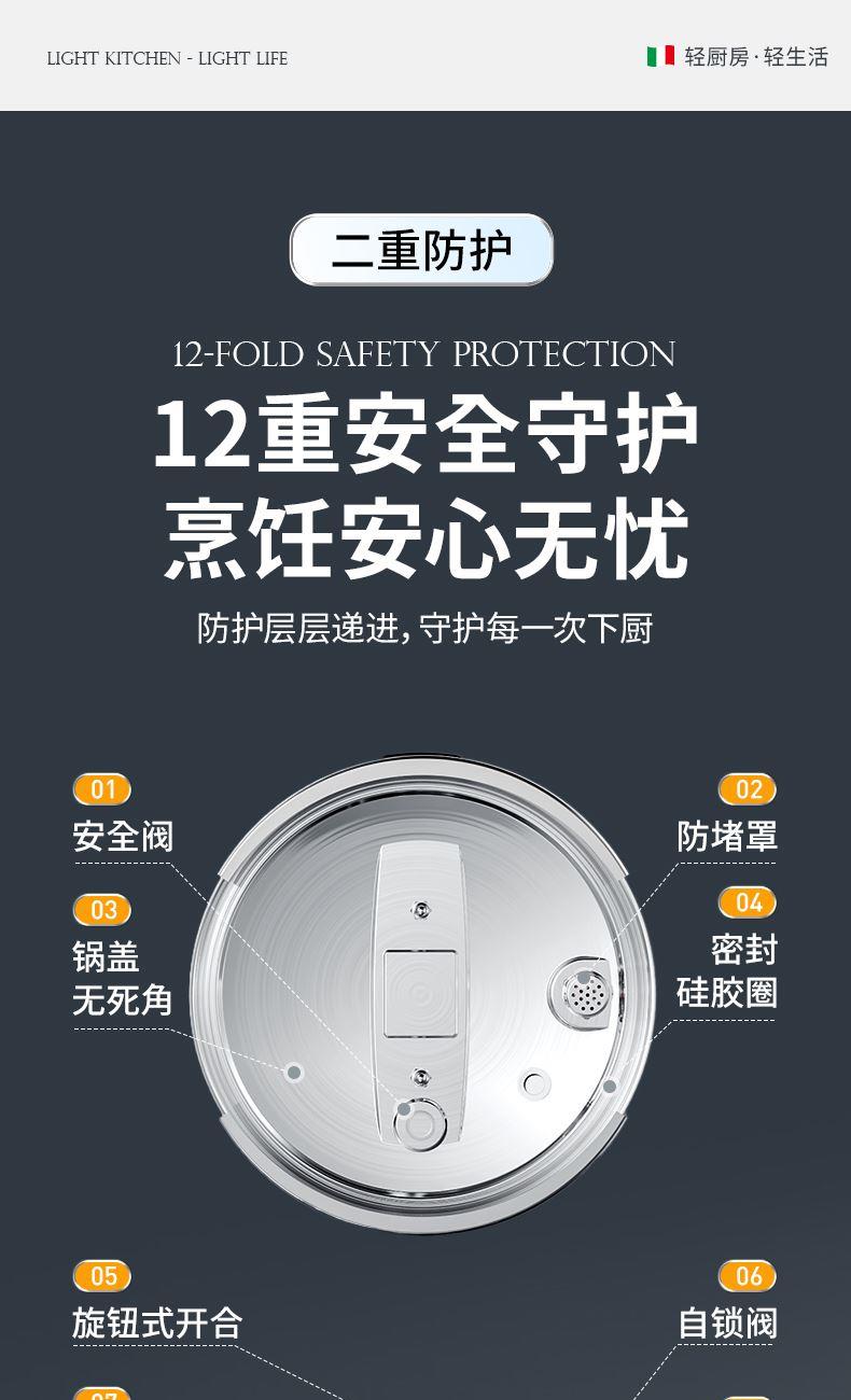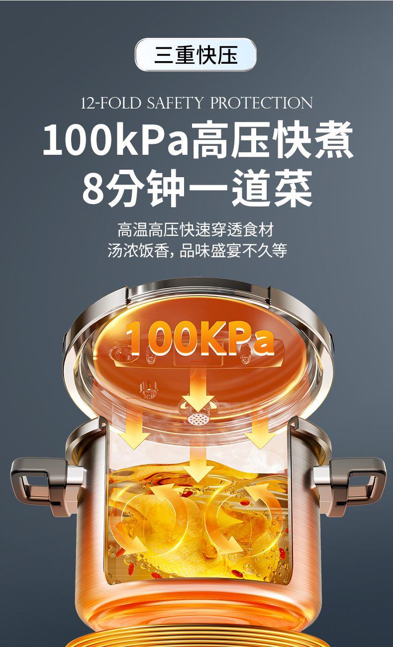 产品规格:22cm 产品容量:6L 产品材质:复合钢 包装尺寸:335*295*235 1、360度单手旋开锅盖,解放双手。 2、100KPA快压,美味瞬时享,营养少流失。 3、锅内食品级304不锈钢,更健康,无惧酸碱刮擦。 4、四重保险结构,更安全。 5、三层复合钢一体锅身,更耐用。 6、人体力学手柄,坚固耐用,握感舒适。 7、不挑炉灶,适用多种炉具。