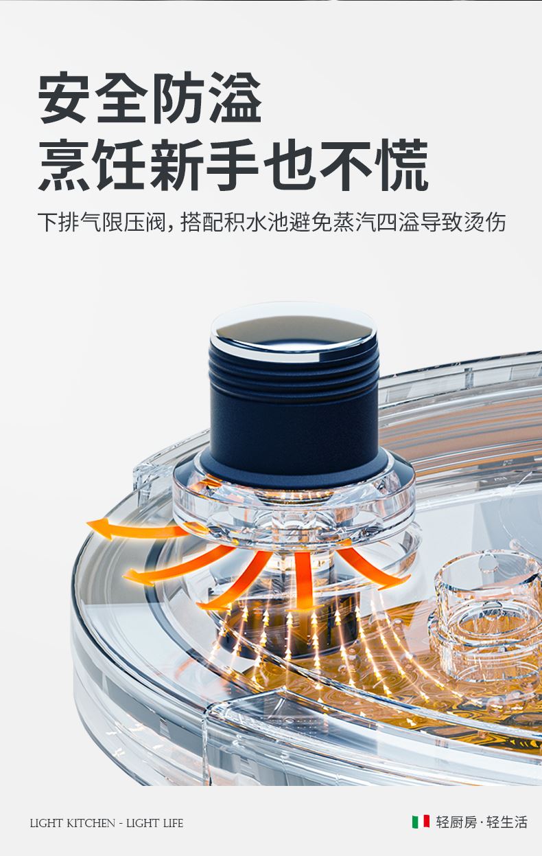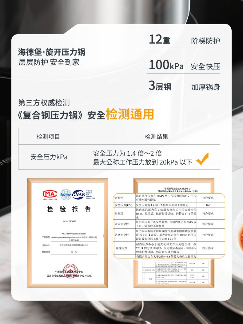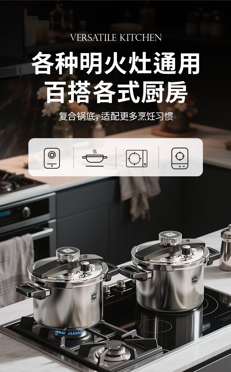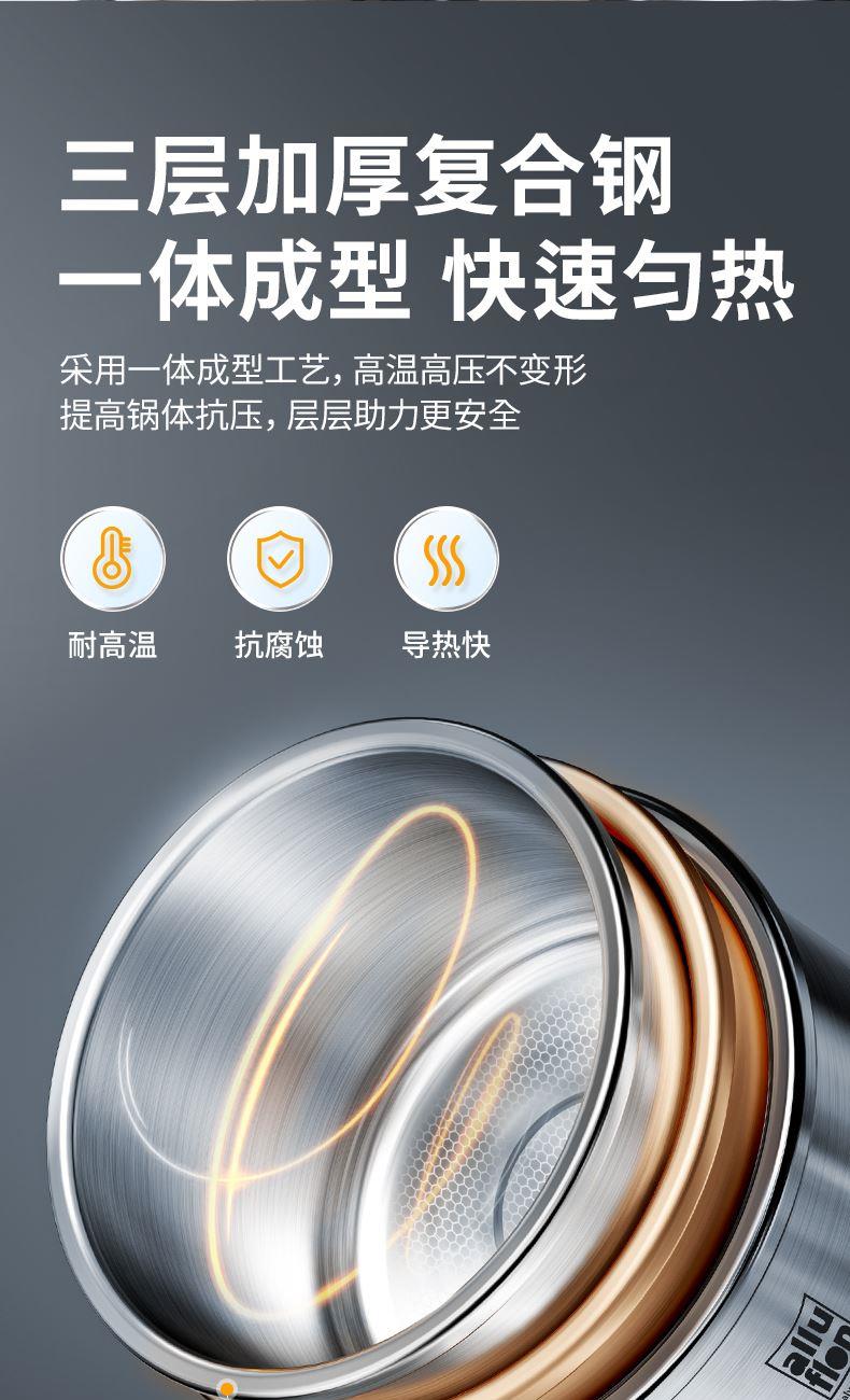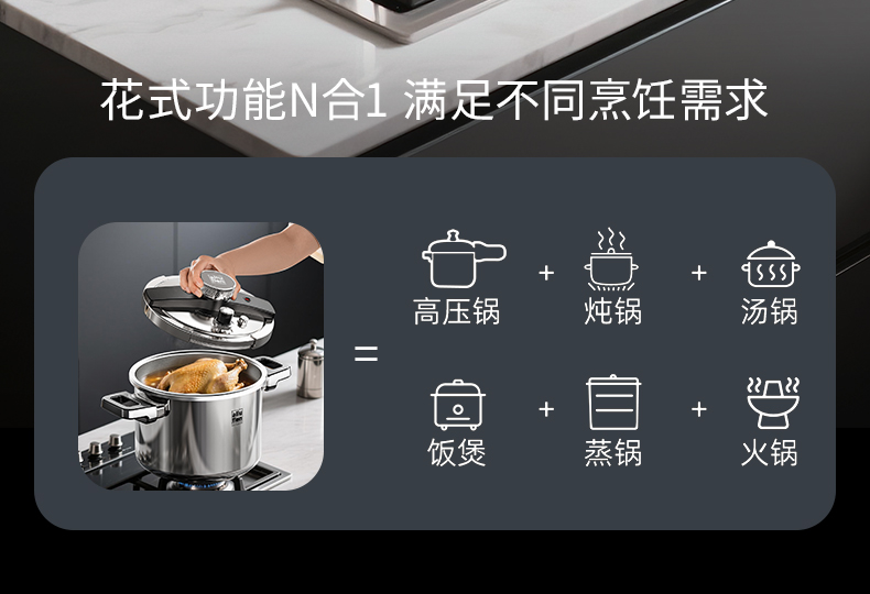 产品规格:22cm 产品容量:6L 产品材质:复合钢 包装尺寸:335*295*235 1、360度单手旋开锅盖,解放双手。 2、100KPA快压,美味瞬时享,营养少流失。 3、锅内食品级304不锈钢,更健康,无惧酸碱刮擦。 4、四重保险结构,更安全。 5、三层复合钢一体锅身,更耐用。 6、人体力学手柄,坚固耐用,握感舒适。 7、不挑炉灶,适用多种炉具。