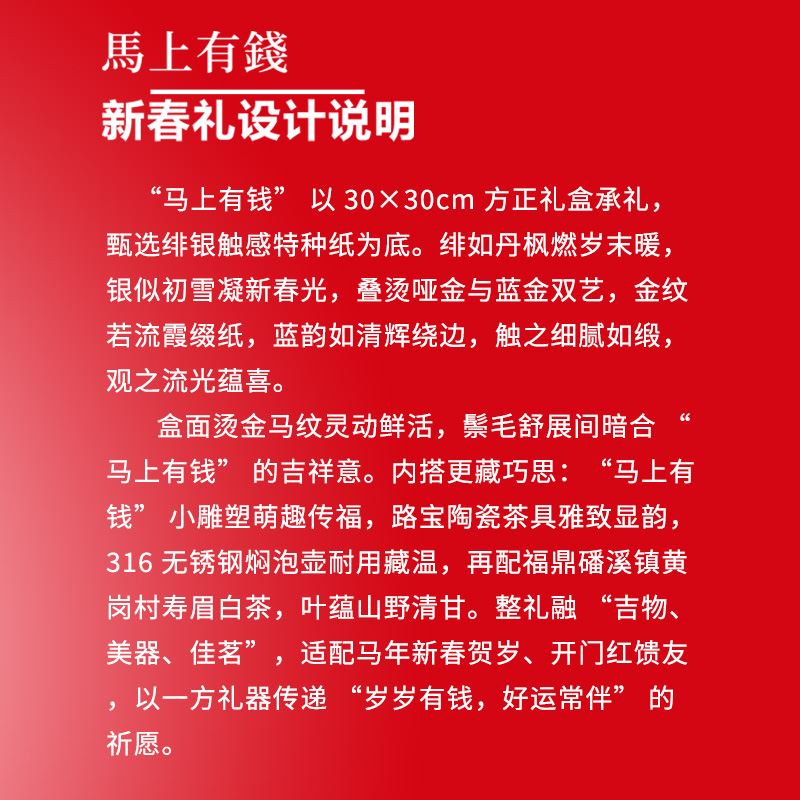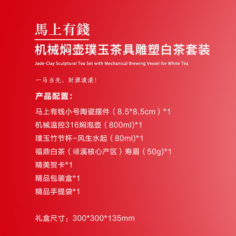 【产品配置】 马上有钱小号陶瓷摆件(8.5*8.5cm)*1 机械温控316焖泡壶(800ml)*1 璞玉竹节杯-风生水起(80ml)*1 福鼎白茶(磻溪核心产区)寿眉(50g)*1 精美贺卡*1 精品包装盒*1 精品手提袋*1 【产品说明】 马上有钱寓意,商务新年礼赠佳选; 机械焖壶+璞玉茶具+福鼎白茶寿眉,配置齐全; 焖泡便捷,温控锁鲜,饮茶体验佳; 璞玉陶瓷工艺,茶具摆件具收藏价值; 多场景适配,商务、新年礼赠有格调。