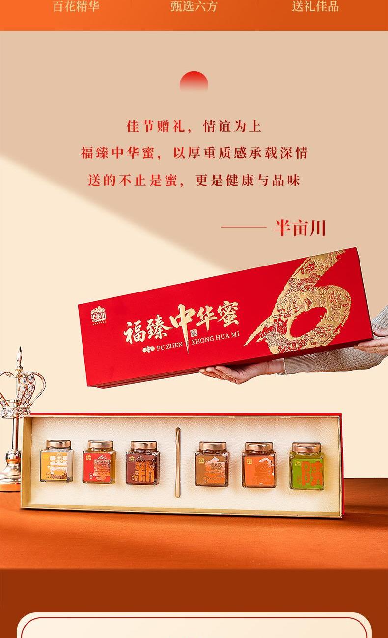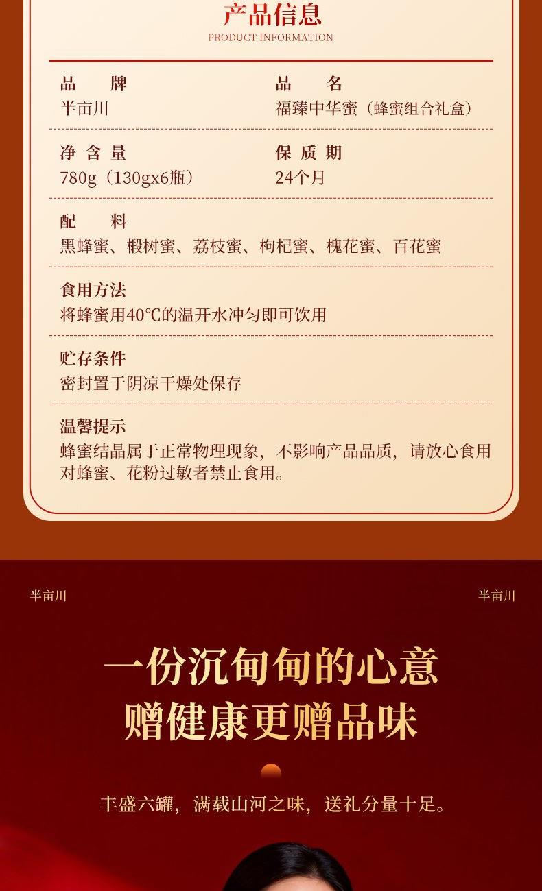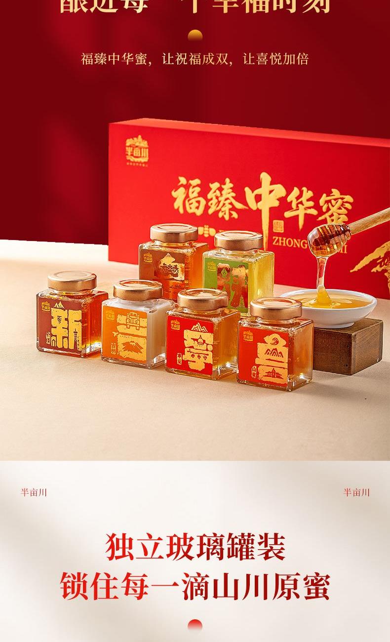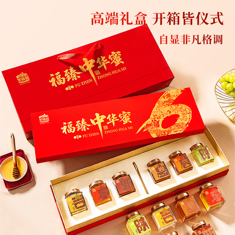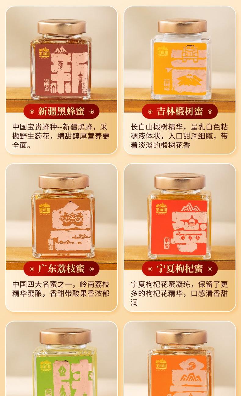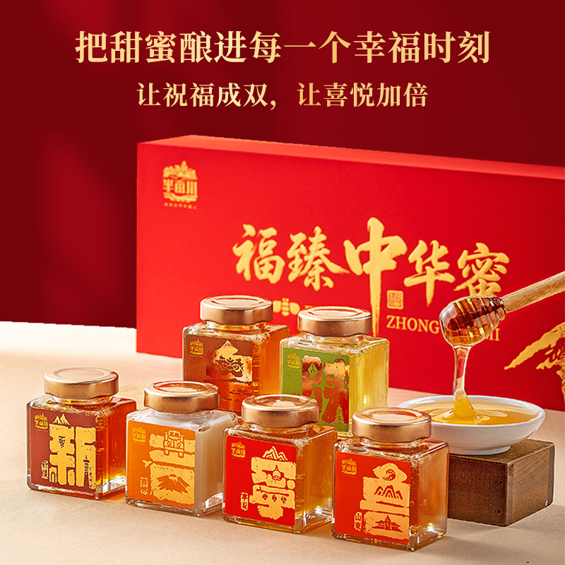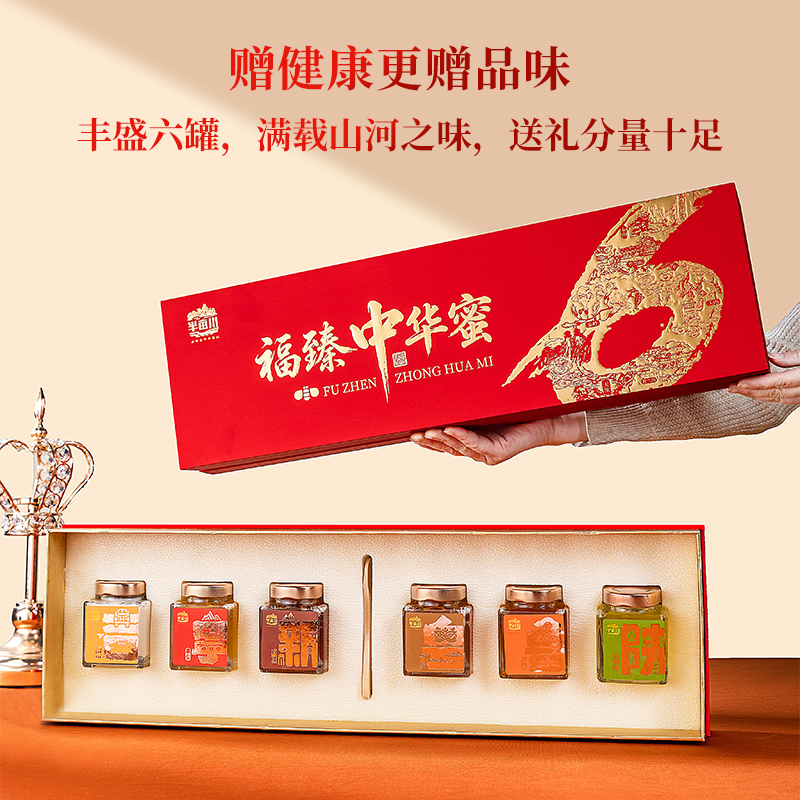 产品配置: 黑蜂蜜130g 椴树蜜130g 荔枝蜜130g 枸杞蜜130g 槐花蜜130g 百花蜜130g 净含量:780g 礼盒尺寸:60*8*18cm 甄选黑蜂、椴树等六种珍有蜜源,一盒尝遍南北风味。自然成熟封酿,无添加更纯粹。清甜、醇厚、果香多元口感。
