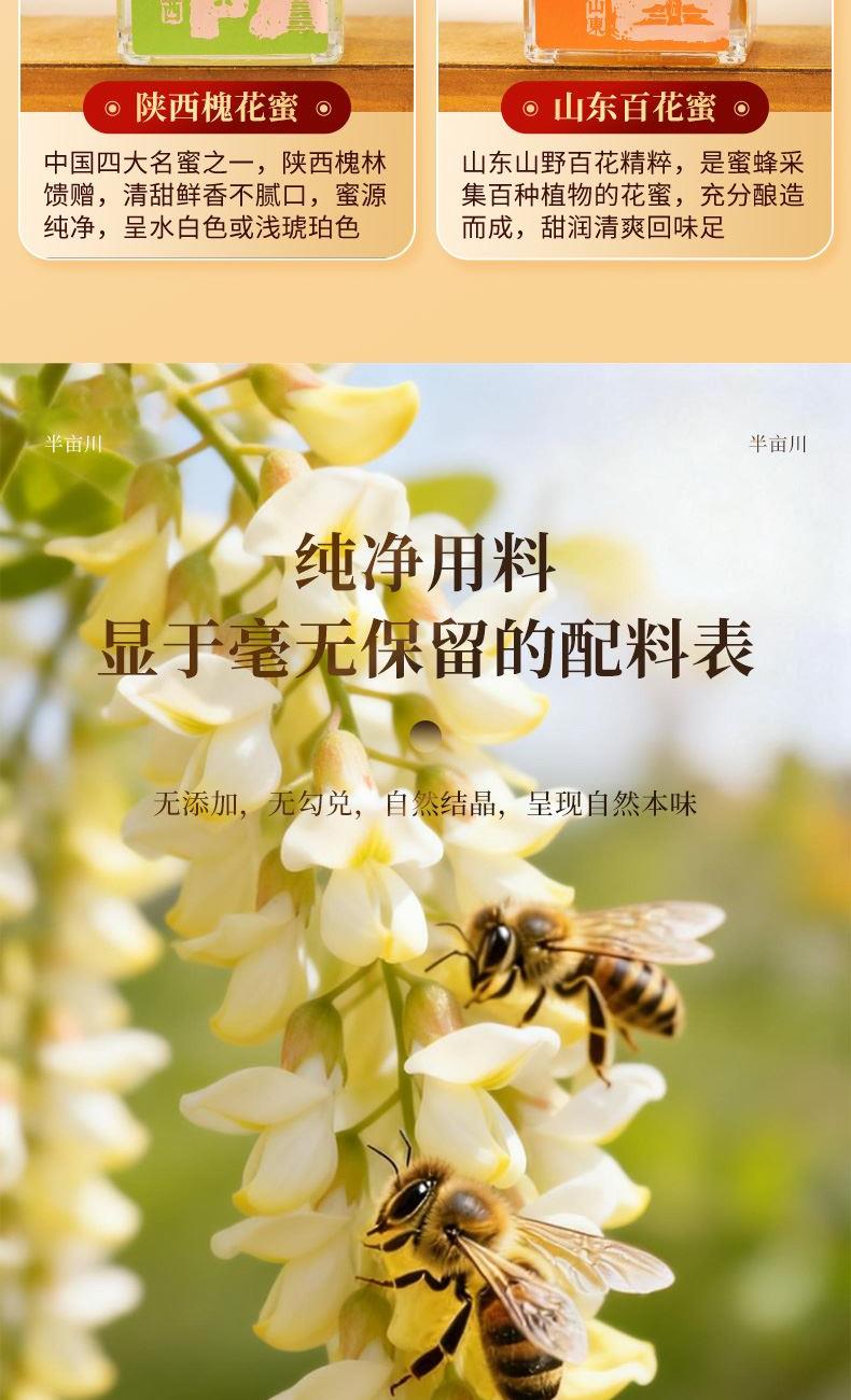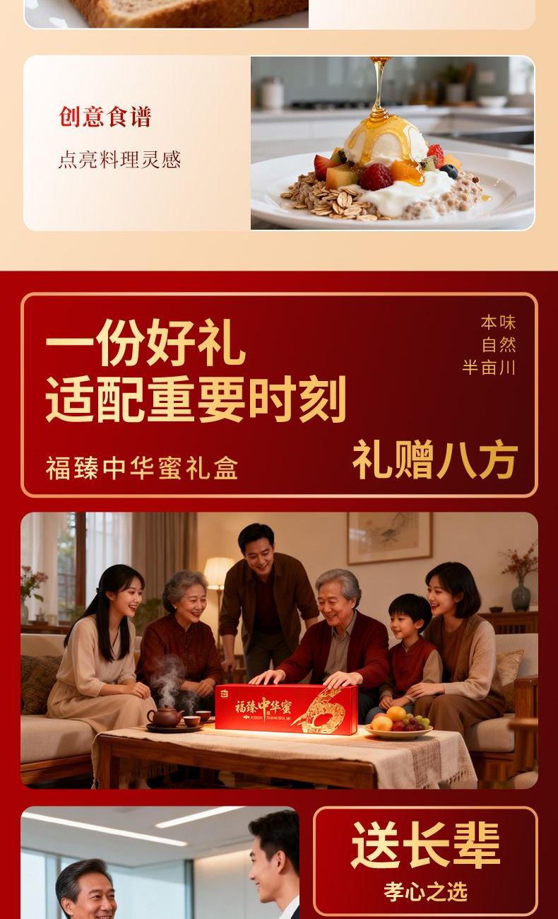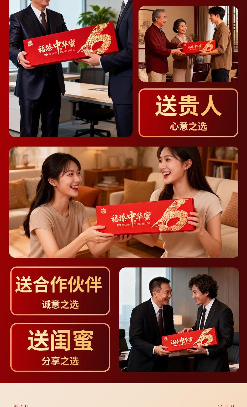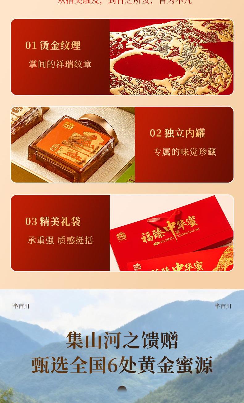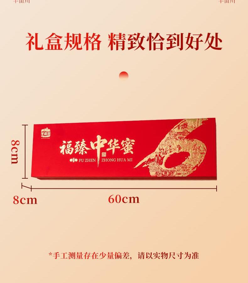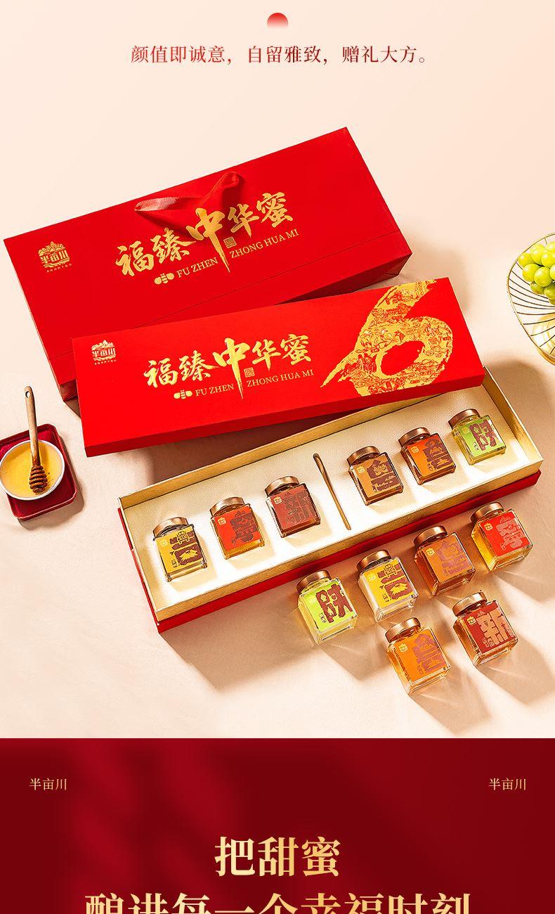 产品配置: 黑蜂蜜130g 椴树蜜130g 荔枝蜜130g 枸杞蜜130g 槐花蜜130g 百花蜜130g 净含量:780g 礼盒尺寸:60*8*18cm 甄选黑蜂、椴树等六种珍有蜜源,一盒尝遍南北风味。自然成熟封酿,无添加更纯粹。清甜、醇厚、果香多元口感。