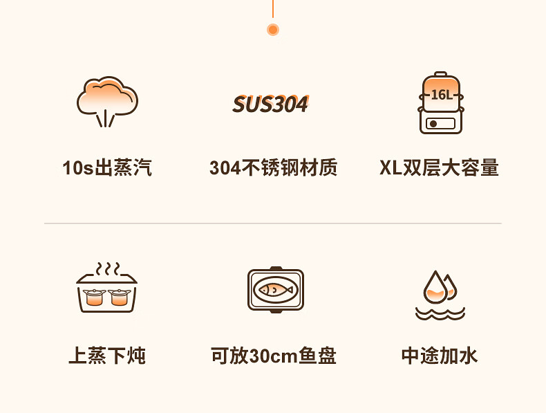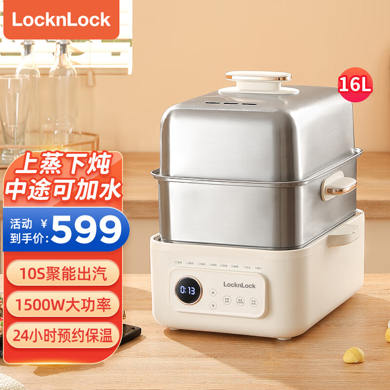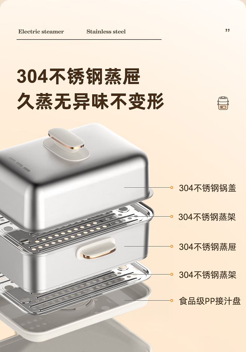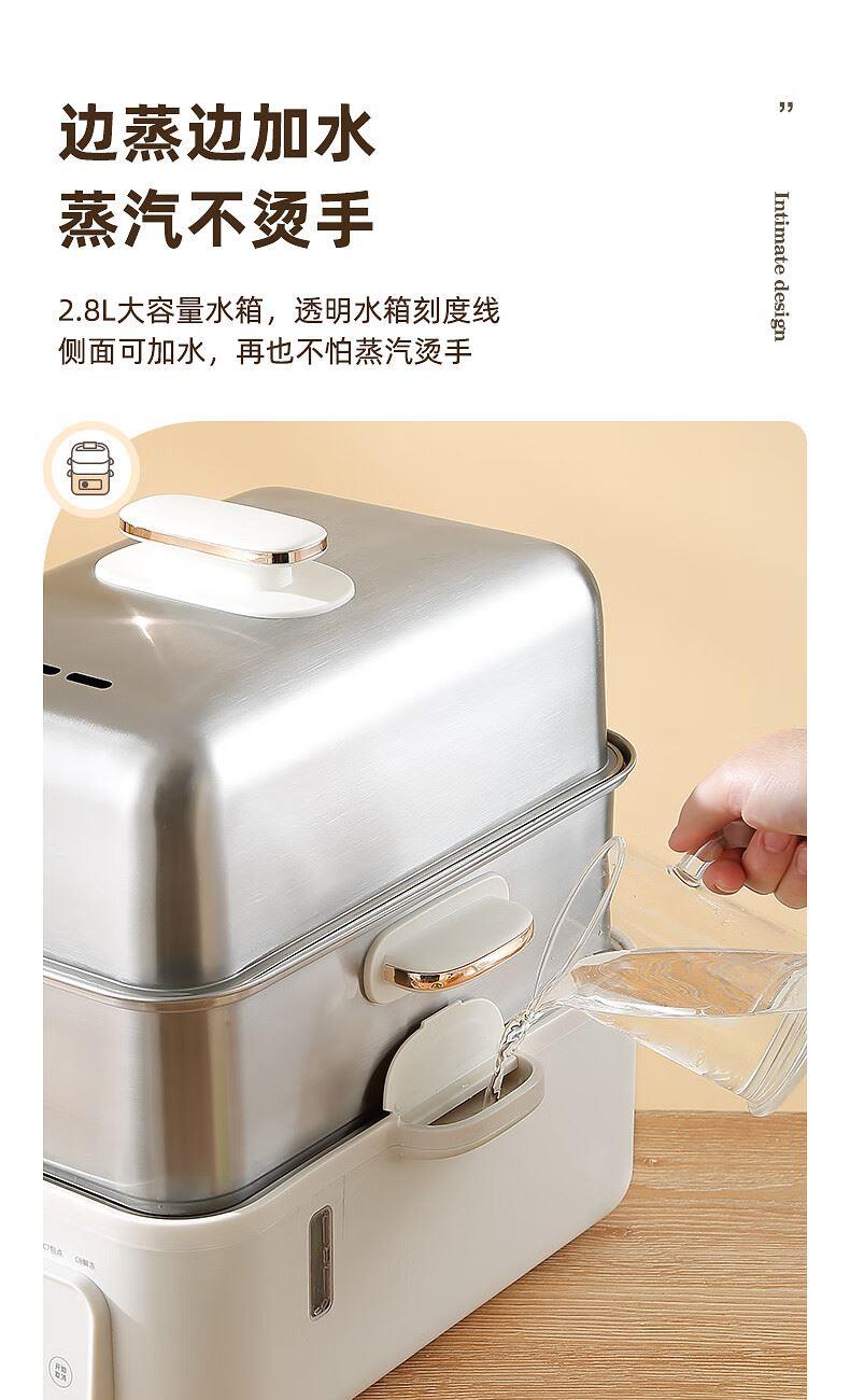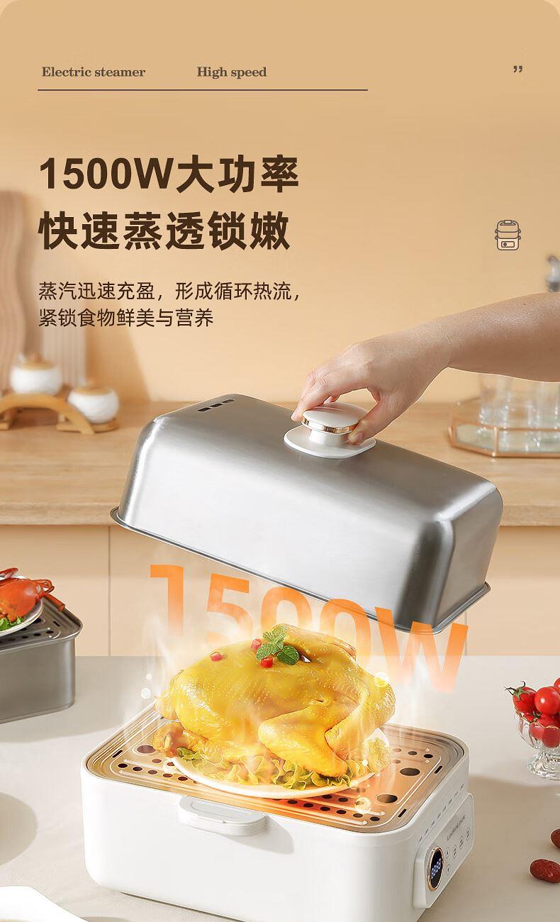 功率:1500W 电压:220V 容量:16L 毛重:5.2Kg 材质:外壳PP+304不锈钢层架+304底盘 彩盒包装尺寸:425*325*330mm 外箱包装尺寸:440*340*335mm 推荐理由: 1、304不锈钢蒸屉久蒸无异味不变形 2、电解抛光工艺,无抛光蜡残留 3、双重智能防干烧,缺水断电 4、24H预约自动保温,定时免看管 5、聚能快速加热,食材鲜嫩 6、中途可边蒸边加水,2.8L大容量水箱