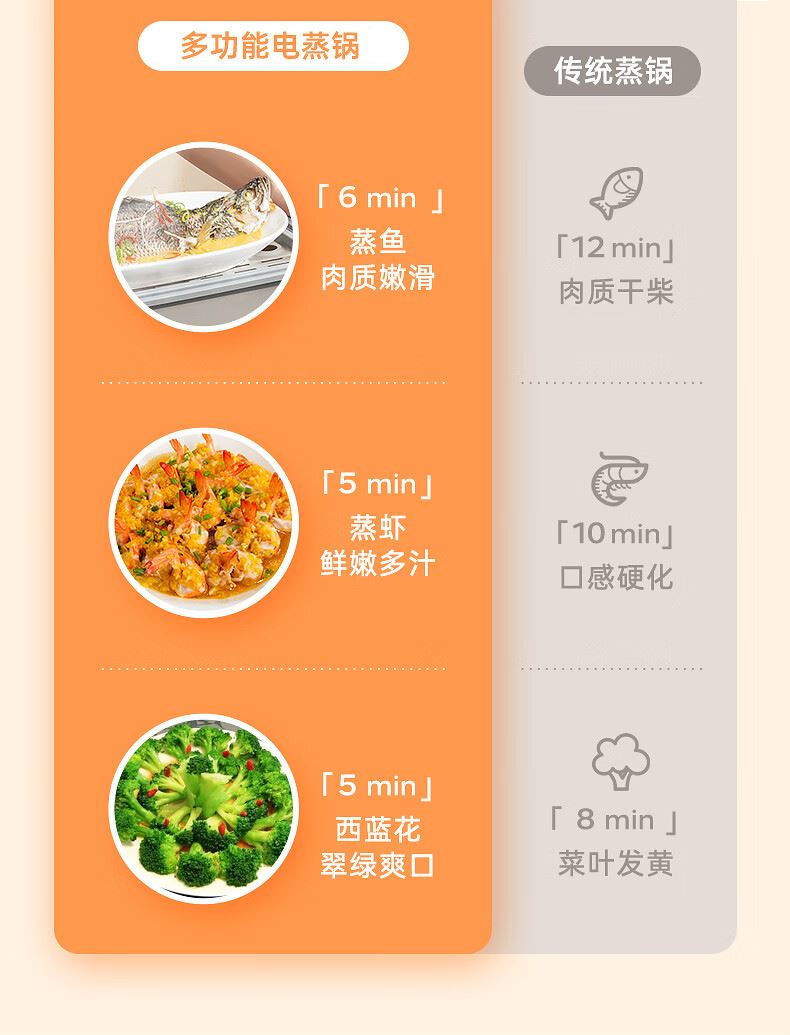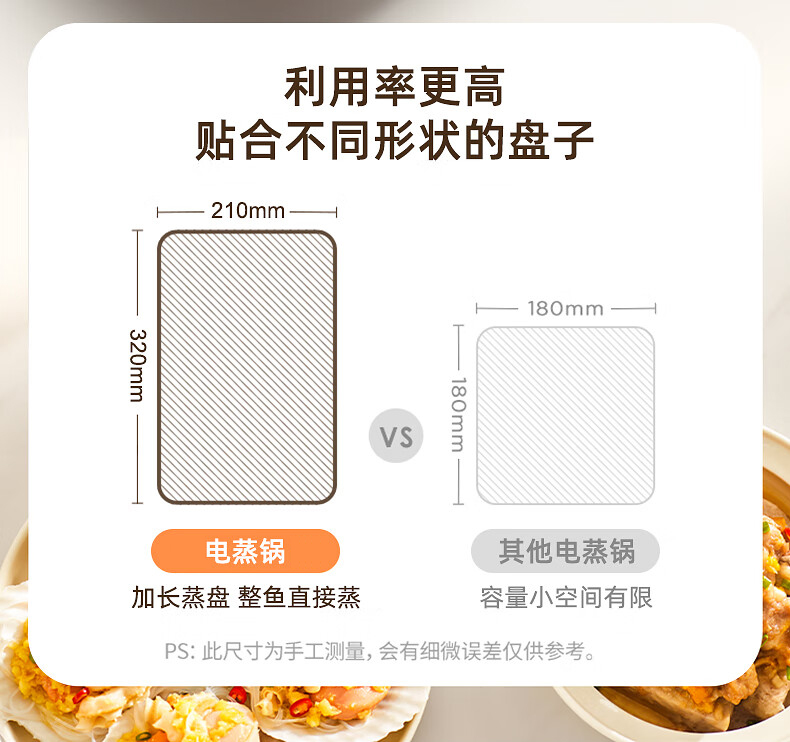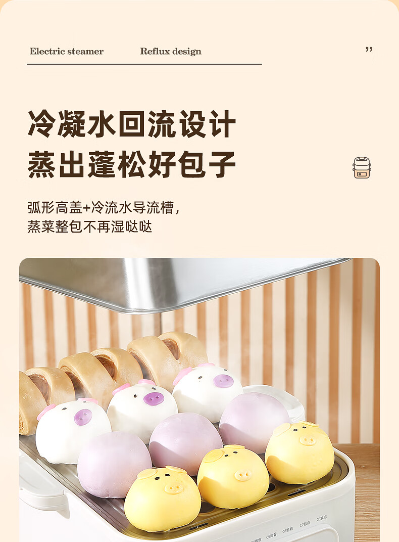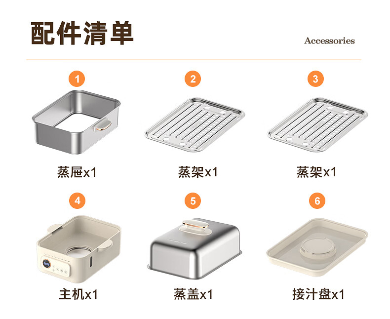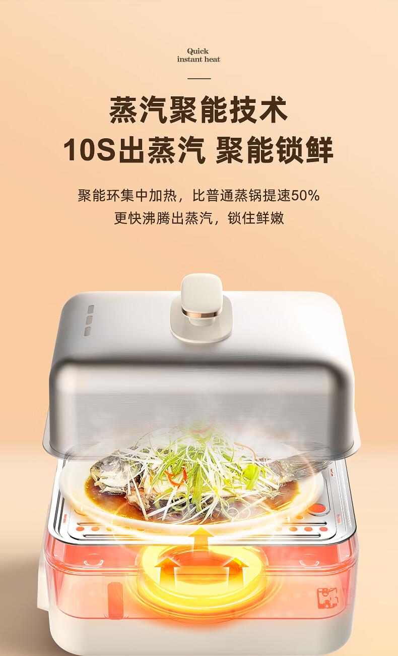 功率:1500W 电压:220V 容量:16L 毛重:5.2Kg 材质:外壳PP+304不锈钢层架+304底盘 彩盒包装尺寸:425*325*330mm 外箱包装尺寸:440*340*335mm 推荐理由: 1、304不锈钢蒸屉久蒸无异味不变形 2、电解抛光工艺,无抛光蜡残留 3、双重智能防干烧,缺水断电 4、24H预约自动保温,定时免看管 5、聚能快速加热,食材鲜嫩 6、中途可边蒸边加水,2.8L大容量水箱