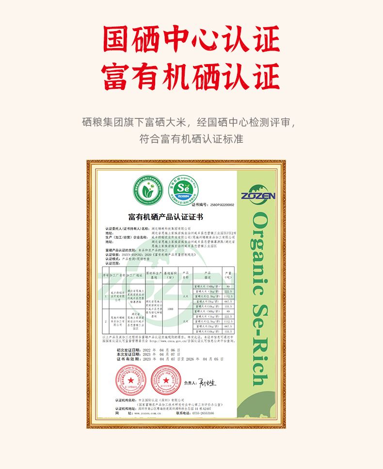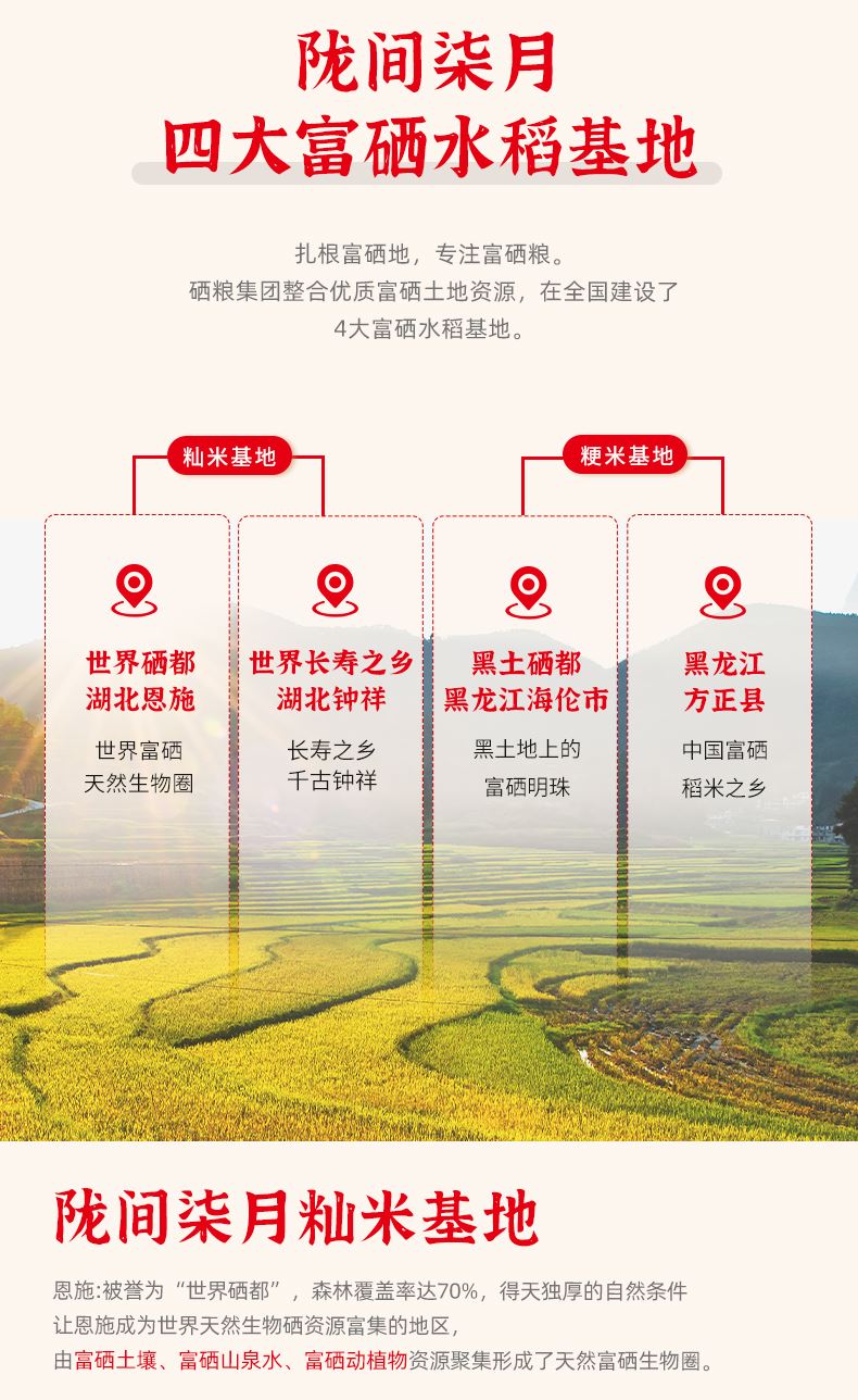 1、世界硒都,恩施原产,湖北省放心粮油企业出品; 2、一年一季,鲜稻现碾,生长周期长达7个月,真空包装,米香浓郁; 3、富有机硒认证,富有机硒,每100g平均硒含量≥20ug; 4、富硒大米营养价值高,科学补硒