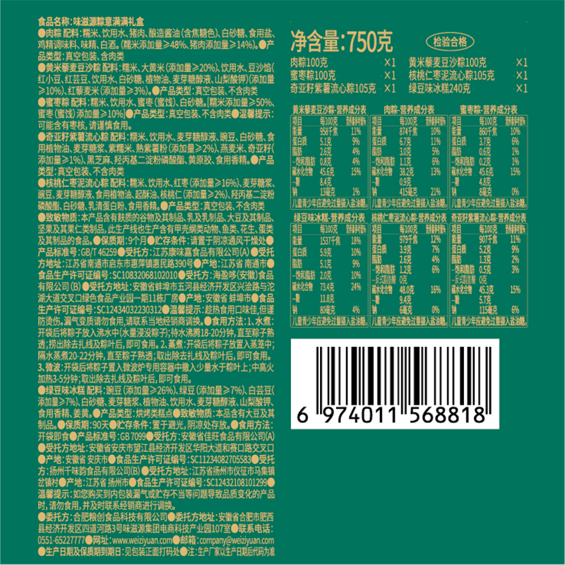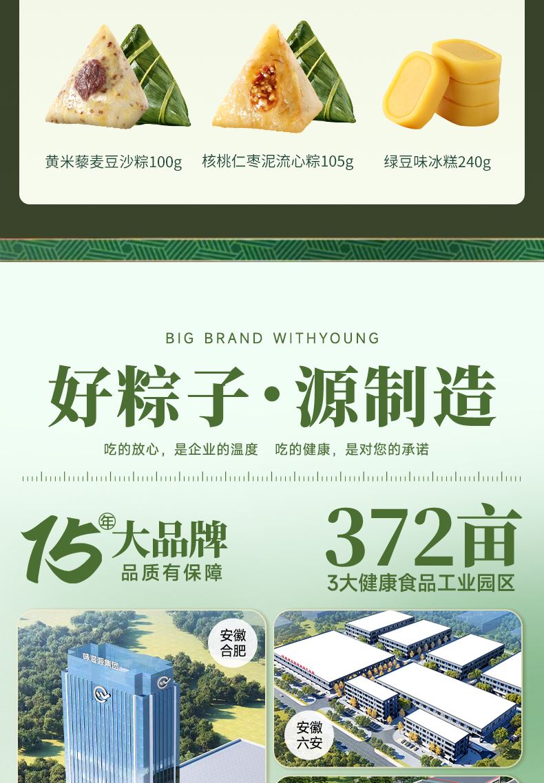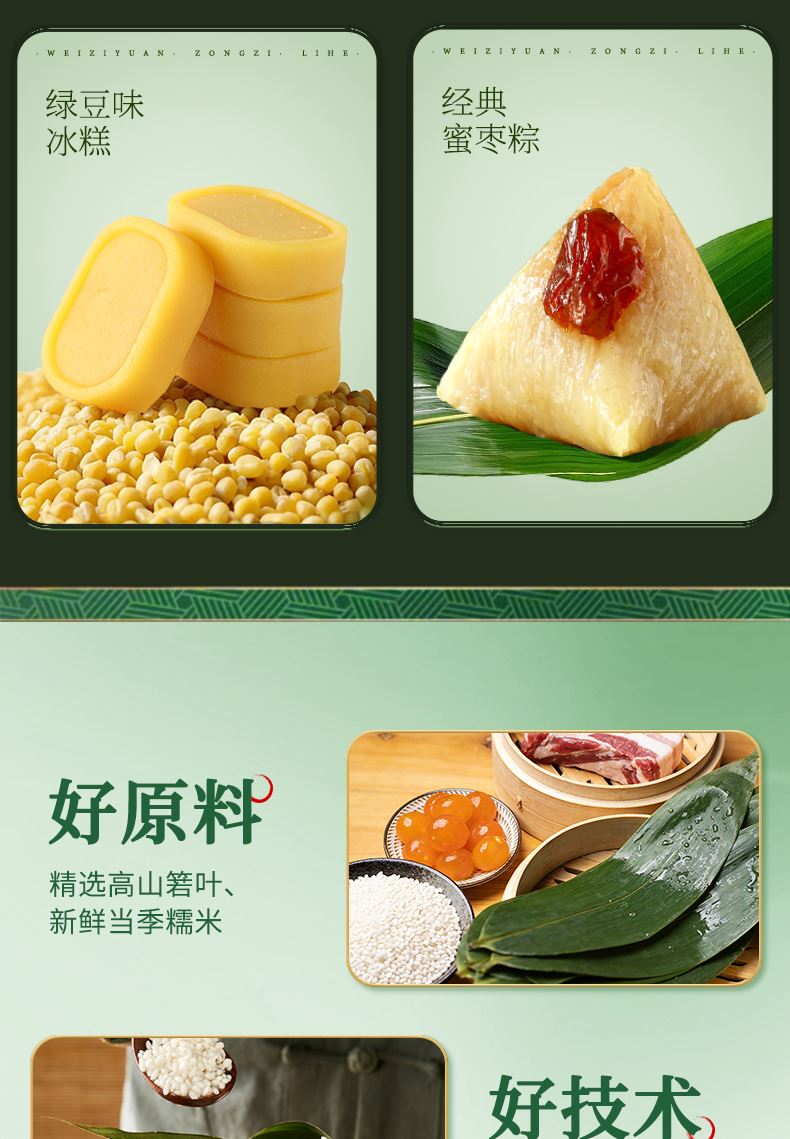 味滋源 鲜肉粽单枚100g 味滋源 黄米藜麦豆沙粽100g 味滋源 蜜枣粽单枚100g 味滋源 核桃仁枣泥流心粽105g 味滋源 奇亚籽紫薯流心粽105g 味滋源 绿豆冰糕240g