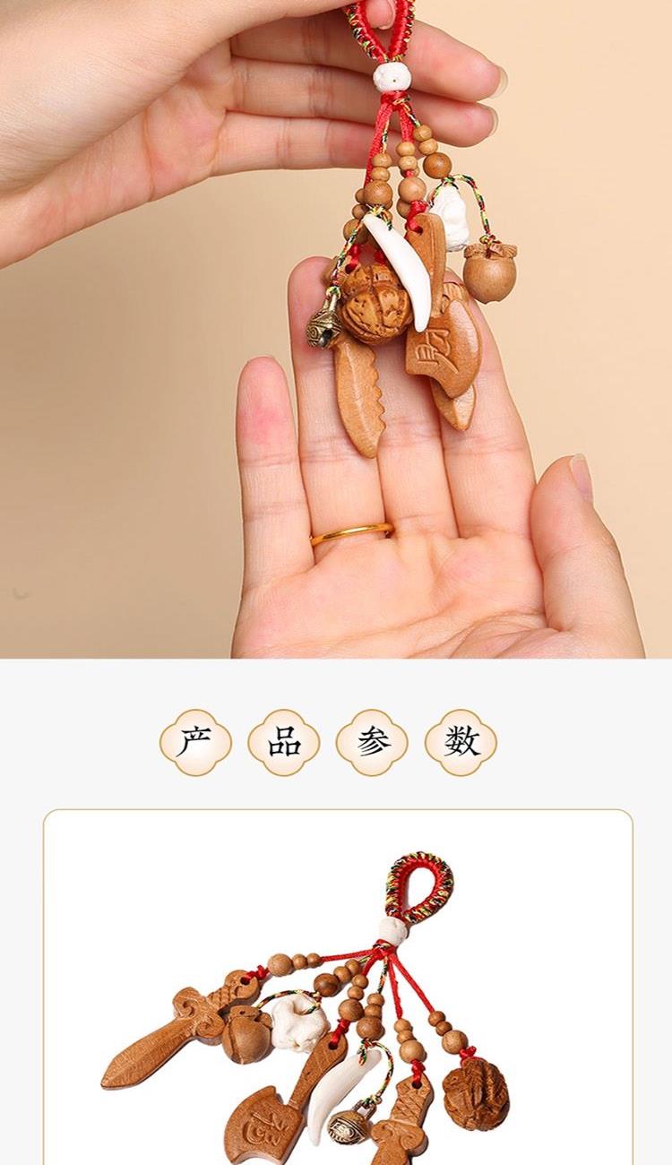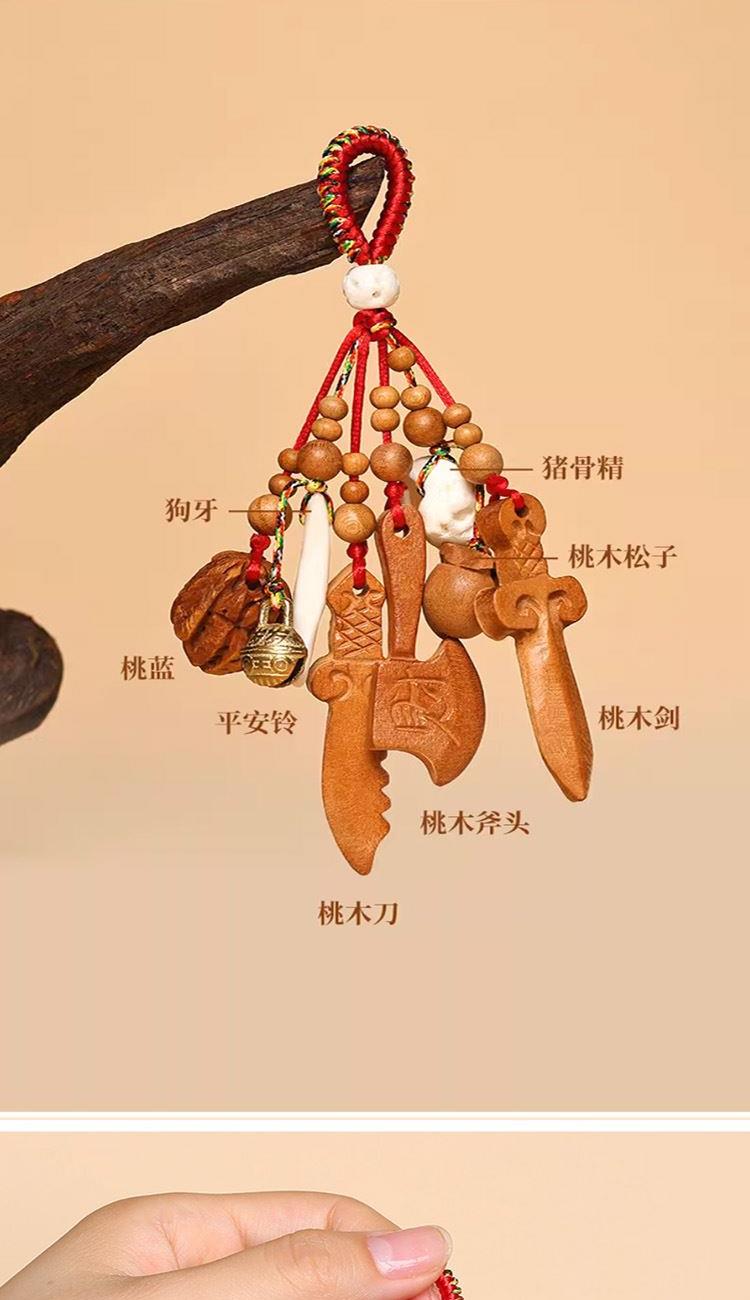双重辟邪,万煞不侵: 老桃木从材质上提供强大的辟邪能量,如同一位法力高强的法师;而五帝钱则凭借其盛世皇气,专门负责抵挡和化解各种煞气。两者结合,形成了无可匹敌的防护组合,寓意着为家庭或个人建立一个坚不可摧的保护磁场,强力抵御一切负面能量和邪祟的侵扰。 家宅安宁,运势昌隆: 悬挂于家中或车内,象征着净化整个环境的磁场,保佑家人身体健康,家庭和睦,运势兴旺。