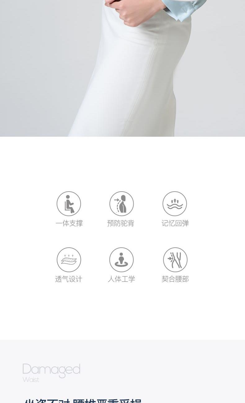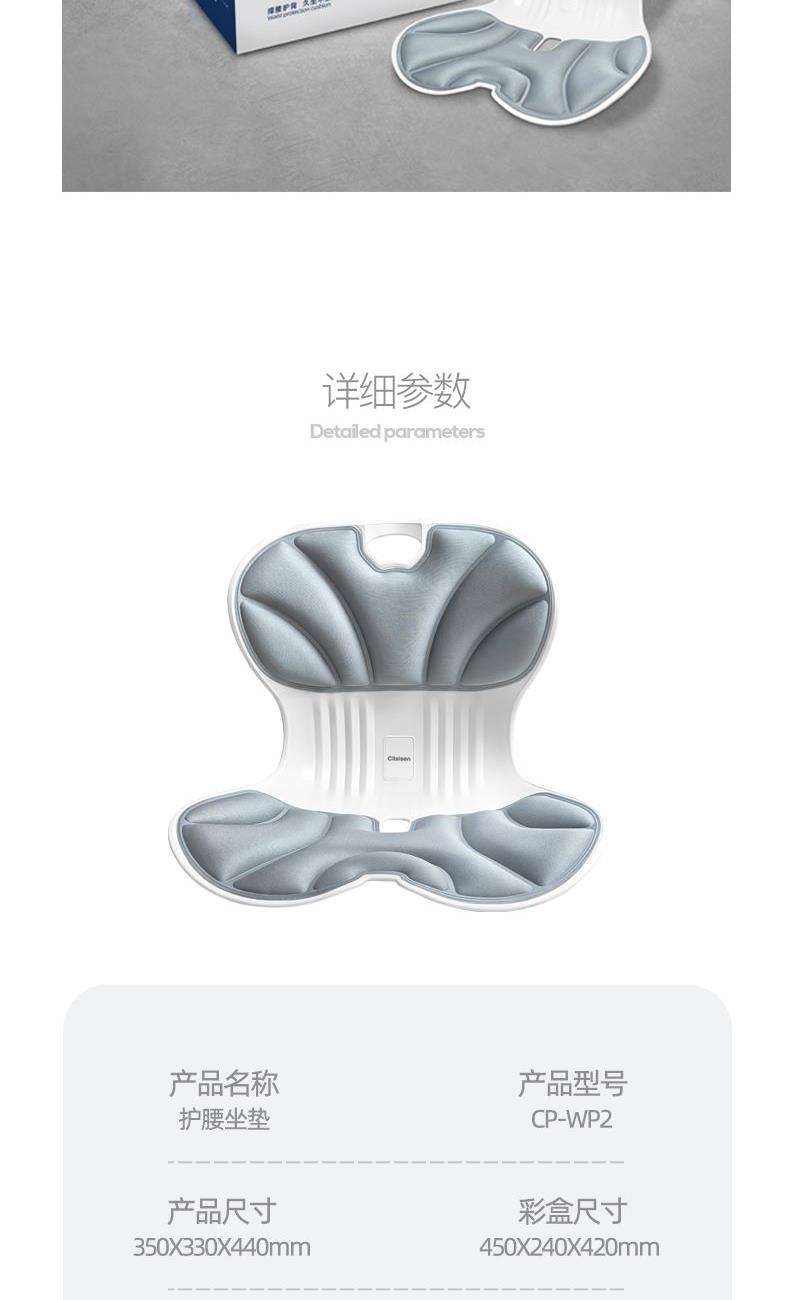产品参数: 产品型号:CP-WP2 产品颜色:白色+灰色 主要材料:PP+记忆棉 产品尺寸 : 350X330X440mm 包装尺寸:450X240X420mm 商品条码 : 6972831861201 产品毛重 : 1.6kg 执行标准:GB/T32487-2016 包装清单:护腰坐垫X1 核心卖点: 1、杠杆原理设计黄金分割比例 2、人体工学设计,久坐不累的秘密 3、无缝贴合腰背,辅助矫正坐姿 4、分区支撑,系统均衡释压 5、顶腰护臀护脊 随便靠,全天舒适支撑 6、通风设计,轻柔触感 久坐不闷 7、一体成型,稳固承重