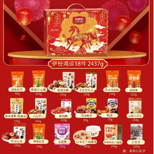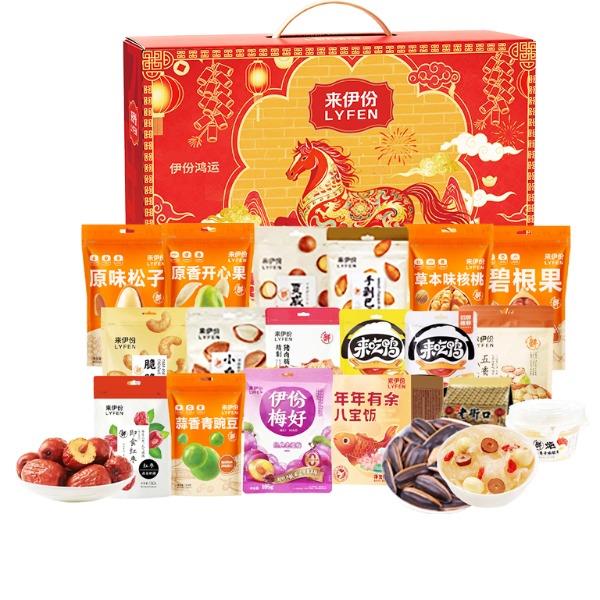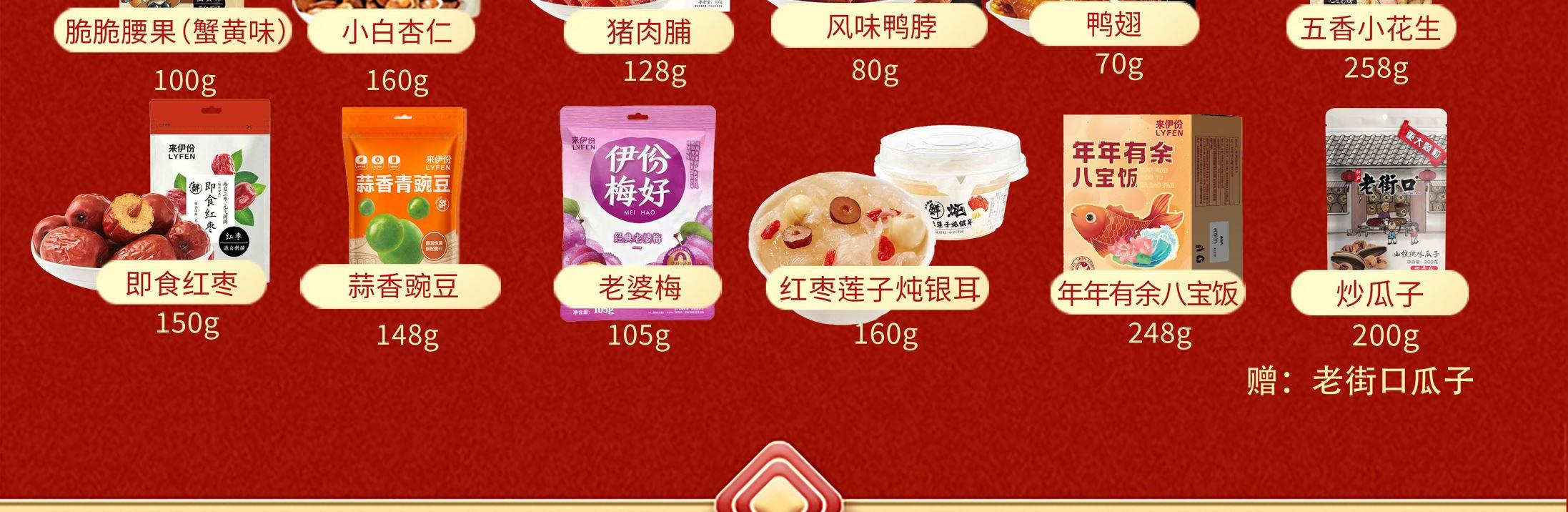 来伊份作为上市企业 产品线非常丰富,强调“新鲜”零食作为保障 产品设计贴心,方便携带 礼盒尺寸:410*290*180mm 内容物:原味松子 88g 原香开心果100g 夏威夷果100g 手剥巴旦木120g 草本味核桃150g 碧根果100g 脆脆腰果100g(蟹黄味) 小白杏核160g 猪肉脯100g 风味鸭脖80g 鸭翅70g 五香小花生258g 即食红枣150g 蒜香青豆148g 老婆梅105g 红枣莲子炖银耳160g 年年有余八宝饭248g 赠:老街口瓜子200g