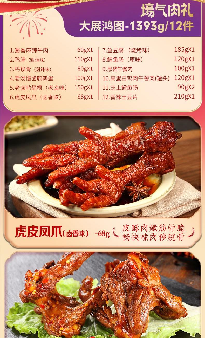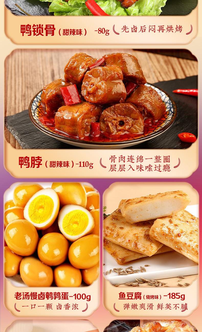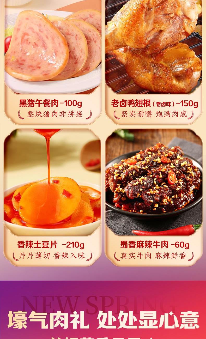 礼盒尺寸mm(长*宽*高):400*135*290 内配:蜀香麻辣牛肉60g 鸭脖 110g(甜辣味) 鸭锁骨(甜辣味)80g 老汤慢卤鹌鹑蛋-100g 老卤鸭翅根(老卤味)150g 虎皮凤爪(卤香味)68g 鱼豆腐 185g(烧烤味) 鳕鱼肠(原味)120g 黑猪午餐肉100g 高蛋白鸡肉午餐肉(罐头)120g 芝士鳕鱼肠 90g 香辣土豆片 210g