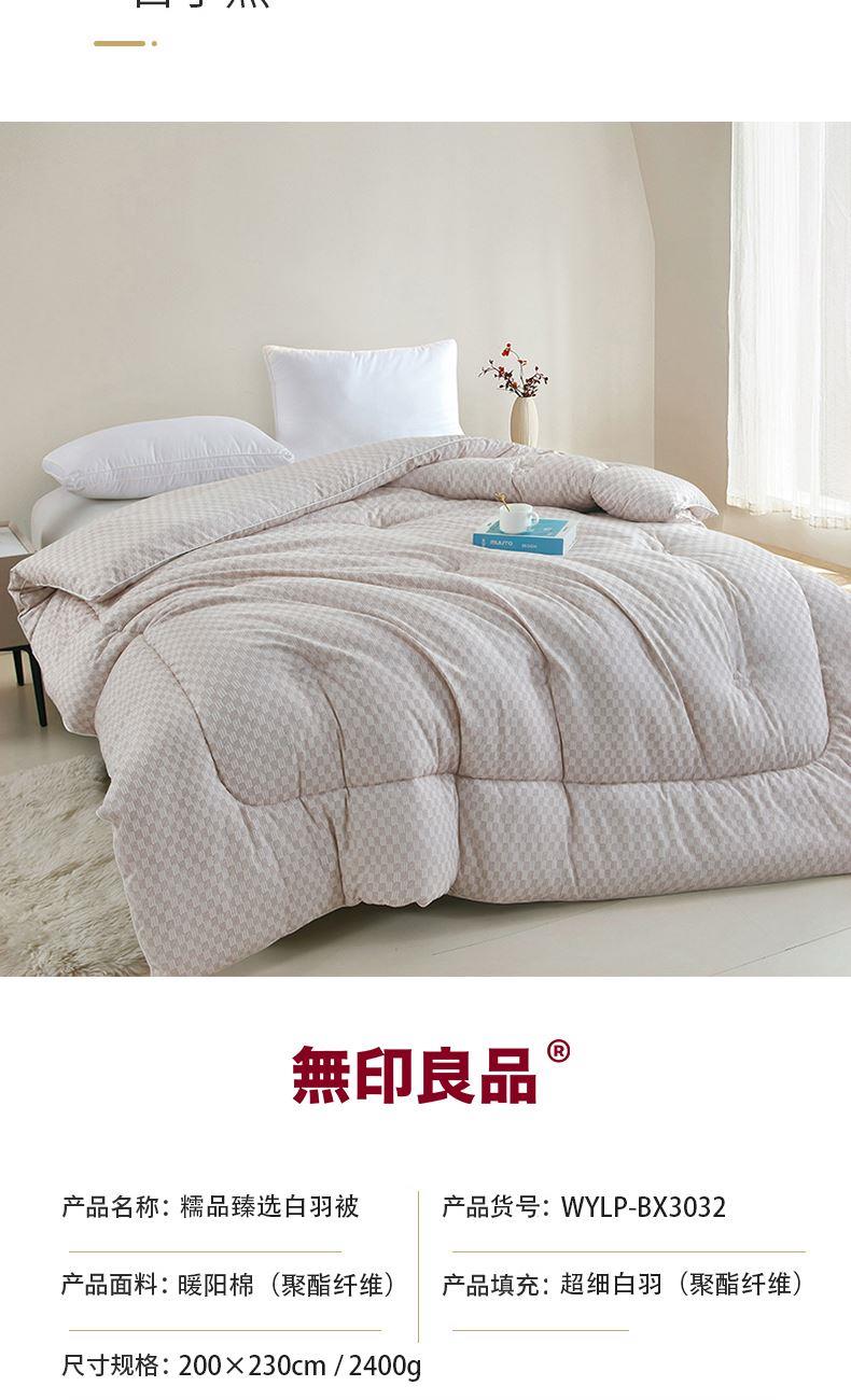 规 格:200×230cm 克重:2400g 面 料:暖阳棉(聚酯纤维) 填 充:超细白羽(聚酯纤维) “無印良品”大染无印,优良品质的产品是年轻人喜欢的,“無印”设计, 优雅 , 质朴 , 自然 , 是無印良品的初心与追求。让体验更舒适。享受简约健康生活,走进無印,上善若水,大爱无疆,创新让生活更精彩。