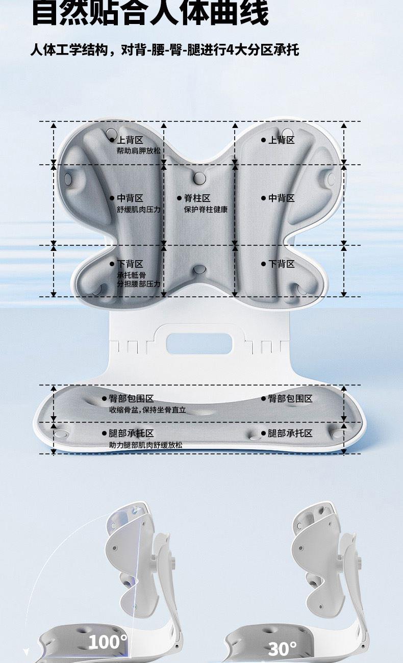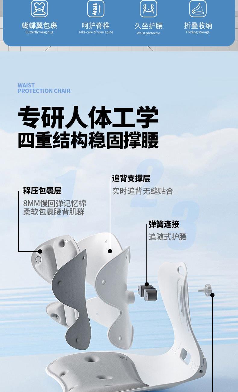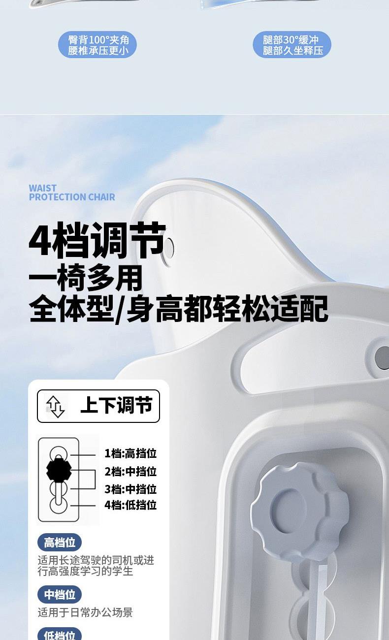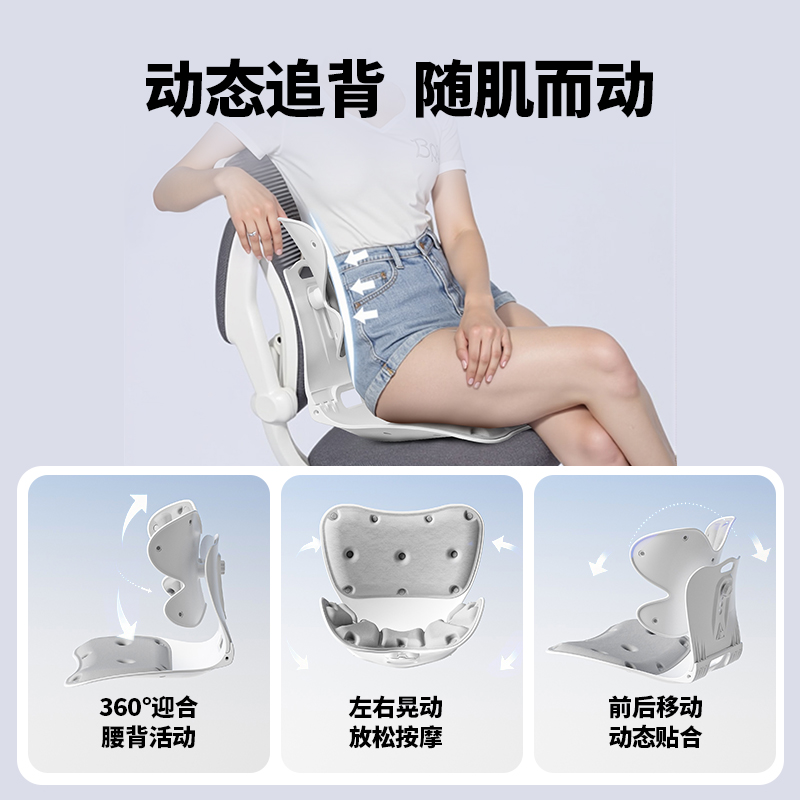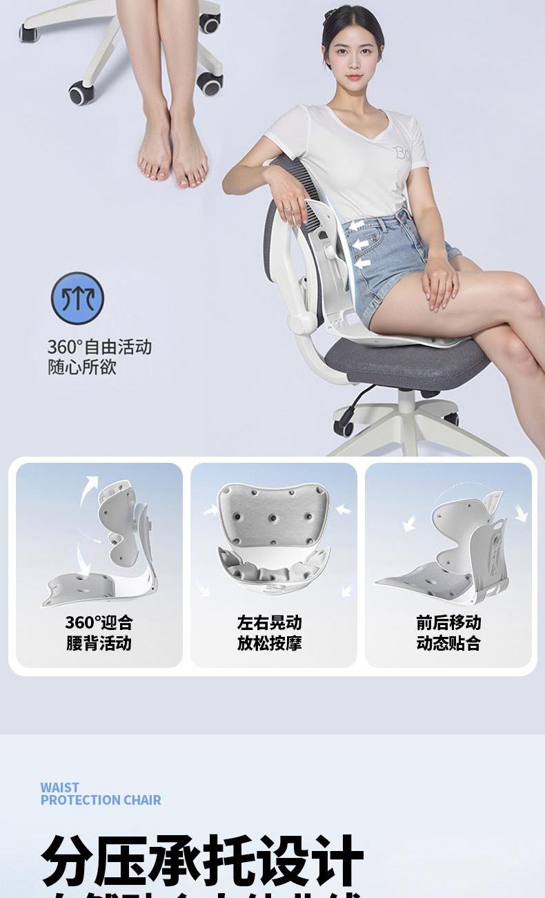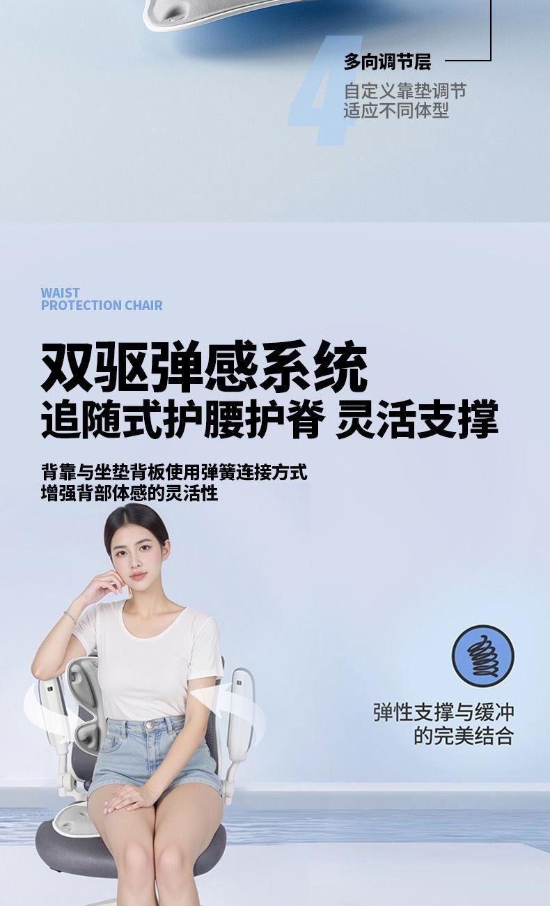 1、人体工学设计,四重结构稳固腰身 2、双驱弹感系统,追随式护腰护脊,灵活支撑 3、分压承托设计,自然贴合人体曲线 4、四档调节,一椅多用,全体型/身高都轻松适配 5、臀腿贴合支撑,缓解压力舒适提升