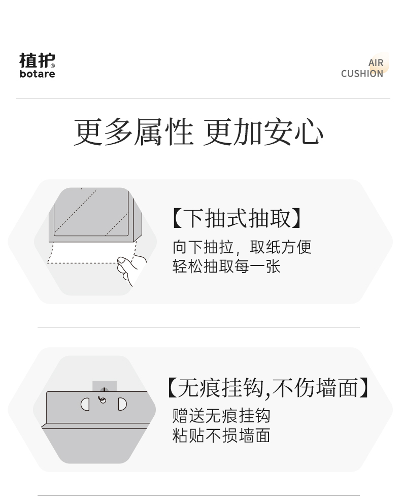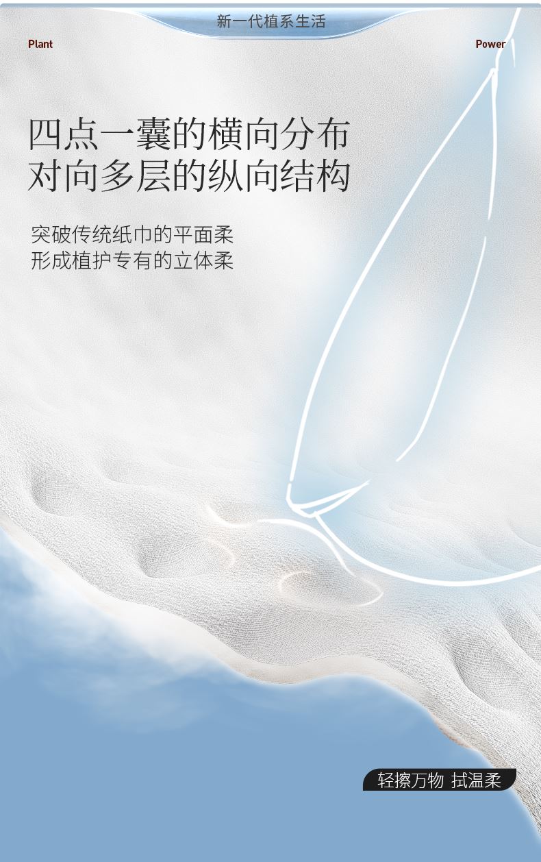 长短纤维物理方式科学配比颠覆传统纸巾手感柔触感升级,柔上加柔造出绵韧的亲肤触感;4、遇水柔韧 擦拭无屑