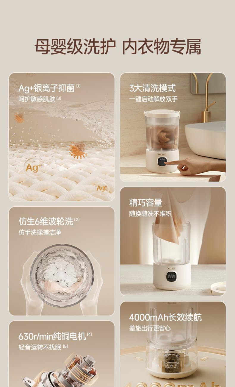 主要材质:ABS+硅胶提手 电压:7.4V 功率:25W 洗涤容量:0.1kg 电池容量:2000mAh 三种模式清洗,满足贴身衣物清洗需求 携带方便,家居旅行两不误 6维涡轮旋转,高效去除衣物污渍 换桶设计,洗衣桶能直拆,清洗方便 整机防水设计,防水汽防溅水 数码显示屏,运行更清晰 升级开盖提手,开盖更方便