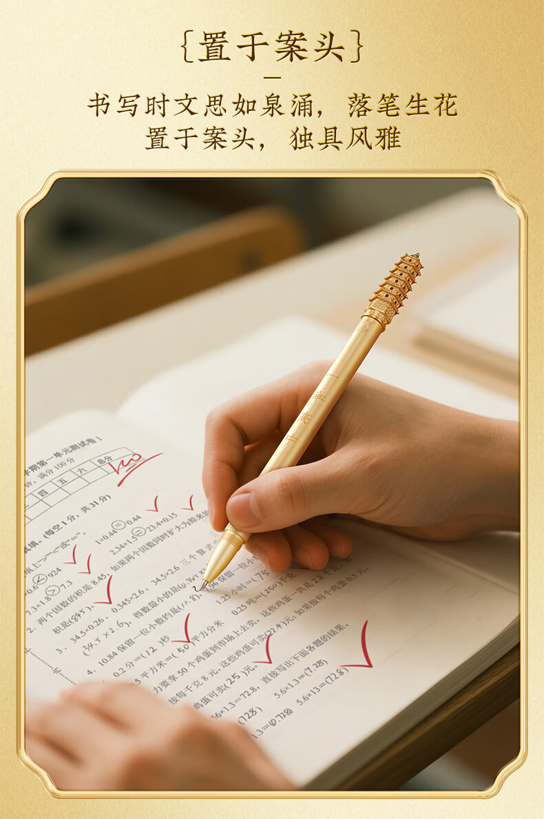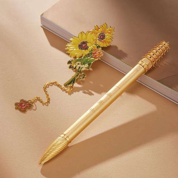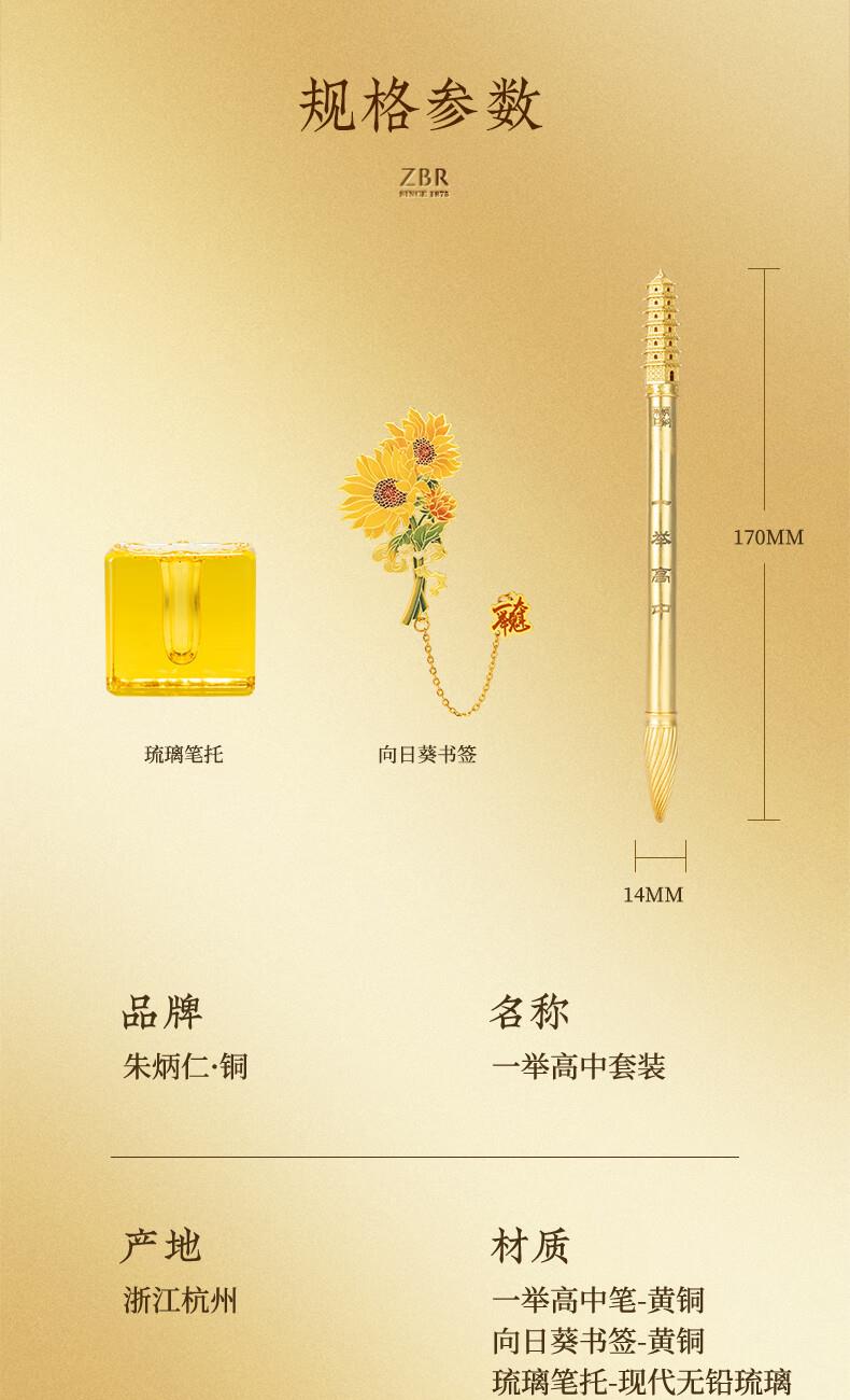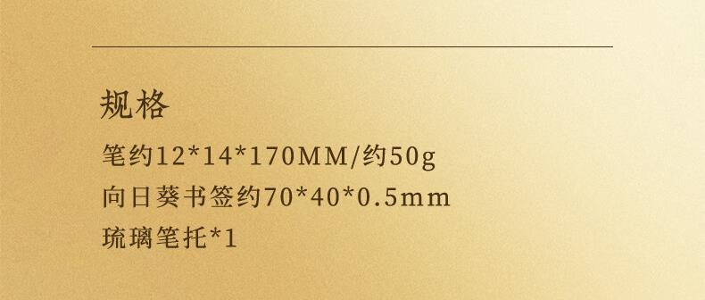 规格:一举高中笔约12*14*170MM/约50G*1 向日葵书签约70*40*0.5MM*1 琉璃笔托* 材质:一举高中笔/向日葵书签-黄铜 琉璃笔托-现代无铅琉璃