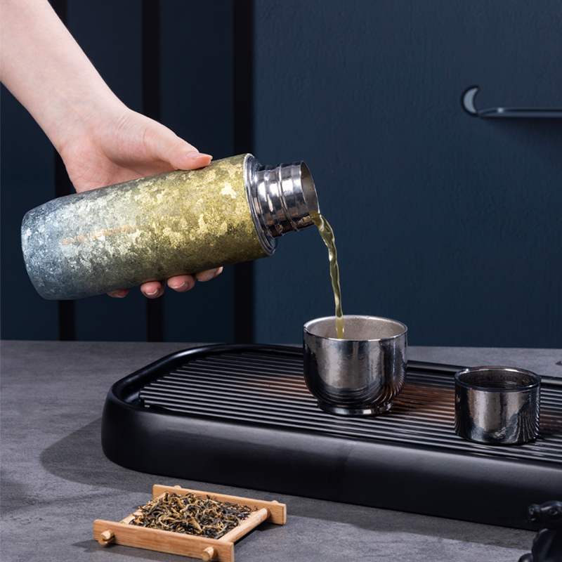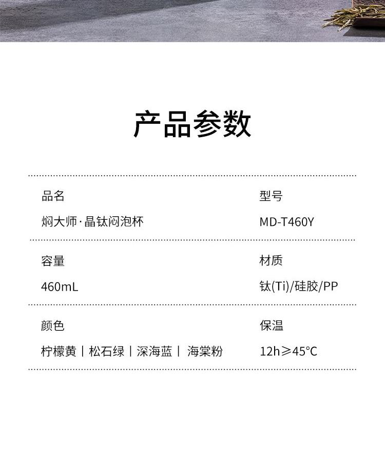 纯钛轻奢,品味之选 宝石肌理,手工打磨 内外纯钛,表里如一 磁吸瞬合,双盖锁鲜 外壳材质:纯钛(Titanium) 内胆材质:纯钛(Titanium) 茶漏材质:纯钛(Titanium) 塑 件:聚丙烯PP(食品接触用) 密 封 圈:食品接触用硅胶 保温效力:室温25℃条件下95℃满水容量测试12h≥45℃ 配 置:内外纯钛闷泡杯+纯钛茶漏 产品尺寸:213mm高*62mm底径 包装尺寸:275*180*96mm