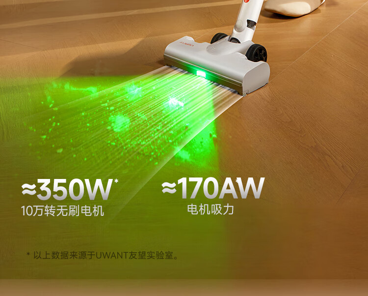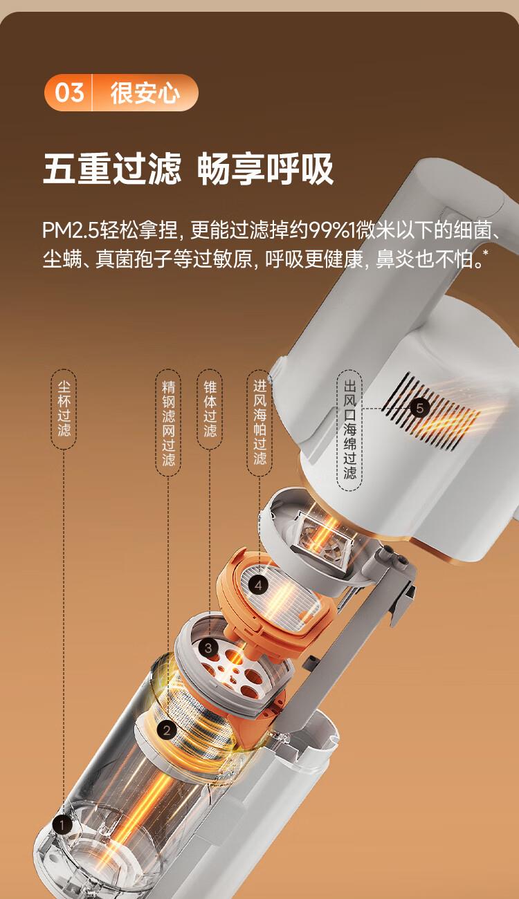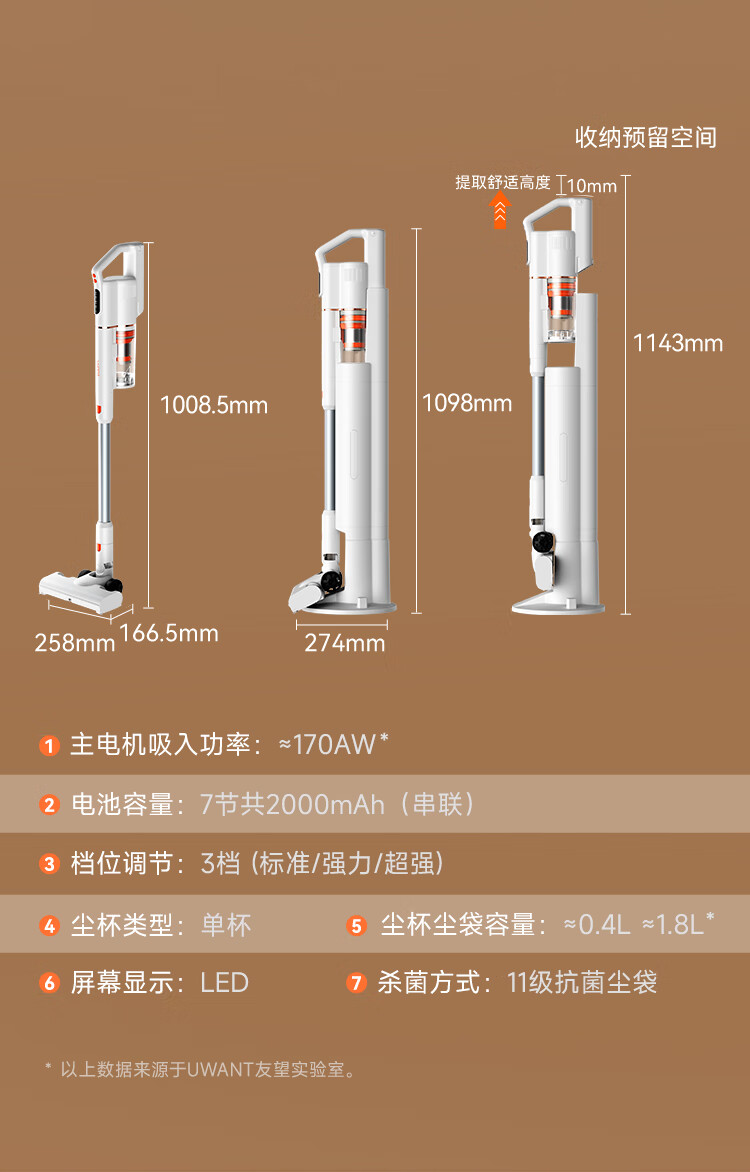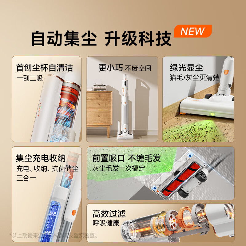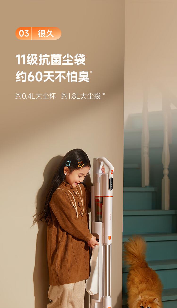 产品参数: 主电机吸入功率:170AW* 电池容量:7节共2000mAh(串联) 档位调节:3档(标准/强力/超强) 尘杯类型:单杯 屏幕显示:LED 尘杯尘袋容量:0.4L1.8L* 产品卖点: PM2.5轻松拿捏,更能过滤掉约99%1微米以下的细菌、尘螨、真菌孢子等过敏原,呼吸更健康,鼻炎也不怕。