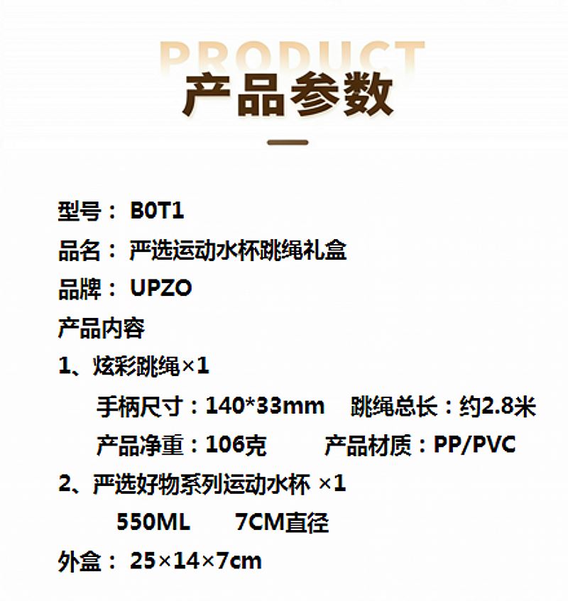 产品内容 1、炫彩跳绳×1 手柄尺寸:140*33mm 跳绳总长:约2.8米 产品净重:106克 产品材质:PP/PVC 2、严选好物系列运动水杯 ×1 550ML 7CM直径 外盒: 25×14×7cm 优良品质 结合春季踏青主题 优质伴手礼