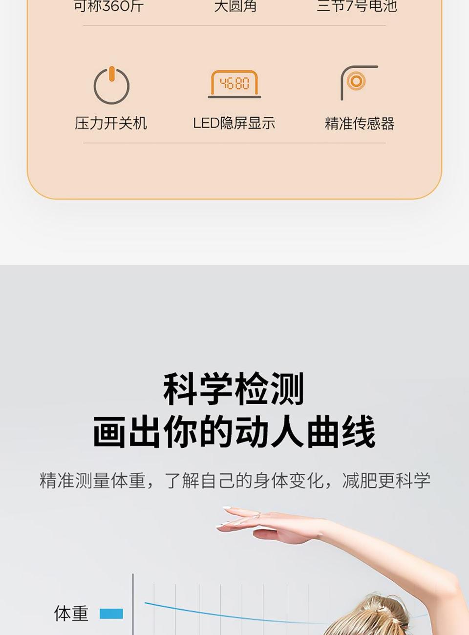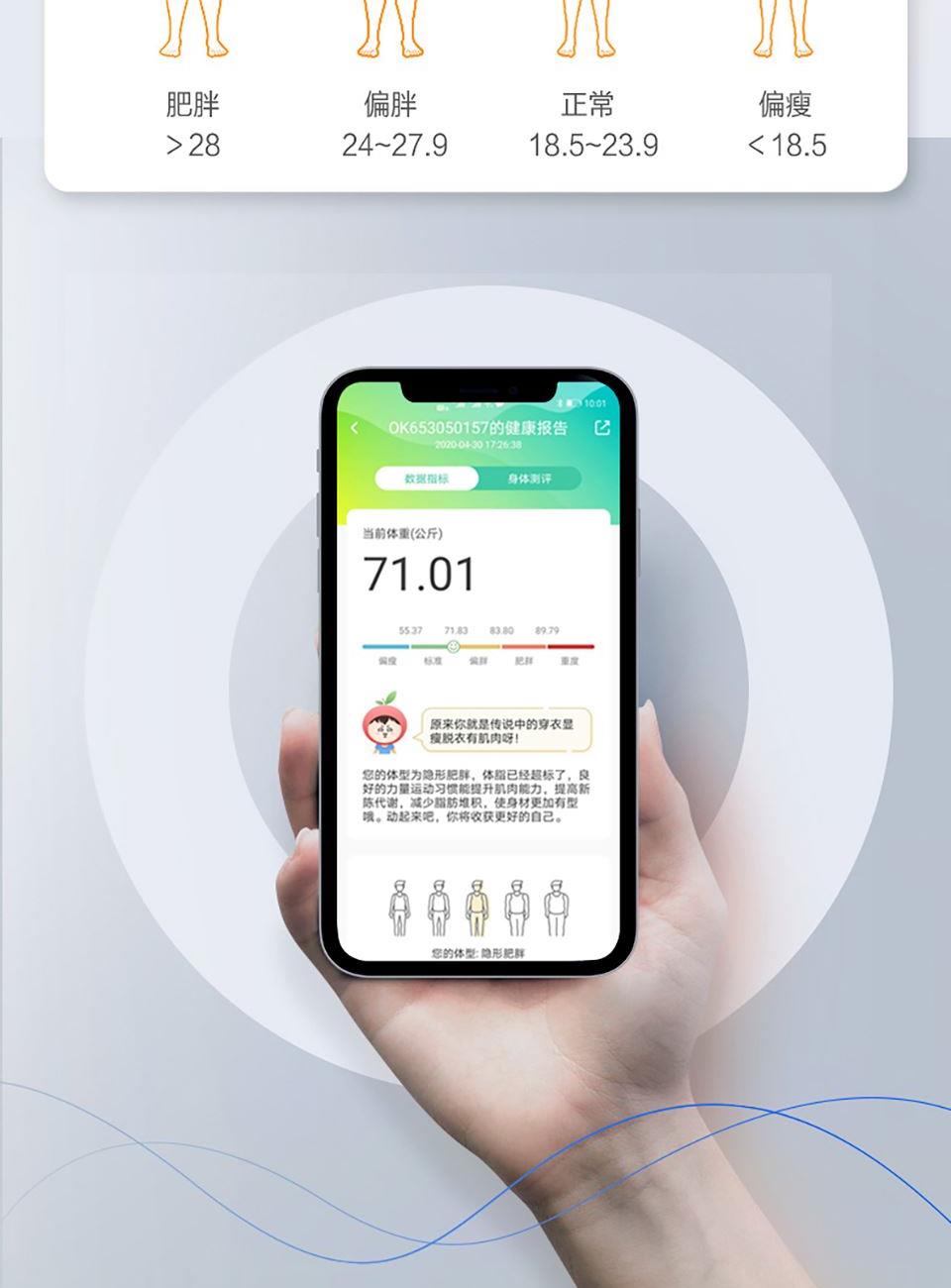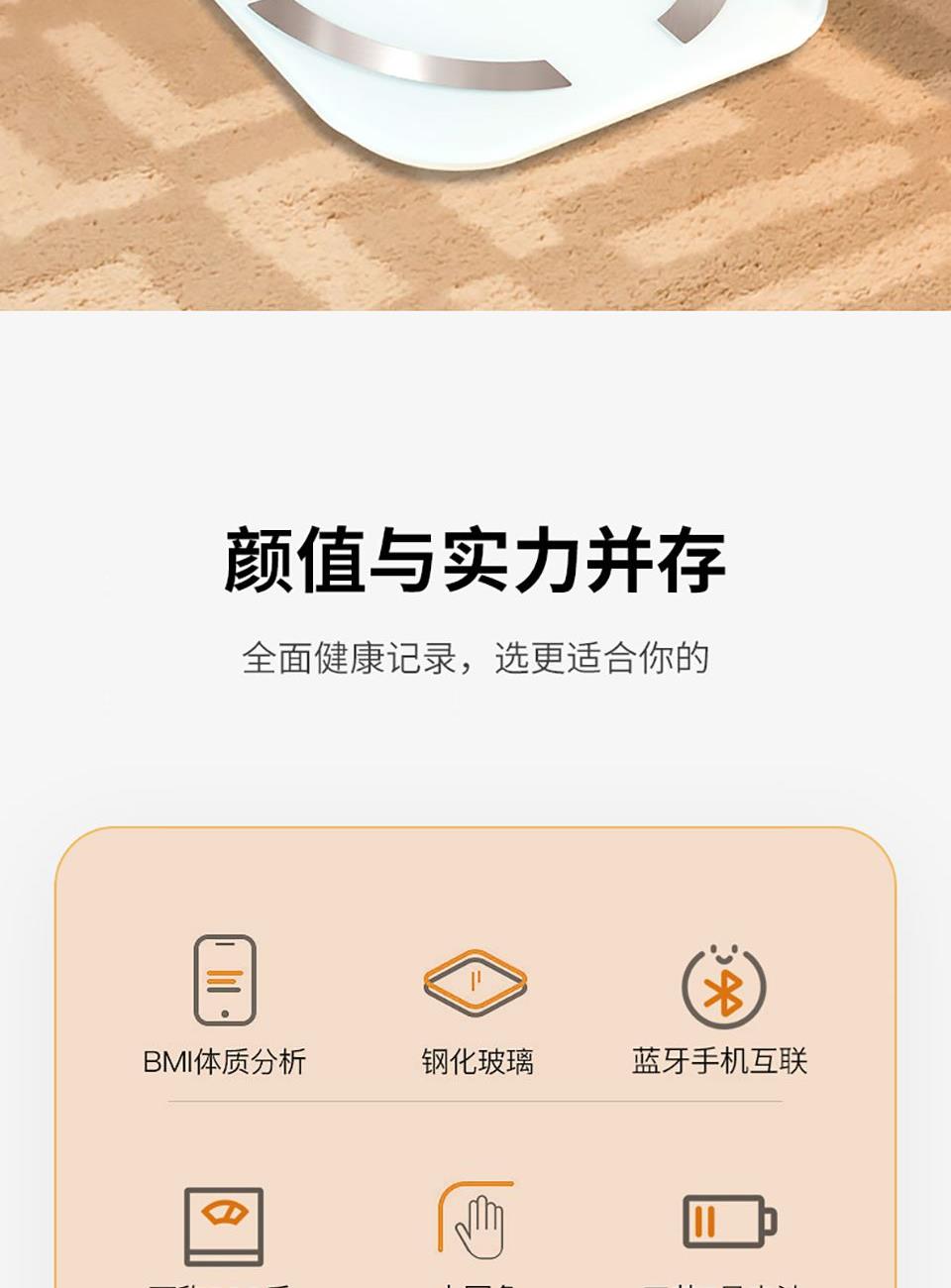 5、通过蓝牙连接手机app, ,支持蓝牙4.0及以上手机,智能测试体重、体脂率、脂肪重量、基础代谢、肌肉率、肌肉重量、内脏脂肪、水份、水含量、蛋白质、骨量、肥胖度、BMI、身体年龄、去脂体重、体型、身体得分等18项数据,并据此生成专属体质报告,给出健康建议。