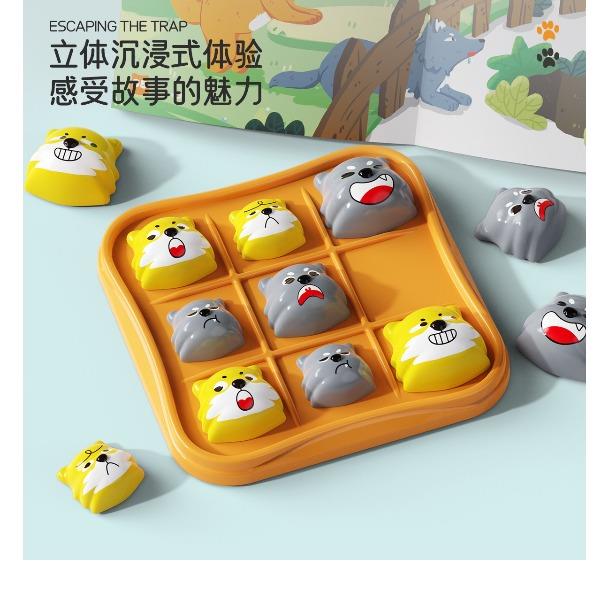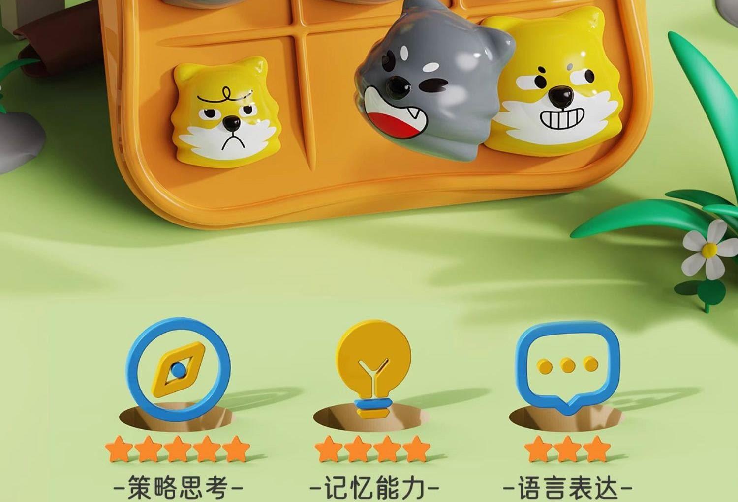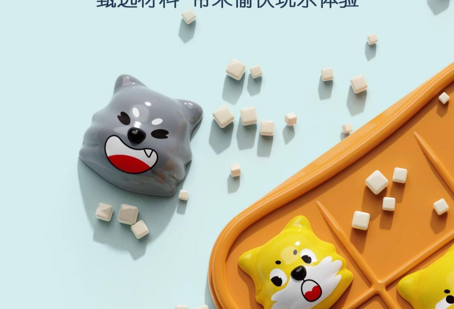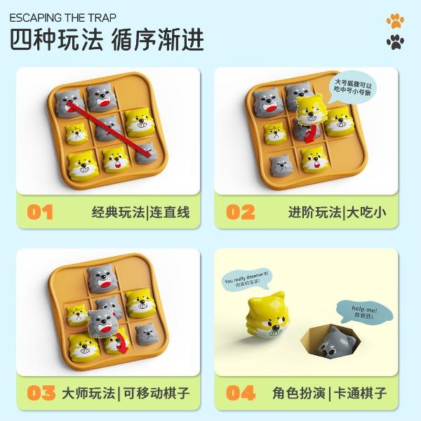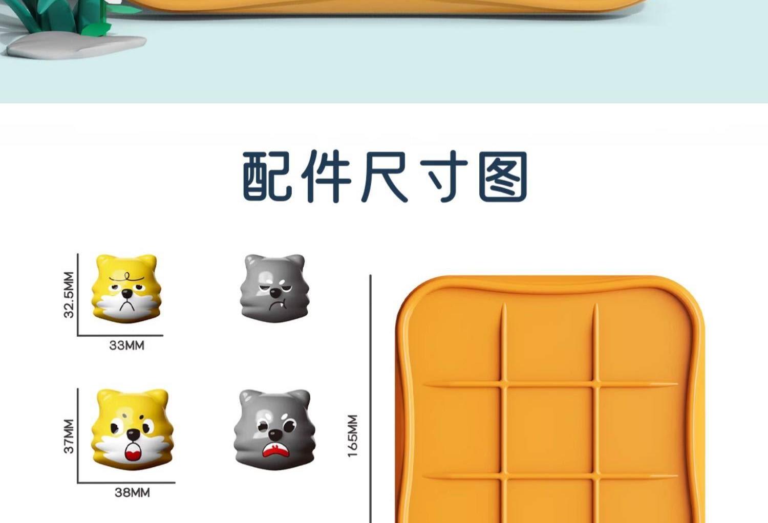 适用年龄:3+ 包装尺寸 (cm):17*5*17 产品尺寸 (cm):17*5*17 产品材质: 塑胶 包装方式: 彩盒 外箱尺寸 (cm):55*37*55 净重(kg):10.5 毛重(kg):12.1 箱量: 60 萌趣棋子演剧情,用小黄狗智斗大灰狼的趣味剧情,把传统棋类玩出新鲜感。4 种玩法进阶玩,双人对战嗨享亲子时光。