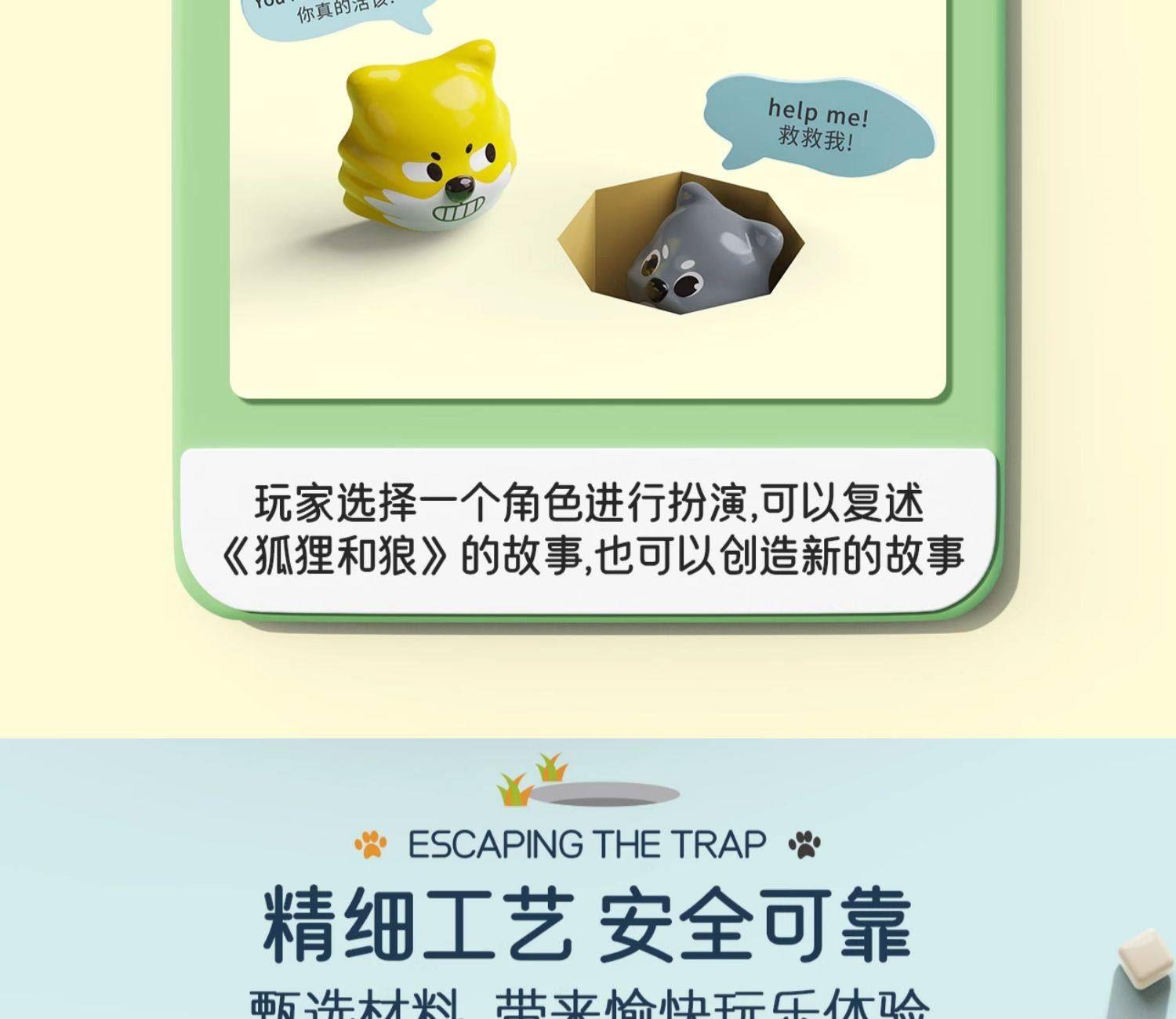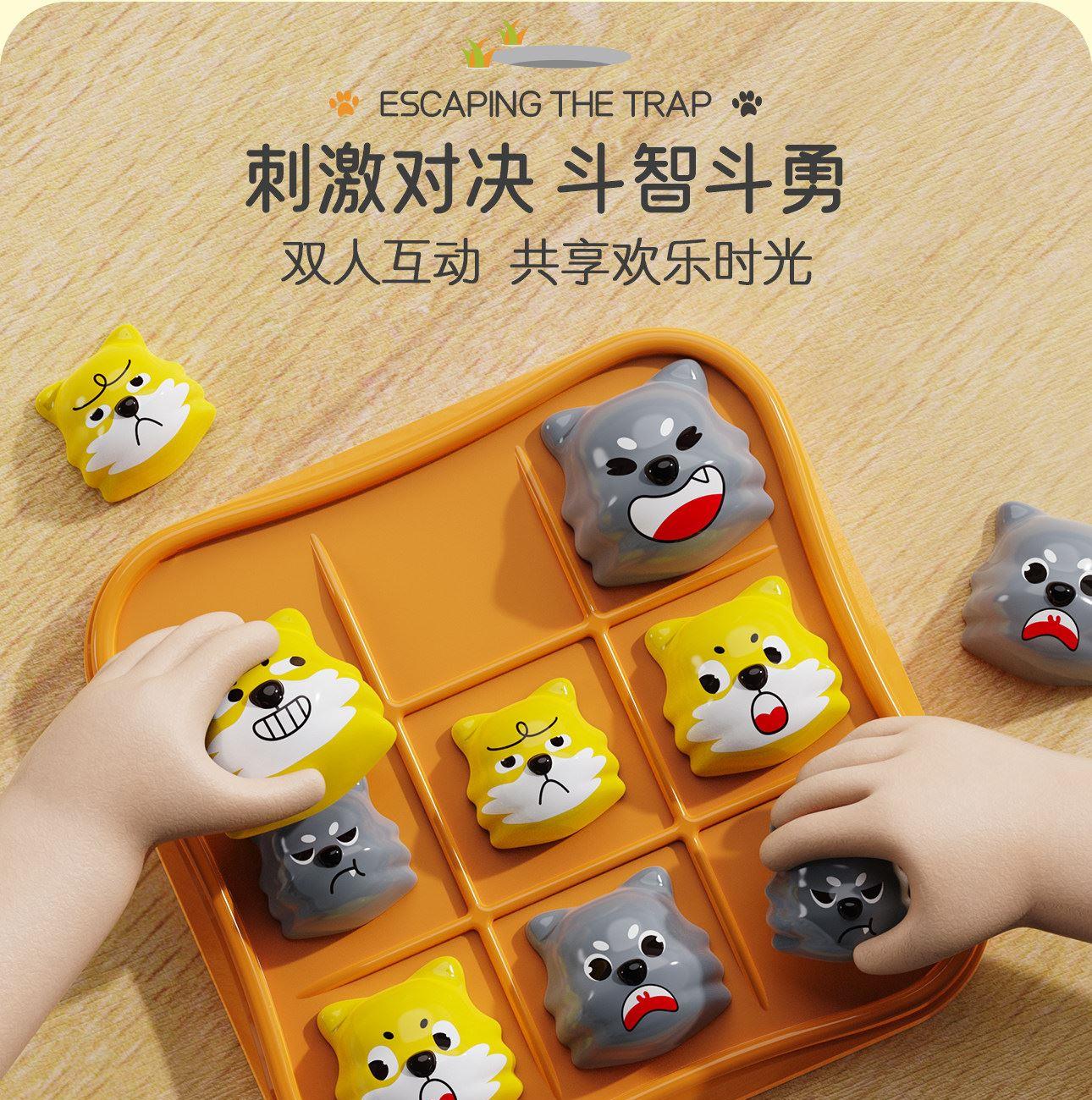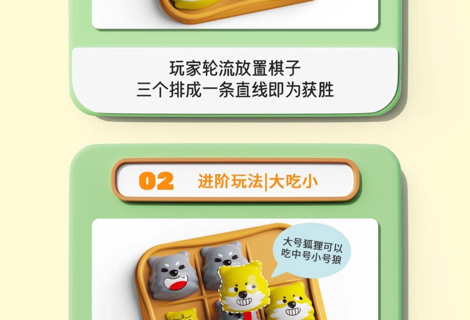 适用年龄:3+ 包装尺寸 (cm):17*5*17 产品尺寸 (cm):17*5*17 产品材质: 塑胶 包装方式: 彩盒 外箱尺寸 (cm):55*37*55 净重(kg):10.5 毛重(kg):12.1 箱量: 60 萌趣棋子演剧情,用小黄狗智斗大灰狼的趣味剧情,把传统棋类玩出新鲜感。4 种玩法进阶玩,双人对战嗨享亲子时光。