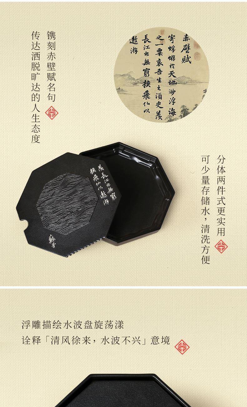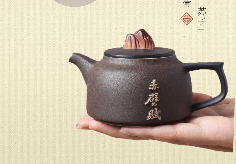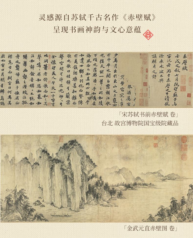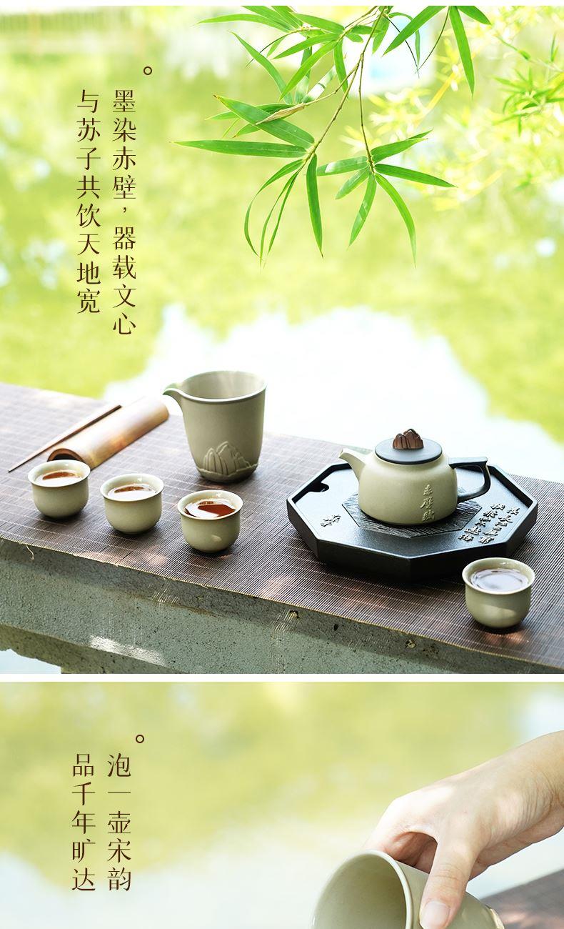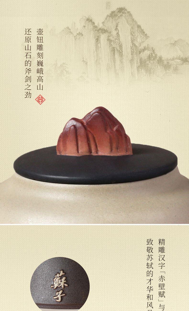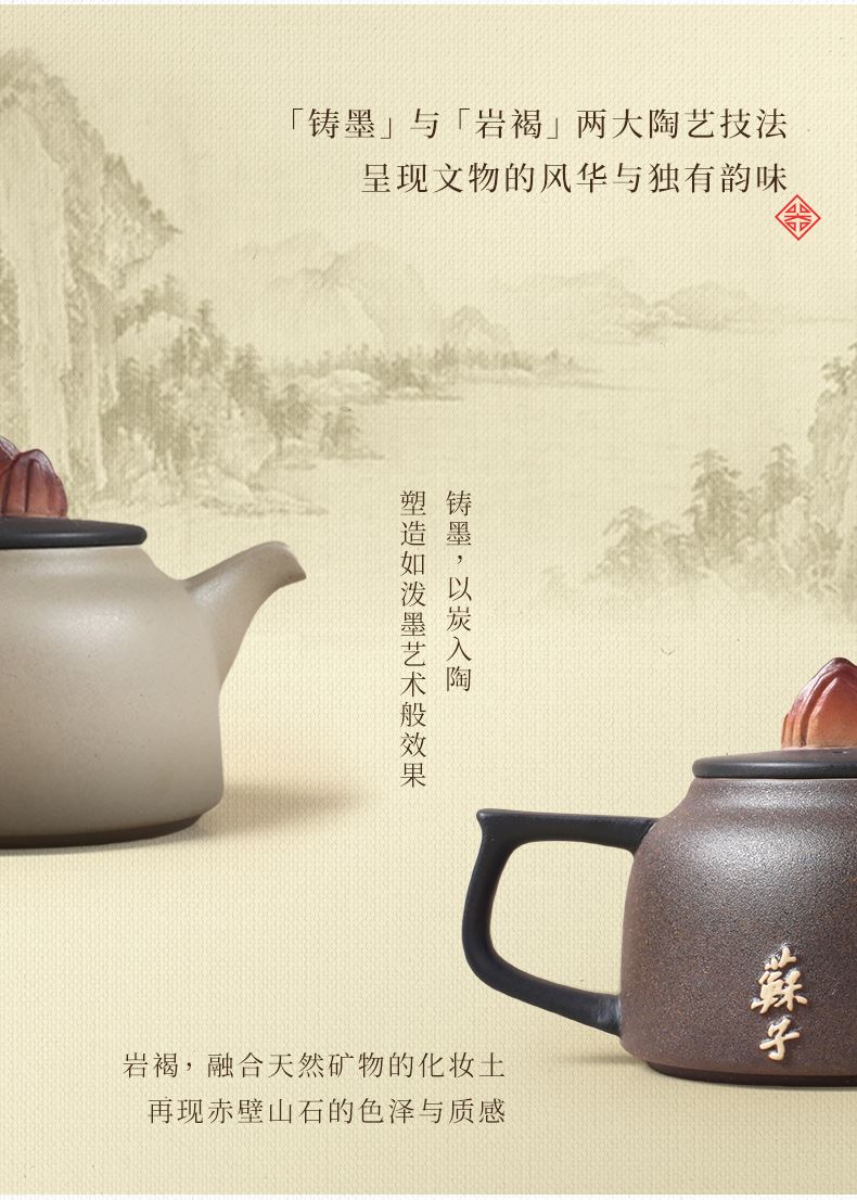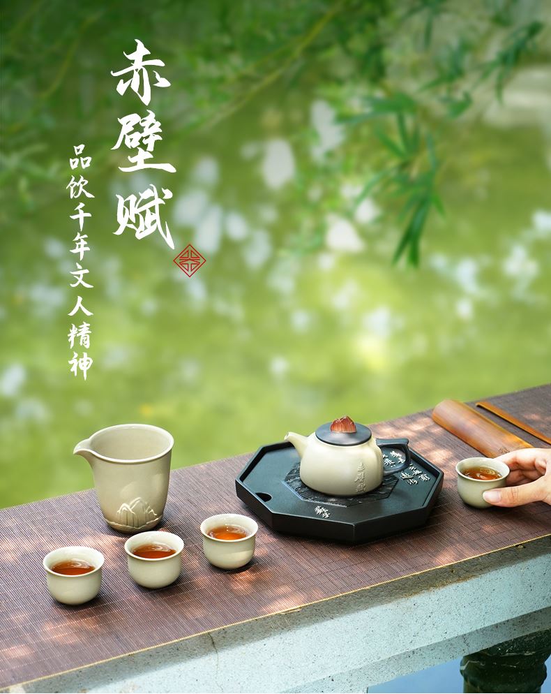 以炭入陶,塑造如泼墨艺术般效果,表现书法与水墨的无穷魅力,壶钮雕刻巍峨高山,还原画作中的山石的斧剑之劲,黑石壶把,触感温润,执壶省力,泡茶不烫手,茶海细致雕琢山岳与盘旋水纹展现赤壁的壮丽险奇,壶身精雕汉字「蘇子」向苏轼的才华和风骨致敬,壶承镌刻赤壁赋名句,传达洒脱旷达的人生态度,浮雕描绘水波盘旋荡漾