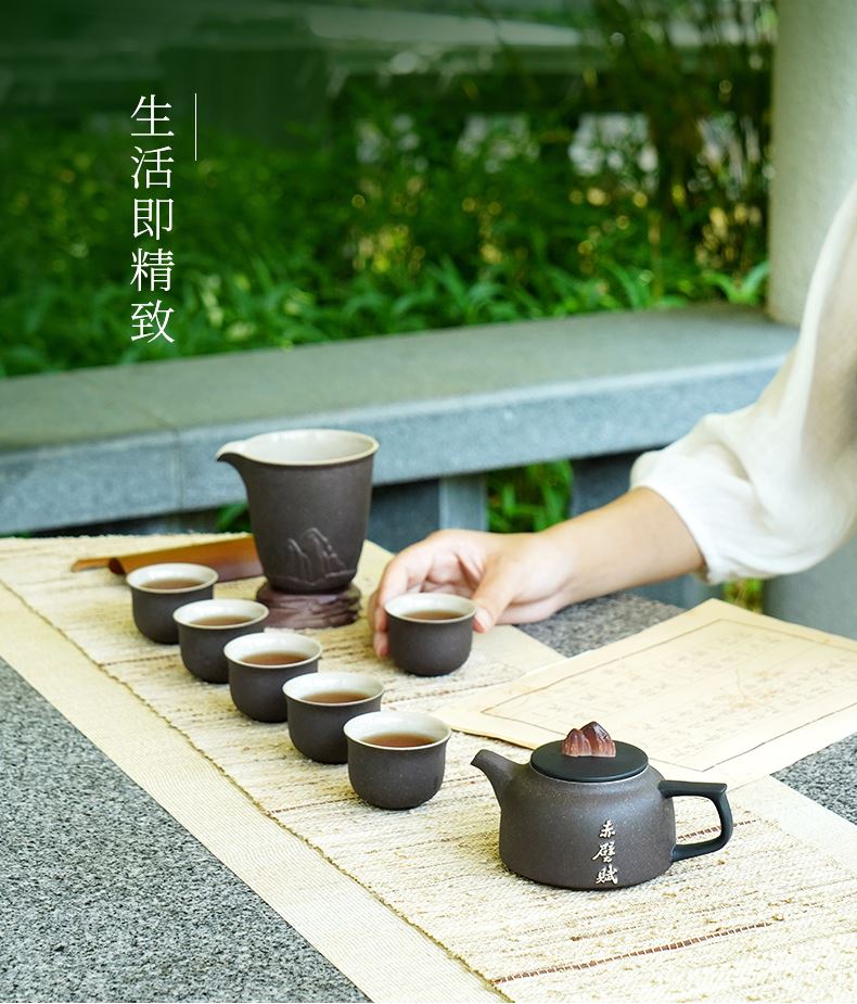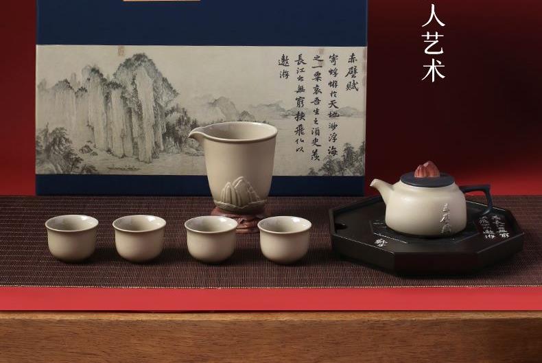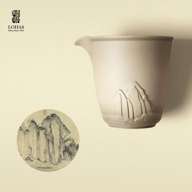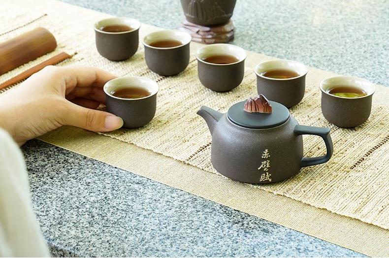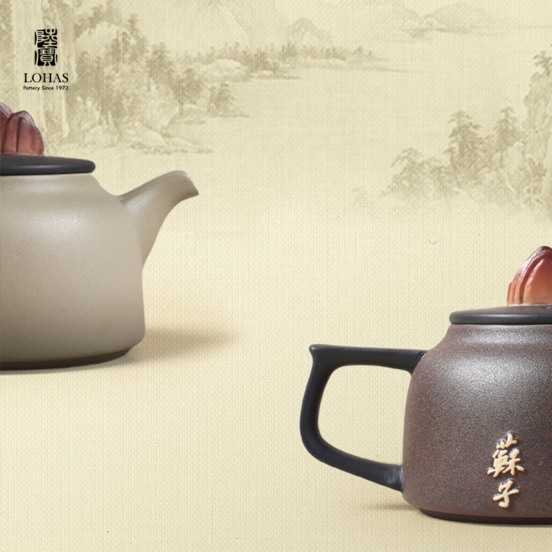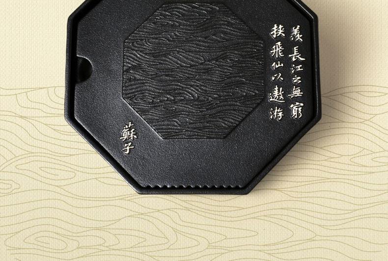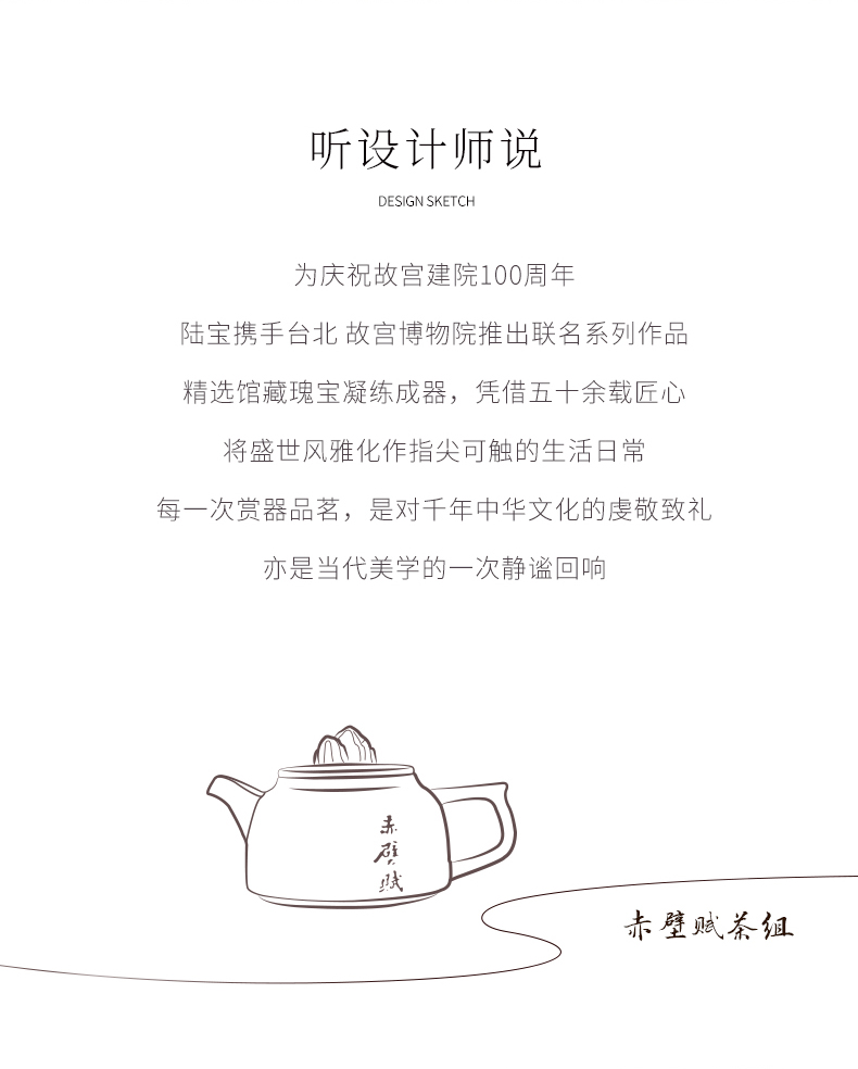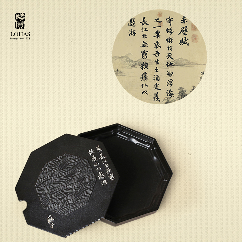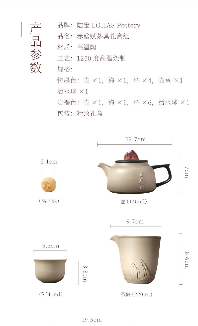 以炭入陶,塑造如泼墨艺术般效果,表现书法与水墨的无穷魅力,壶钮雕刻巍峨高山,还原画作中的山石的斧剑之劲,黑石壶把,触感温润,执壶省力,泡茶不烫手,茶海细致雕琢山岳与盘旋水纹展现赤壁的壮丽险奇,壶身精雕汉字「蘇子」向苏轼的才华和风骨致敬,壶承镌刻赤壁赋名句,传达洒脱旷达的人生态度,浮雕描绘水波盘旋荡漾
