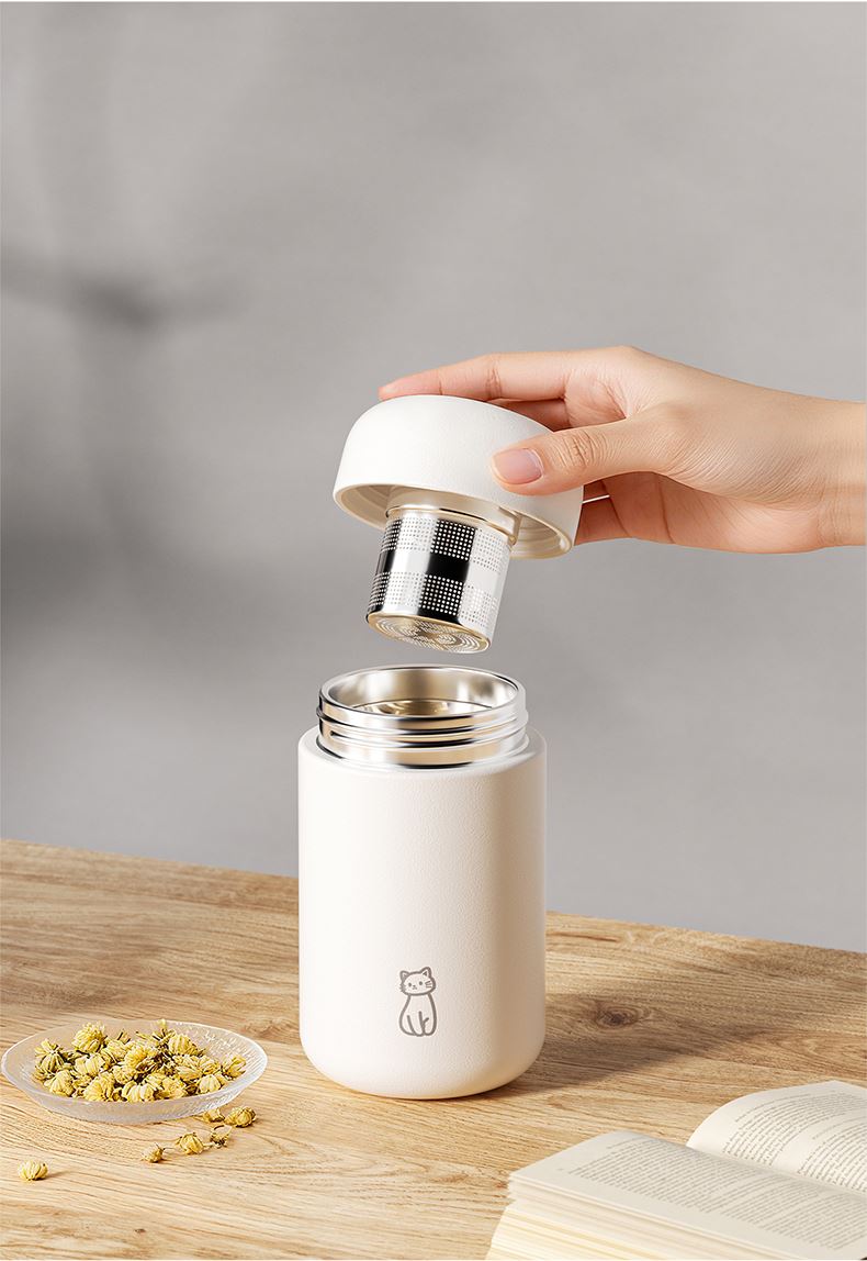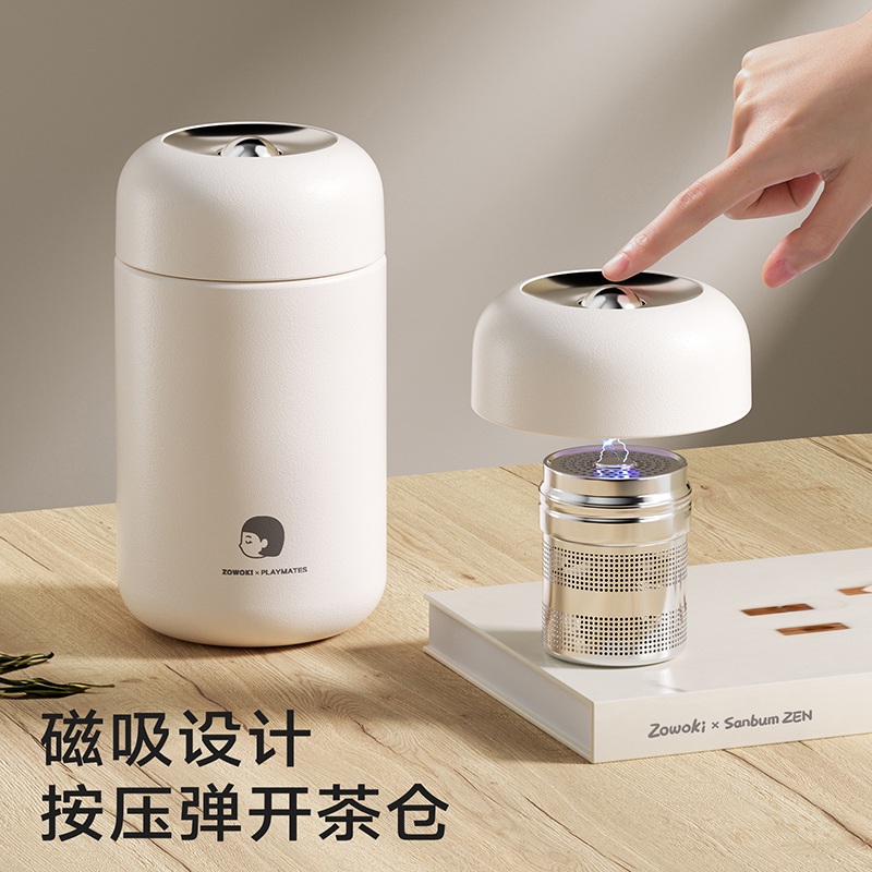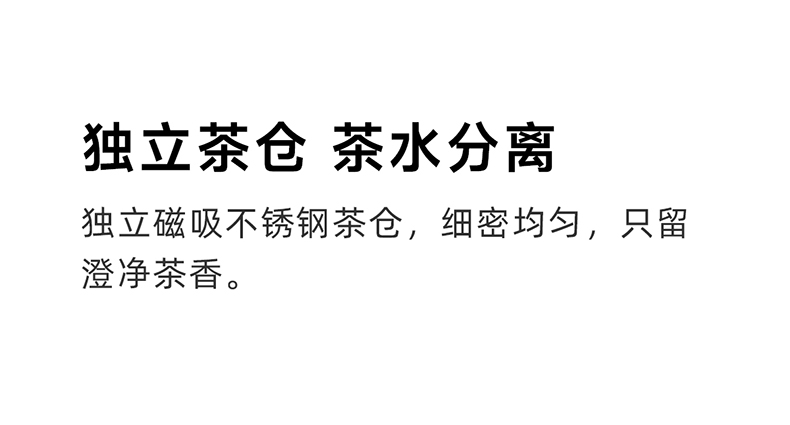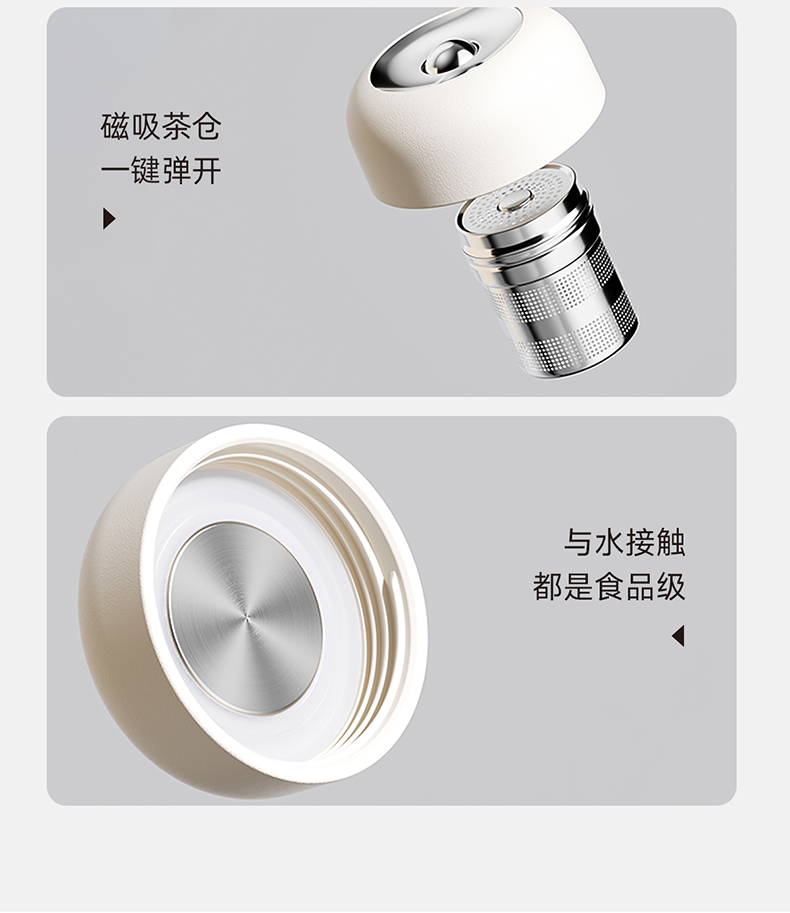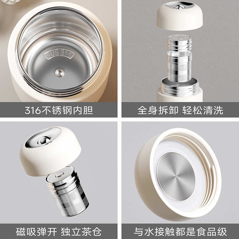 容量:400ml | 净重:282g | 口径:40mm 316不锈钢内胆,更健康。 独立磁吸不锈钢茶仓,细密均匀,茶水分离。 茶仓杯盖磁吸设计,一键按压弹开。 双层不锈钢真空锁温,保温时间更长。