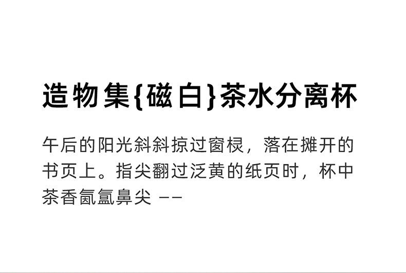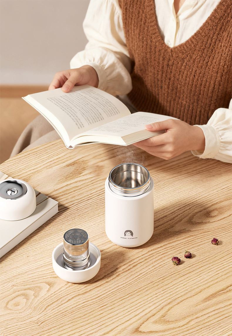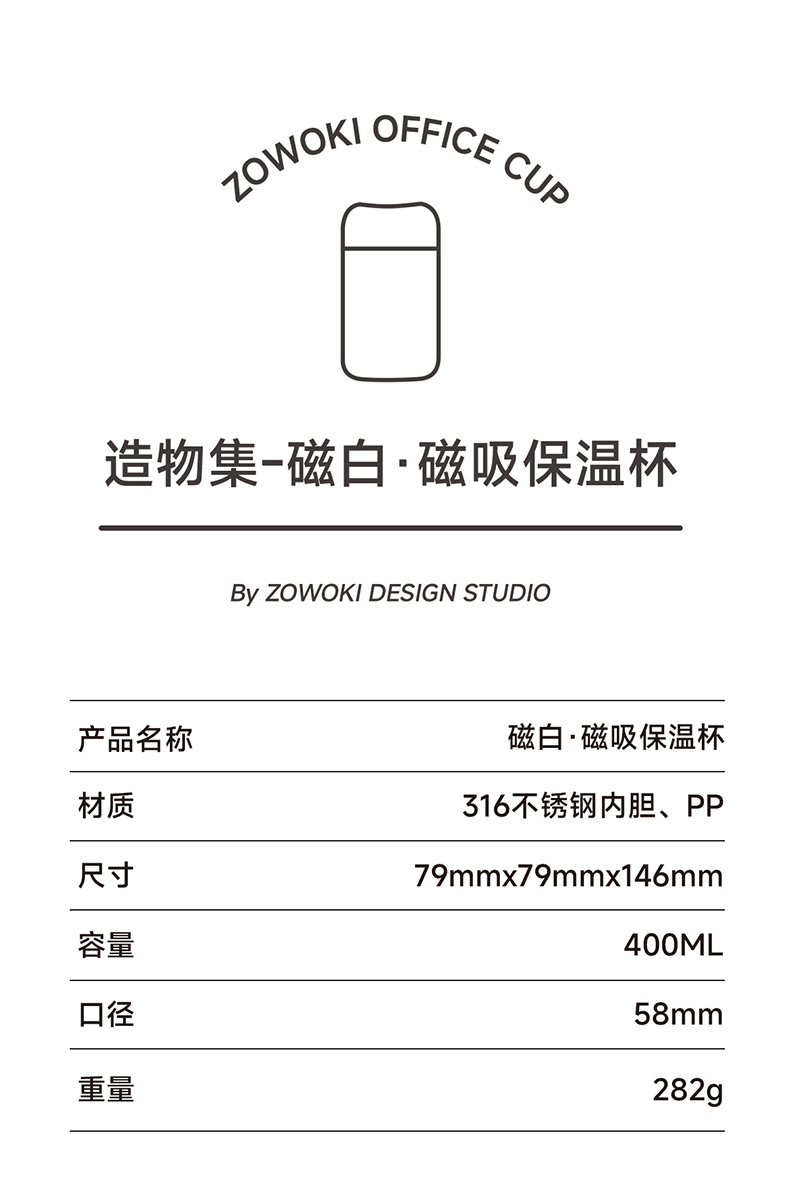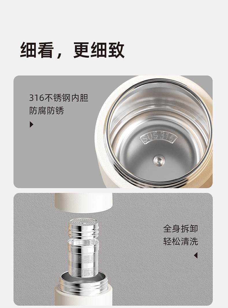 容量:400ml | 净重:282g | 口径:40mm 316不锈钢内胆,更健康。 独立磁吸不锈钢茶仓,细密均匀,茶水分离。 茶仓杯盖磁吸设计,一键按压弹开。 双层不锈钢真空锁温,保温时间更长。