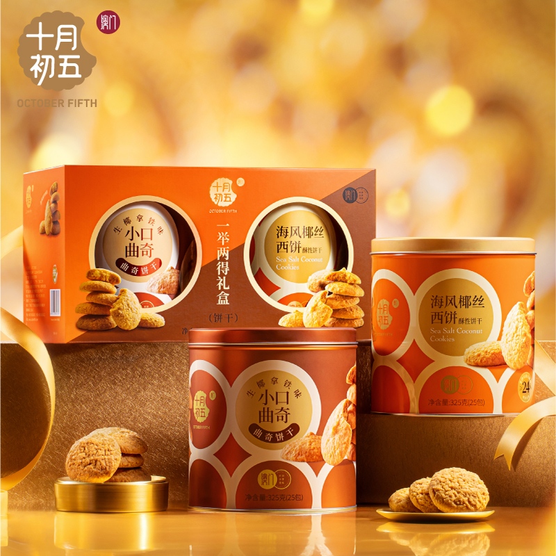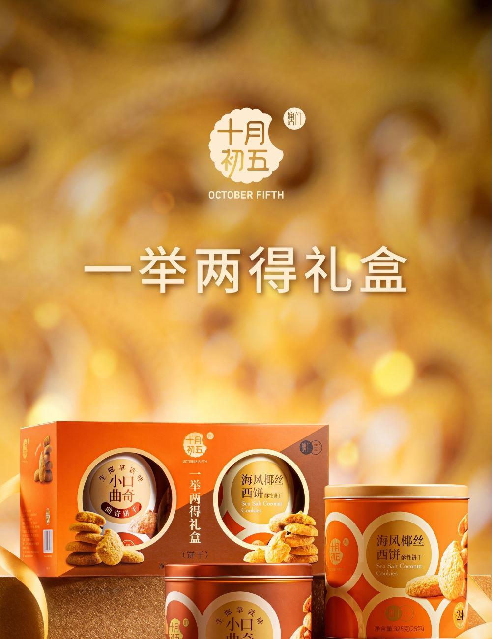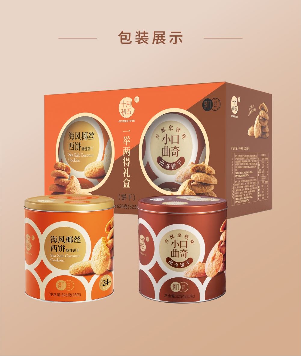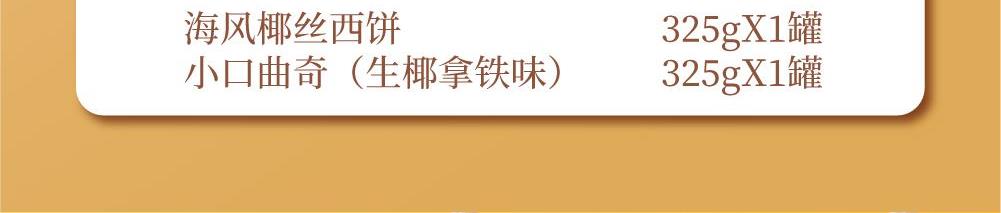 十月初五一举两得礼盒 净含量:650g 325g海风椰丝西饼X1罐 325g小口曲奇(生椰拿铁味)X1罐
