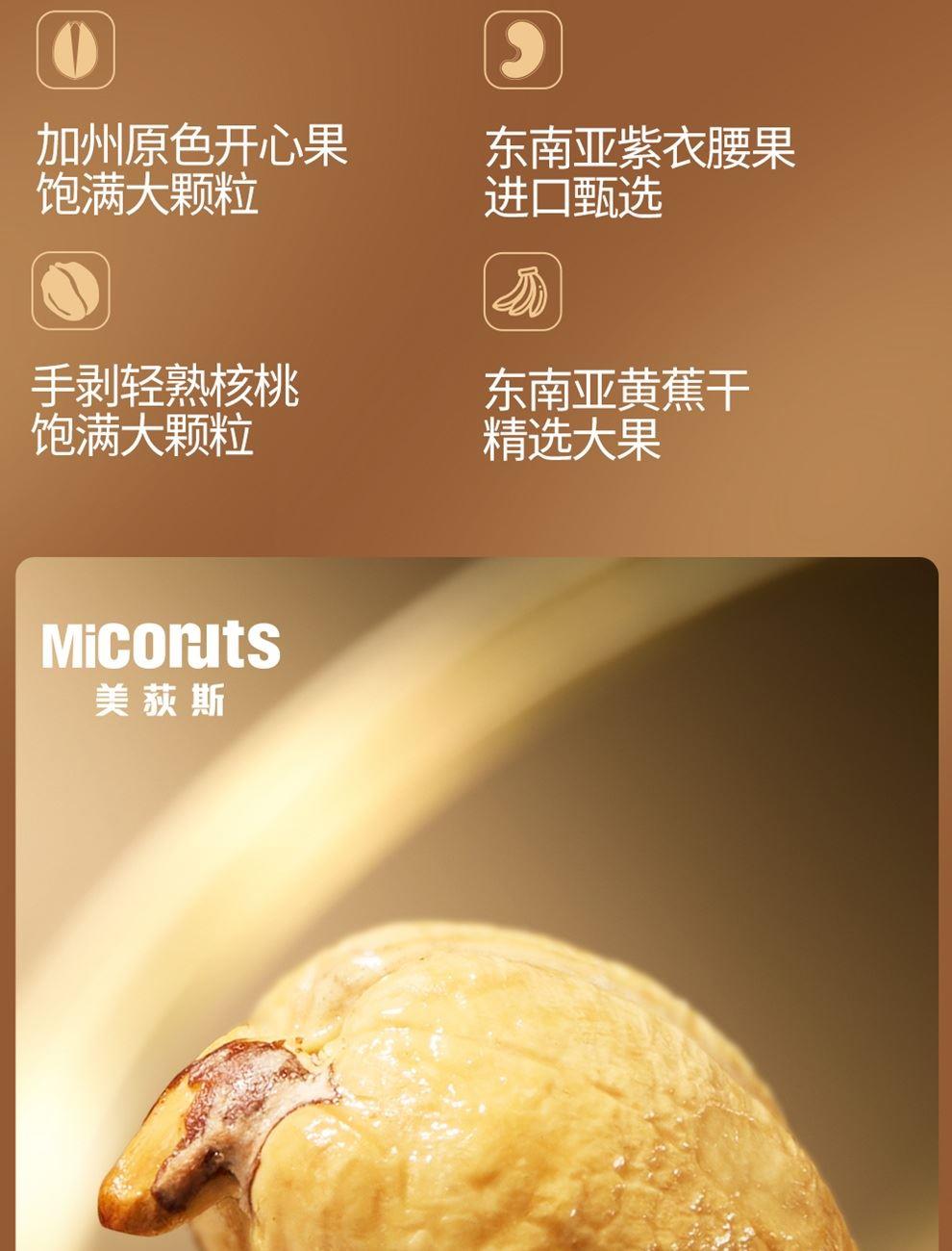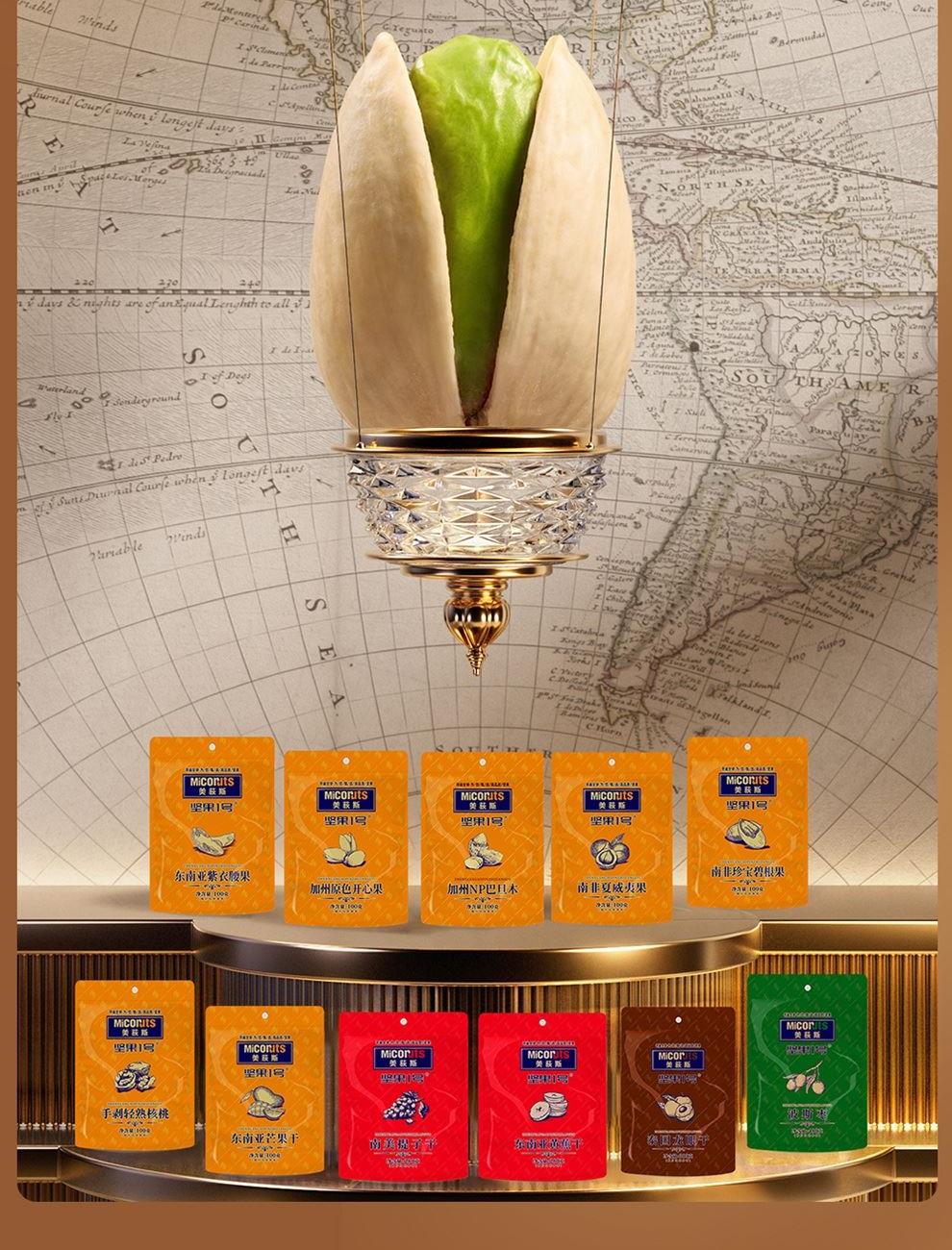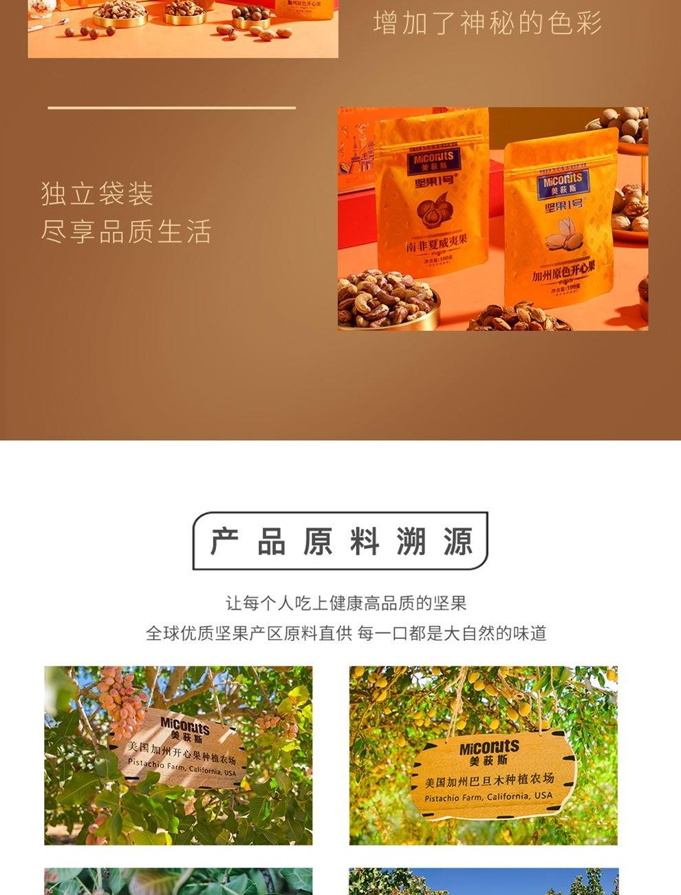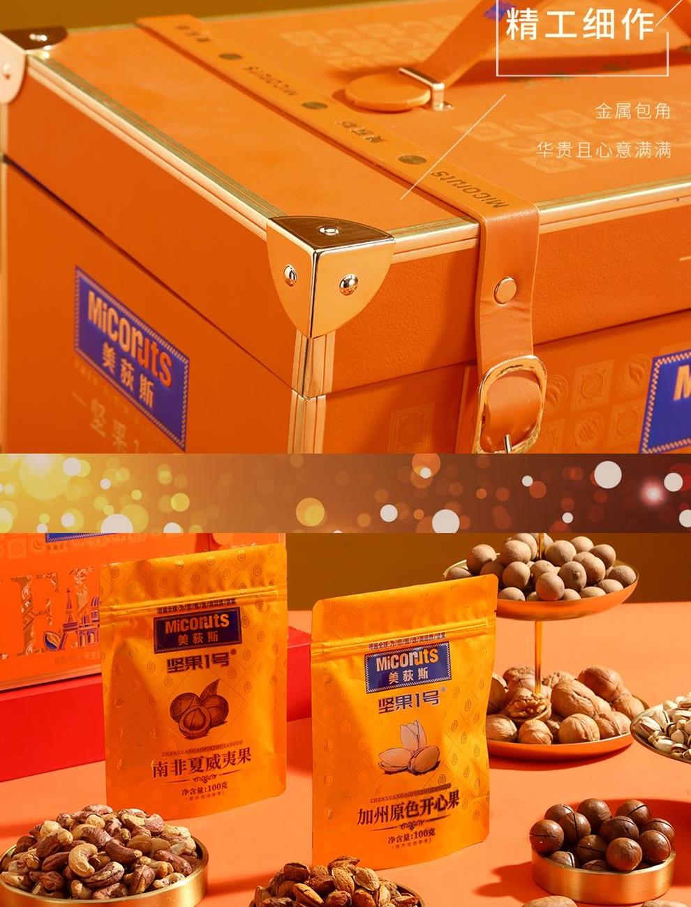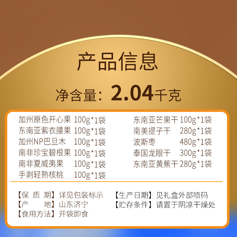 加州原色开心果 100g*1 东南亚紫衣腰果 100g*1 加州NP巴旦木 100g*1 南非珍宝碧根果 100g*1 南非夏威夷果 100g*1 手剥轻熟核桃 100g*1 东南亚芒果干 100g*1 南美提子干 280g*1 波斯枣 480g*1 泰国龙眼干 300g*1 东南亚黄蕉干 280g*1 合计:2040g