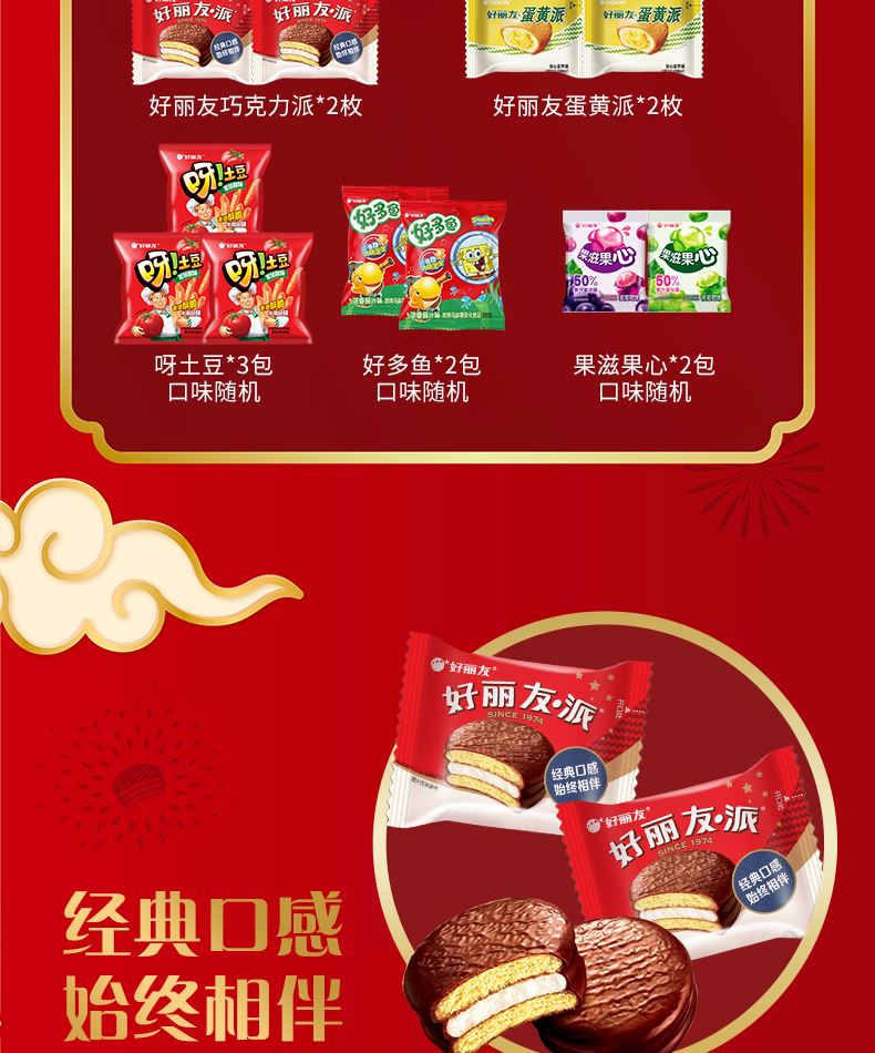 好丽友 好运来 礼盒329g 配置: 好丽友 果心16.8g×2 好丽友 巧克力派28g×2 好丽友 蛋黄派18g×2 好丽友 呀土豆12g×3 好丽友 好多鱼19g×2 好丽友 好友趣45g×2 好丽友 浪里个浪40g×1