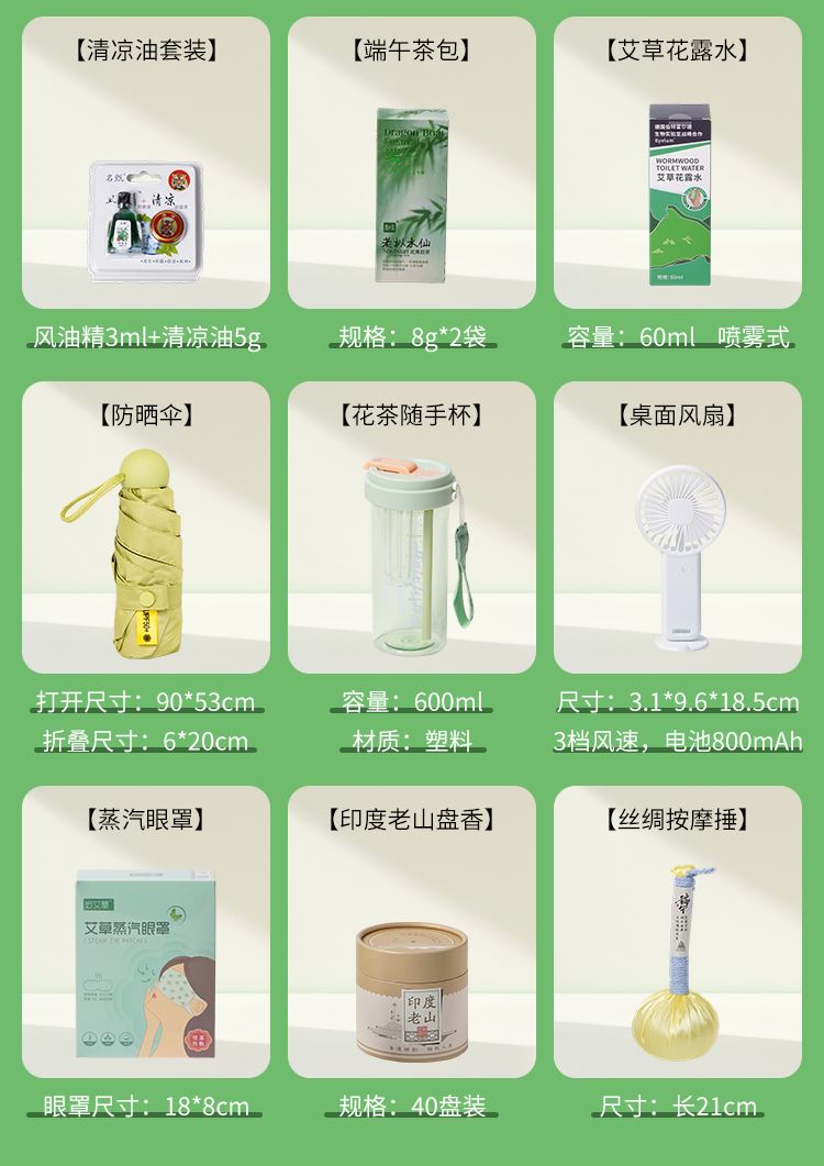 编码:DAL1245 内配:丝绸按摩捶+清凉油套装+艾草花露水+桌面风扇+香囊 注:产品报价只对应主图款,详情页其他款报价具体联系