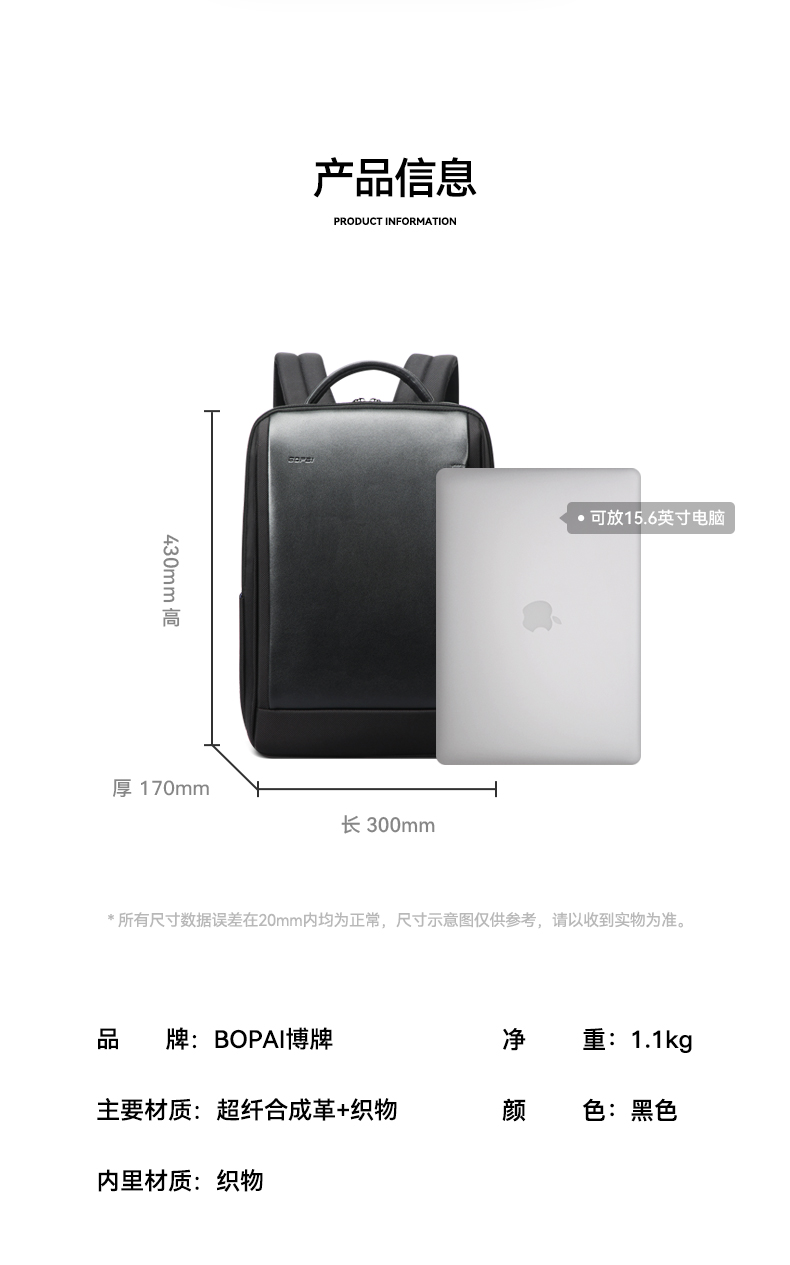 材质:布/超纤皮 尺寸:30*17*43cm 颜色:黑色