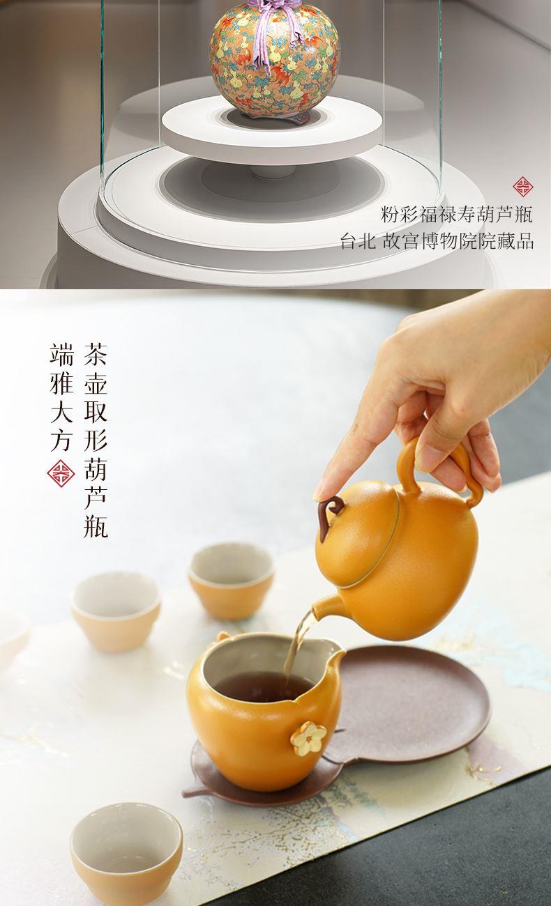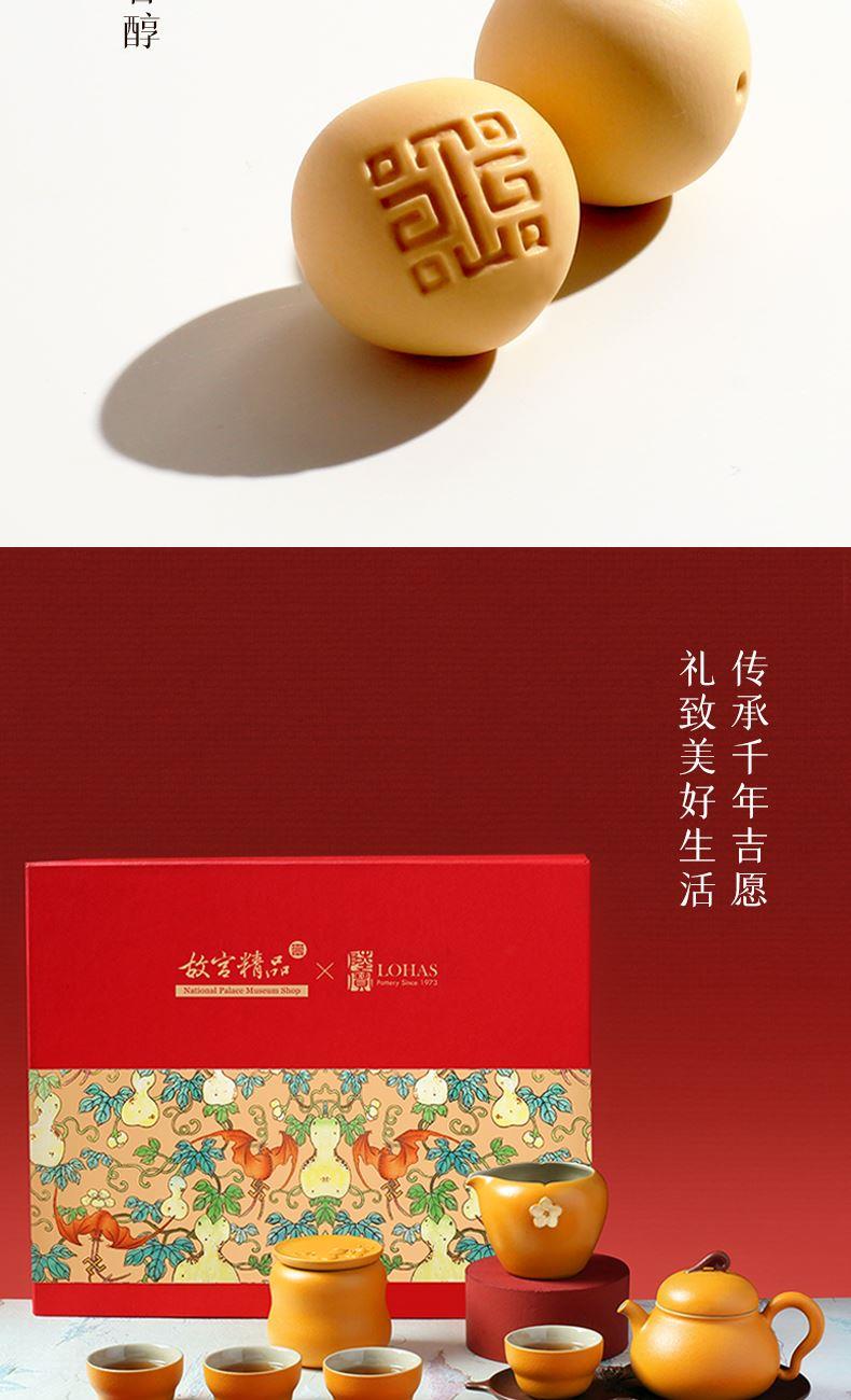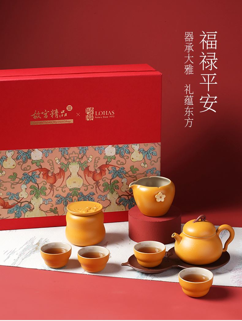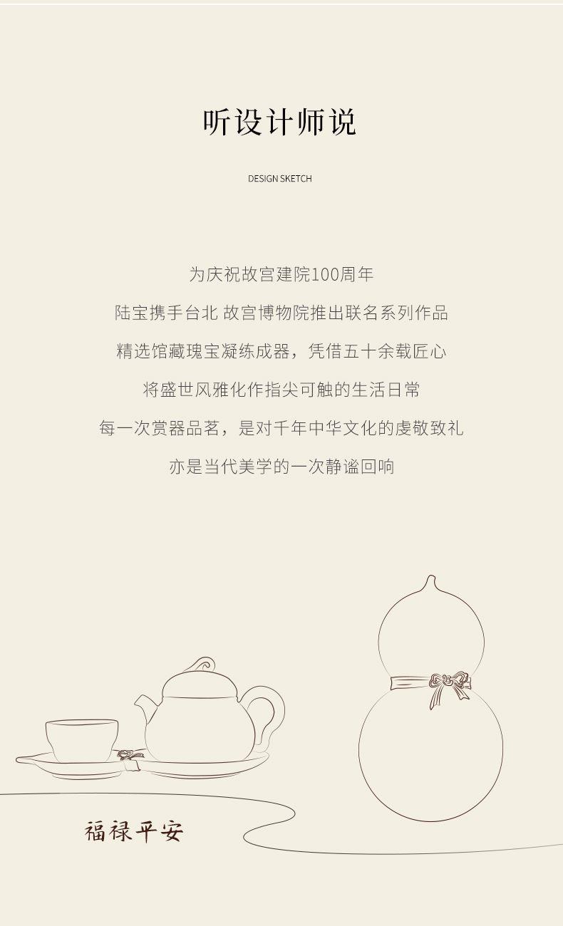 在中华文化中葫芦是「福禄双全」的祥瑞化身,承载着人们对美好生活的向往。陆宝撷取馆藏珍品「粉彩福禄寿葫芦瓶」之精髓,将经典文物的雅韵与品茗生活的意趣巧妙结合,创作出福禄平安茶具礼盒组。作品取形葫芦瓶,端雅大方,蕴含东方美学意境;茶海导入文物花卉纹样,手绘彩釉装饰,婉丽雅致;茶叶罐浮雕“一藤两葫芦”,传递福禄成双的祝福。 以匠心致敬经典,以茶韵连结古今,在一盏茶香中,品味人文之美,感受生活的诗意芬芳。 规 格:壶×1,海×1,杯×4,壶承×1茶叶罐×1,活水球×1 容 量:壶/180ml、海/210ml、杯/40ml