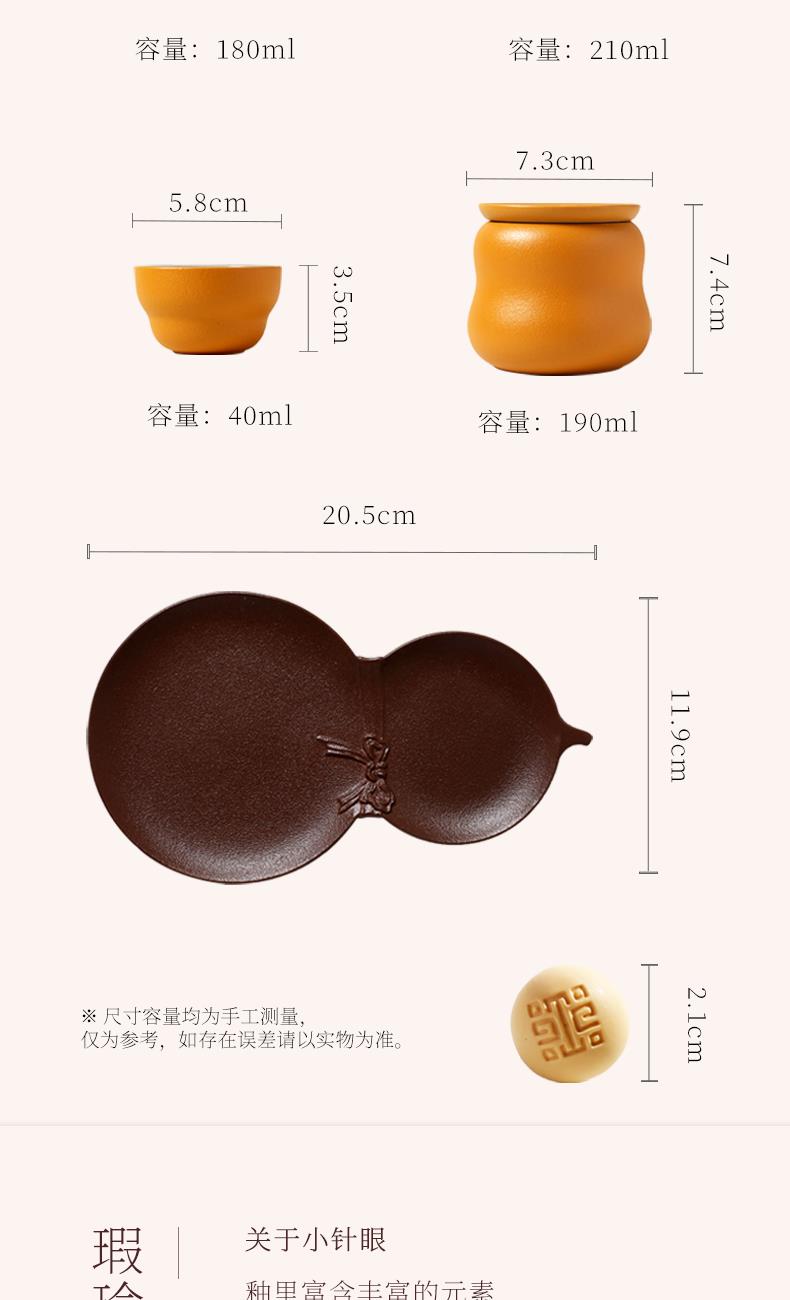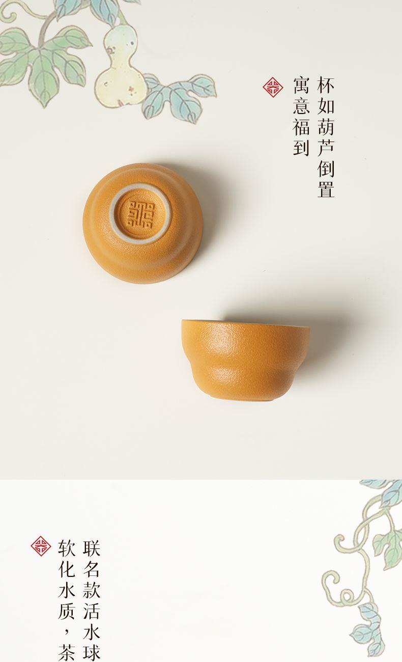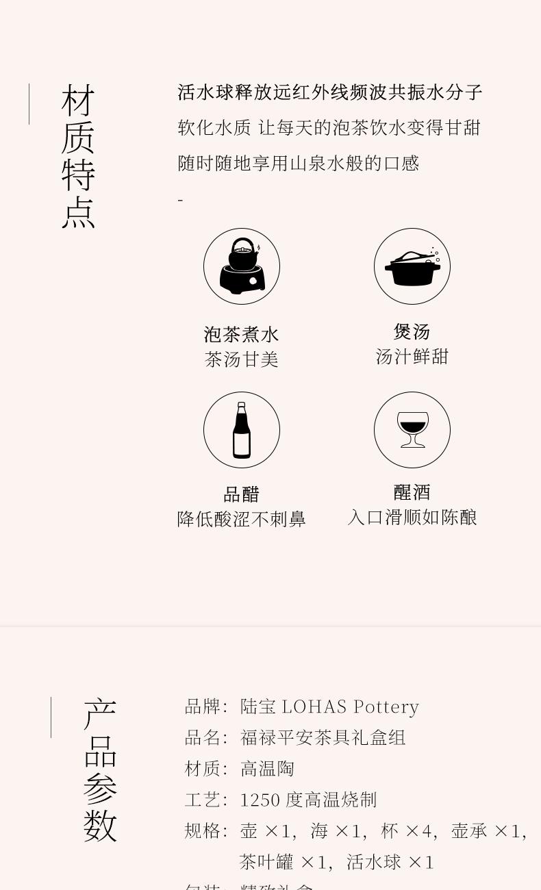 在中华文化中葫芦是「福禄双全」的祥瑞化身,承载着人们对美好生活的向往。陆宝撷取馆藏珍品「粉彩福禄寿葫芦瓶」之精髓,将经典文物的雅韵与品茗生活的意趣巧妙结合,创作出福禄平安茶具礼盒组。作品取形葫芦瓶,端雅大方,蕴含东方美学意境;茶海导入文物花卉纹样,手绘彩釉装饰,婉丽雅致;茶叶罐浮雕“一藤两葫芦”,传递福禄成双的祝福。 以匠心致敬经典,以茶韵连结古今,在一盏茶香中,品味人文之美,感受生活的诗意芬芳。 规 格:壶×1,海×1,杯×4,壶承×1茶叶罐×1,活水球×1 容 量:壶/180ml、海/210ml、杯/40ml