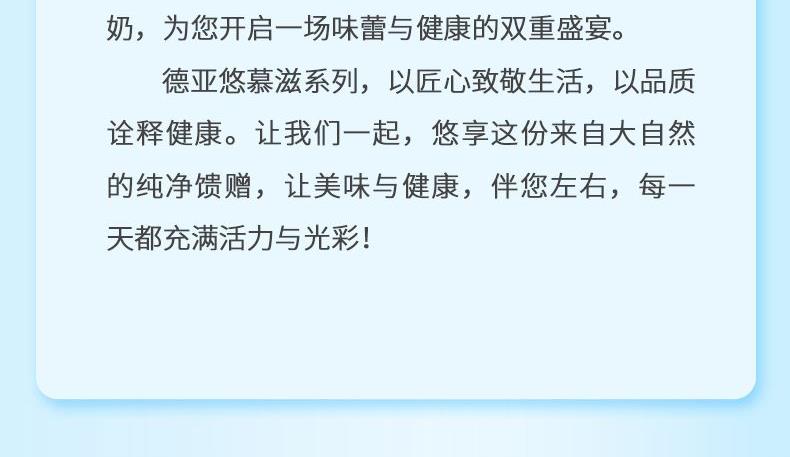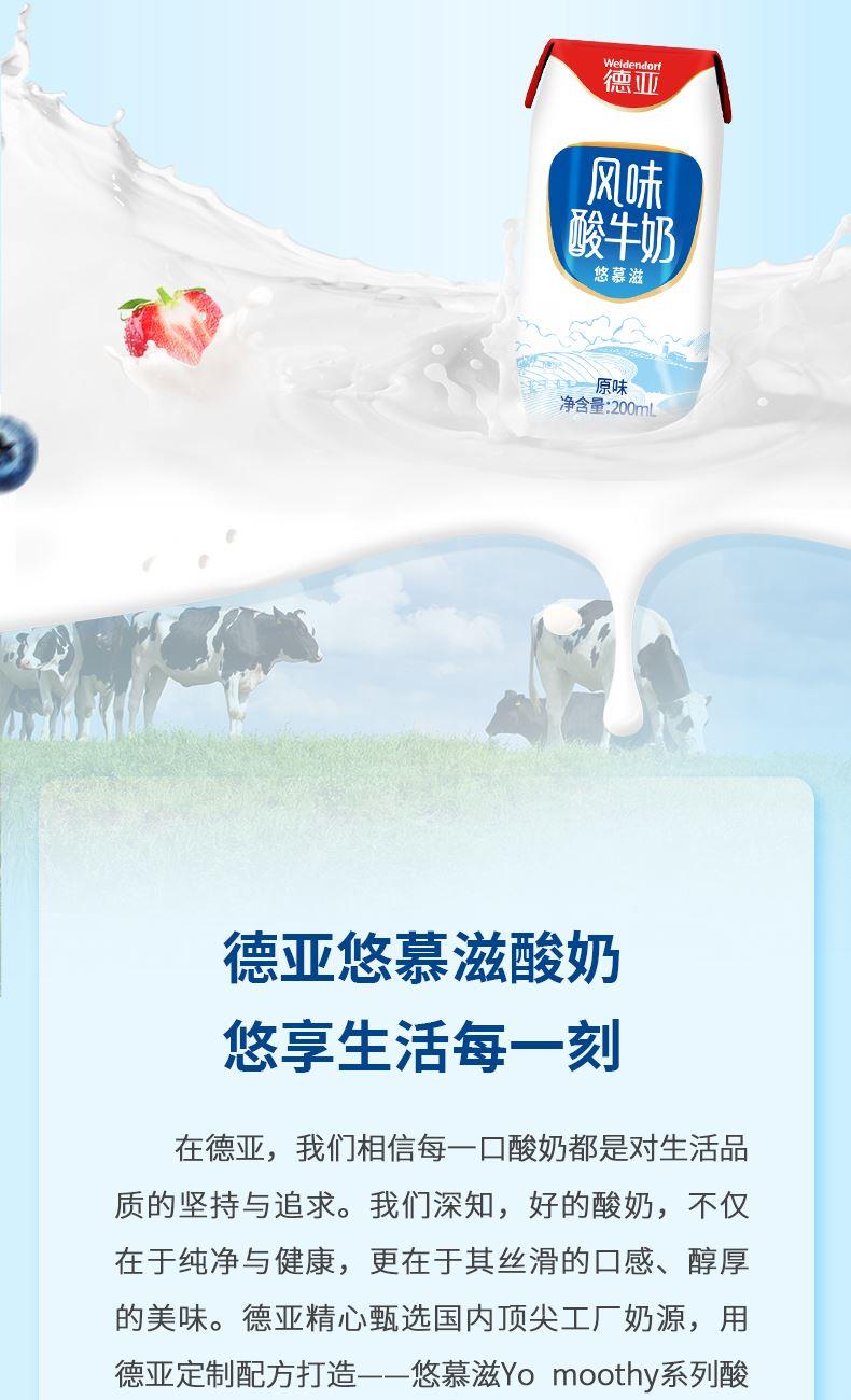 产品:德亚悠慕滋风味酸牛奶 产品规格:200ml/支x10 保 质 期:6个月 贮藏方法:常温密闭保存,冷藏后风味更佳