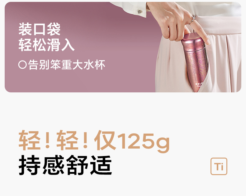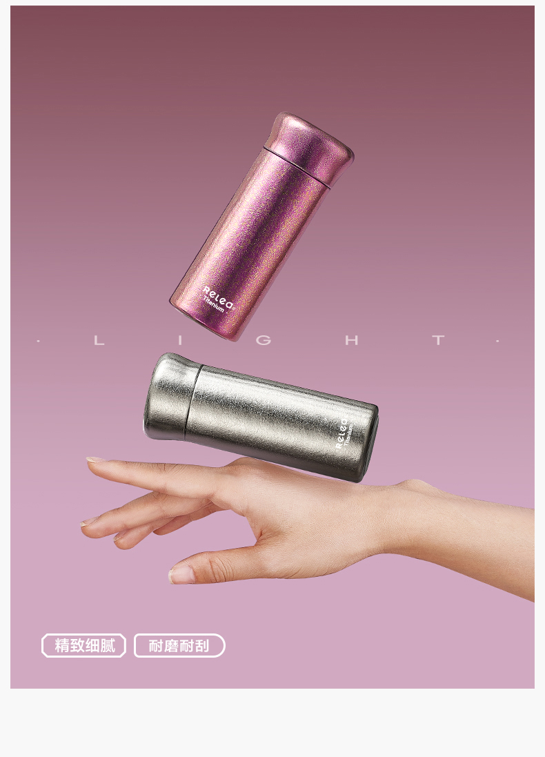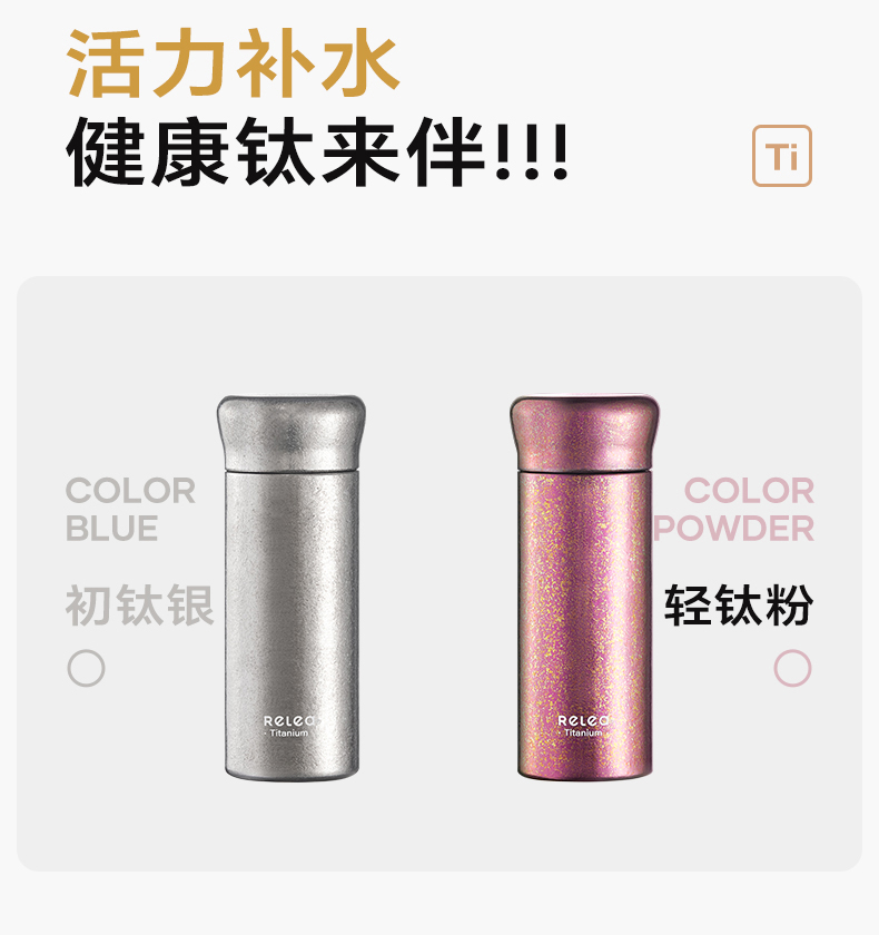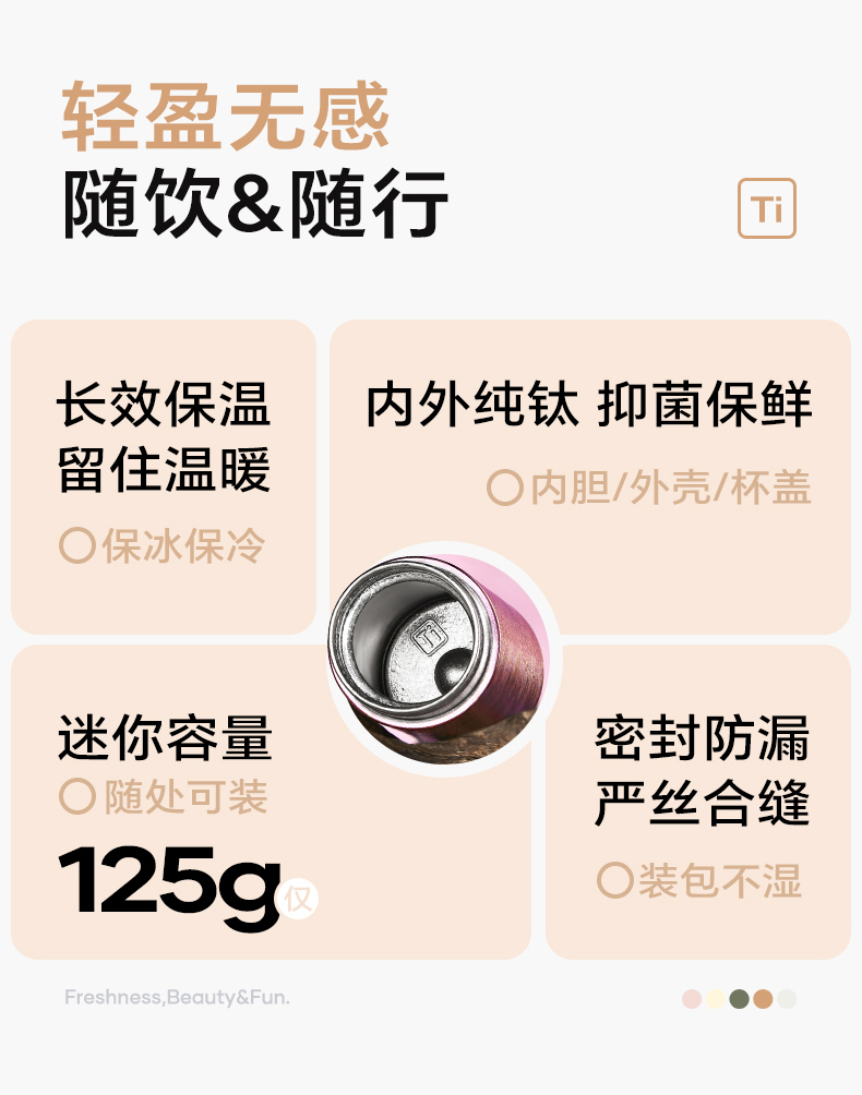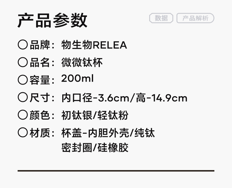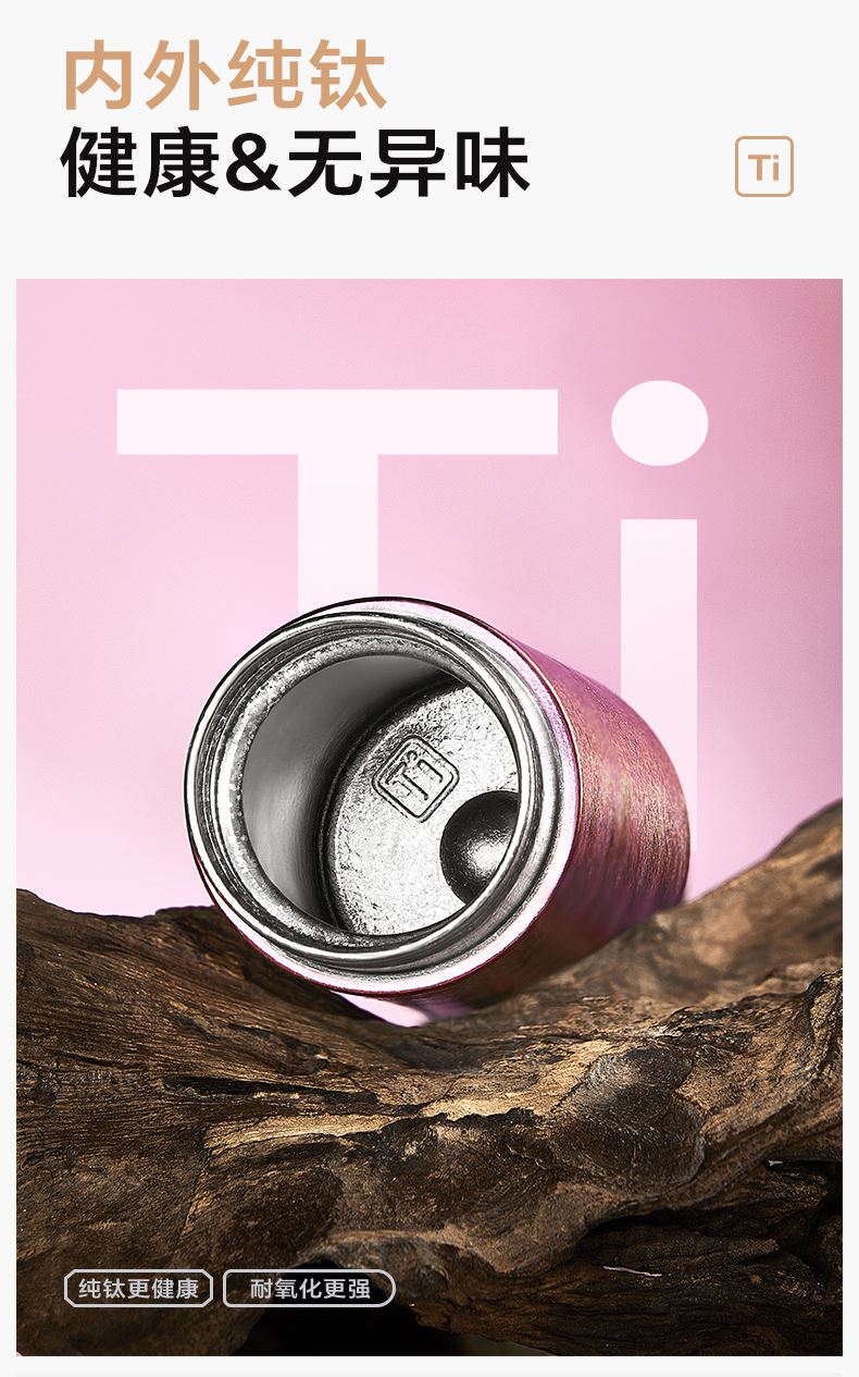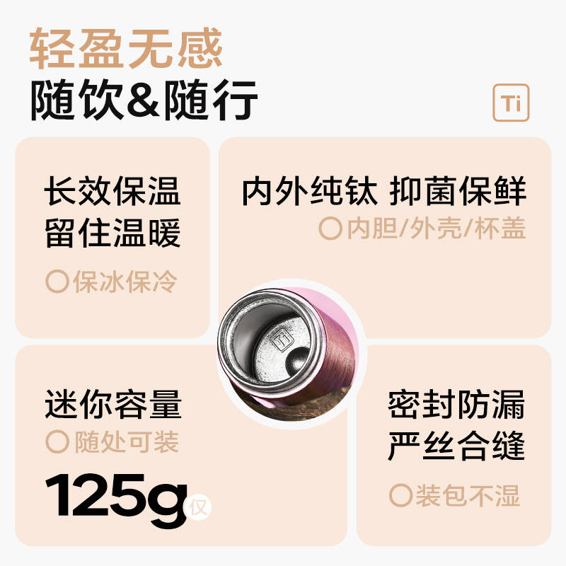 颜色:轻钛粉,初钛银 容量:200ml 材质:杯盖-内胆外壳/纯钛 密封圈/硅橡胶 尺寸:内口径3.6cm/高14.9cm ①内外纯钛 保鲜 ②密封防漏严丝合缝 ③迷你容量随处可装仅重125g