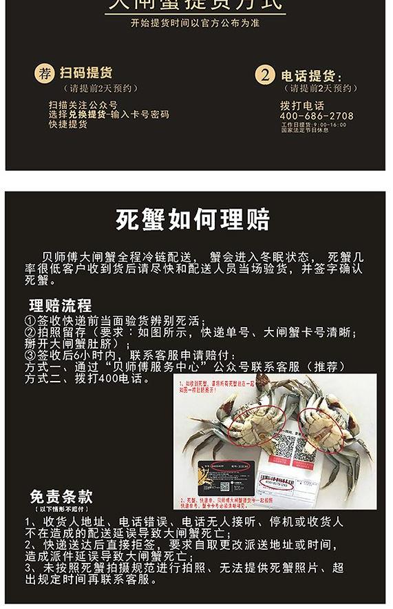 产品规格: 公蟹:3.2两*5只 母蟹:2.2两*5只 卡套形式:精美提货卡+卡套 实物附赠:食蟹工具、蟹醋、姜茶、紫苏、保温冰袋。 售后承诺:阳澄湖空运直达,死蟹、残蟹包赔。 简介: 贝师傅大闸蟹其创始人贝建国先生是阳澄湖蟹传统养蟹人,从事养蟹近四十年。坚持以玉米、小鱼、田螺等传统饲料喂养保证大闸蟹能够拥有良好的生长环境。在苏州市阳澄湖核心水域拥有广阔的养殖基地。因此真正实现了原产地发货。把美味的大闸蟹从阳澄湖直接送到美食者的餐桌。