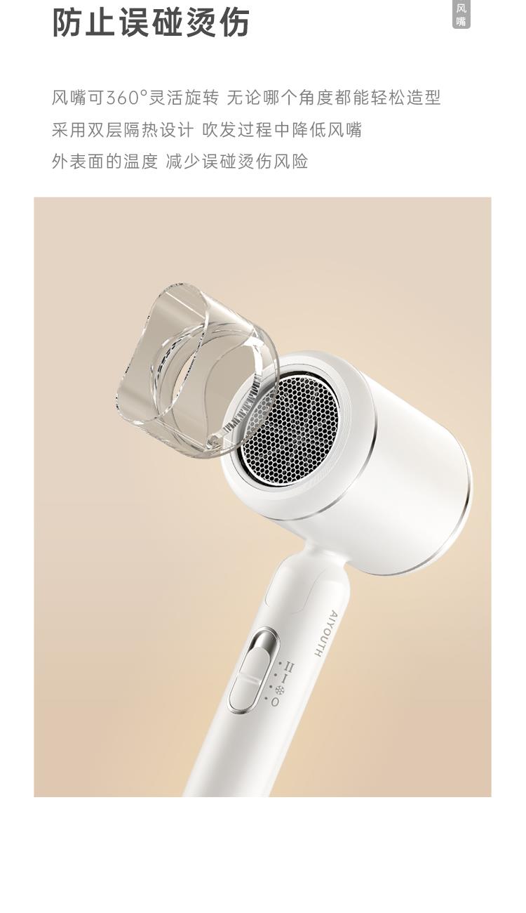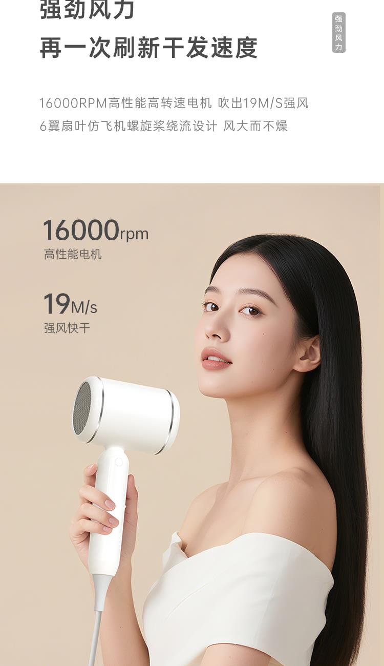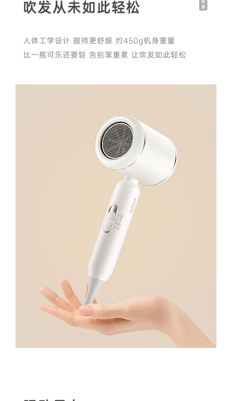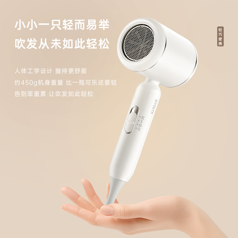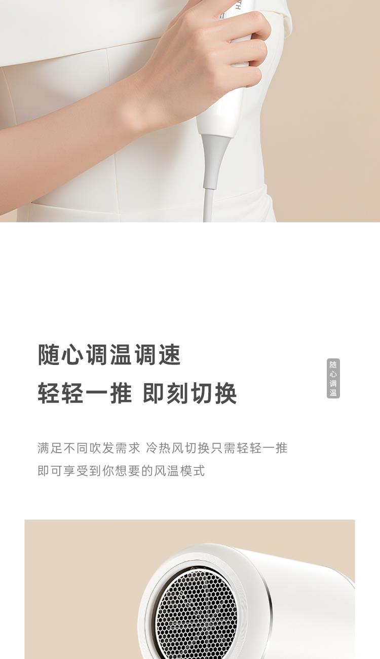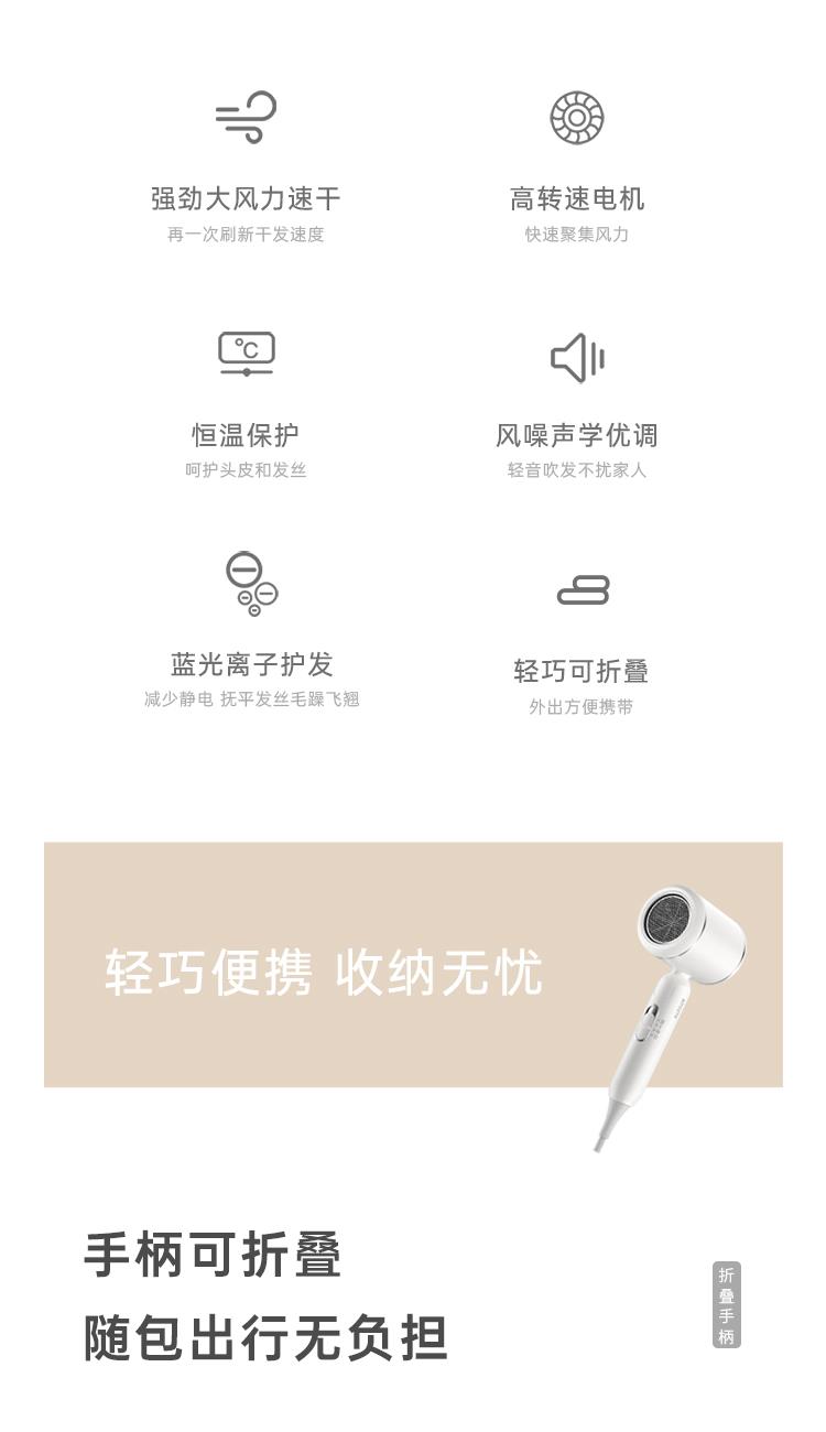 额定电压:220V~ 额定频率:50HZ 额定功率:1250W 产品毛重:0.45kg 产品颜色:米白色 包装尺寸:140*85*230mm 产品清单:主机、风嘴、说明书 主要材质:PC+ABS 特色功能: 1.便携折叠手柄设计,旅行出差轻松携带 2.蓝光护发,减少热损伤,吹出柔顺亮泽光彩 3.智能控温,恒温护发,双重过热断电保护 4.三档位冷热风,多档调节,自由切换吹风模式 5.低音降噪运行,早晚使用不扰人