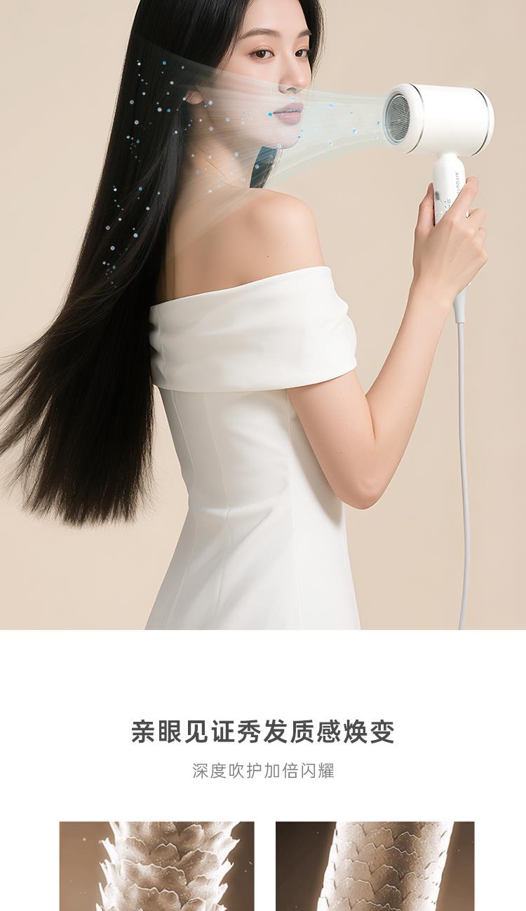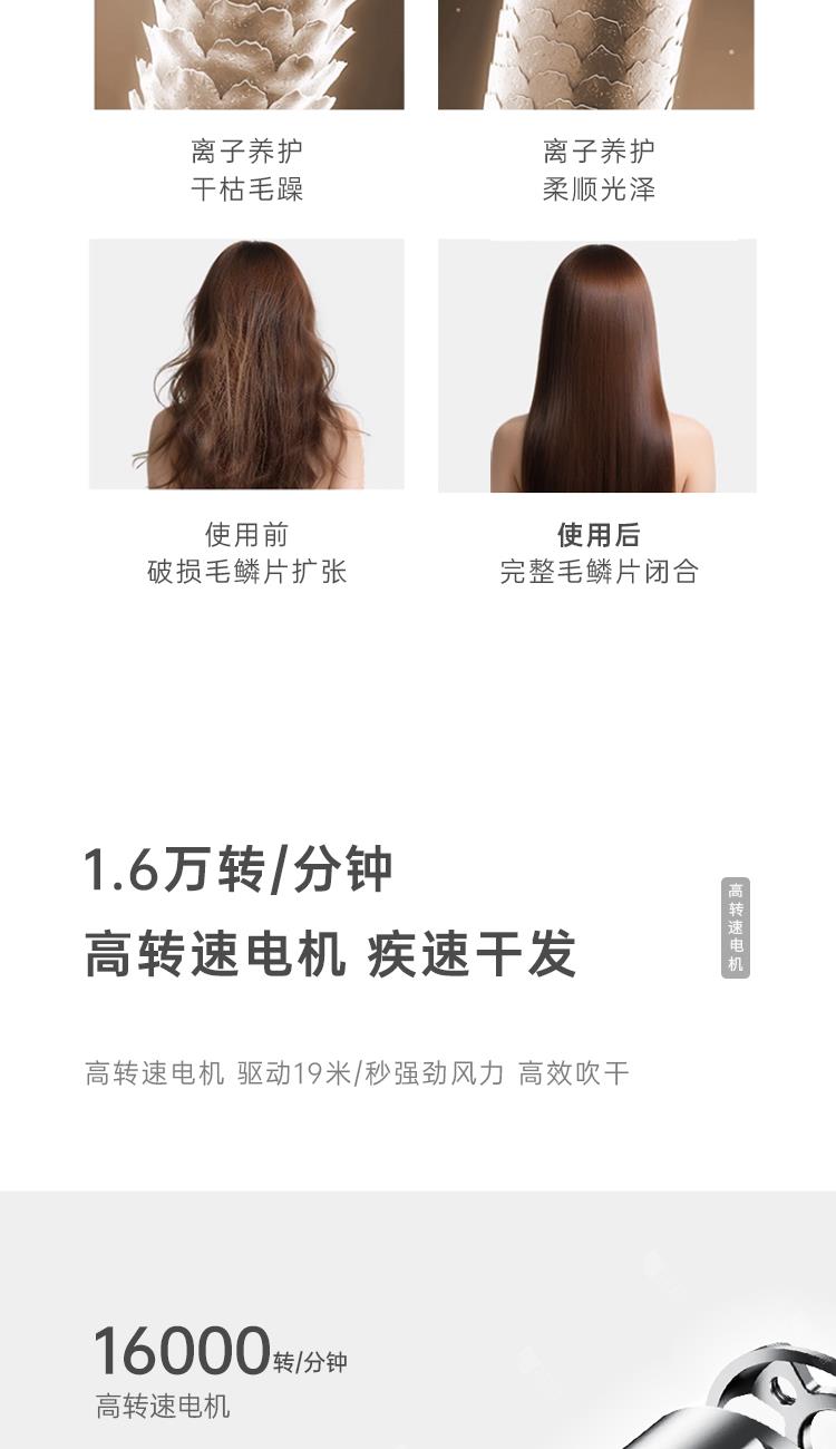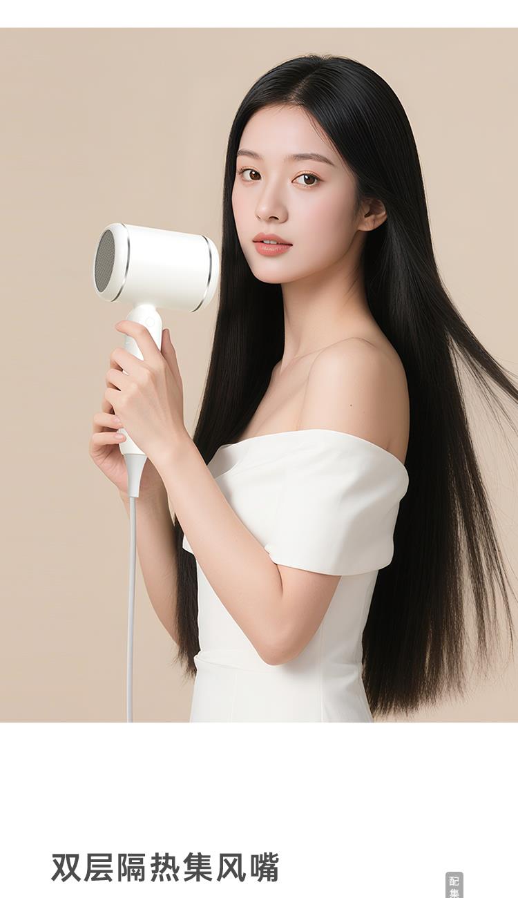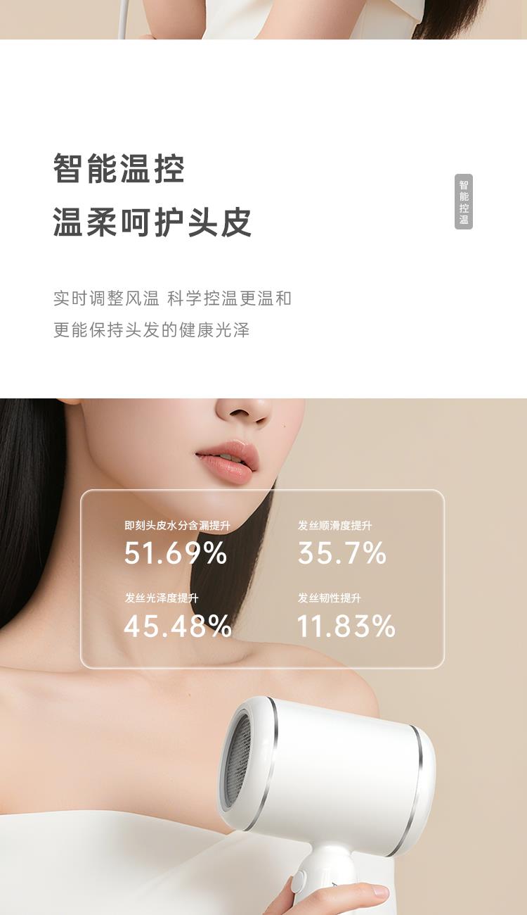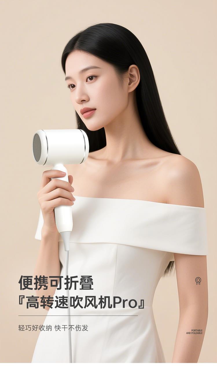 额定电压:220V~ 额定频率:50HZ 额定功率:1250W 产品毛重:0.45kg 产品颜色:米白色 包装尺寸:140*85*230mm 产品清单:主机、风嘴、说明书 主要材质:PC+ABS 特色功能: 1.便携折叠手柄设计,旅行出差轻松携带 2.蓝光护发,减少热损伤,吹出柔顺亮泽光彩 3.智能控温,恒温护发,双重过热断电保护 4.三档位冷热风,多档调节,自由切换吹风模式 5.低音降噪运行,早晚使用不扰人