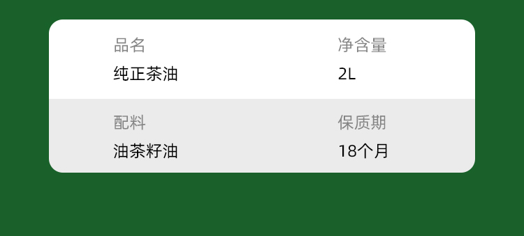 等级:一级 榨取工艺:冷榨 包装形式:桶装 加工工艺:压榨 保质期:540天 包装规格:1瓶 纯正茶油2L,低温冷榨,高山茶籽油食用油,零0反式脂肪酸。