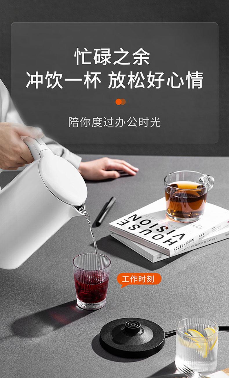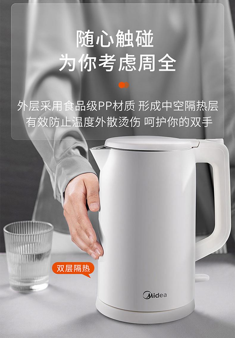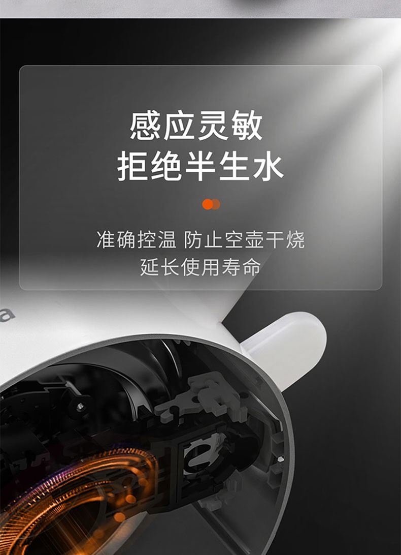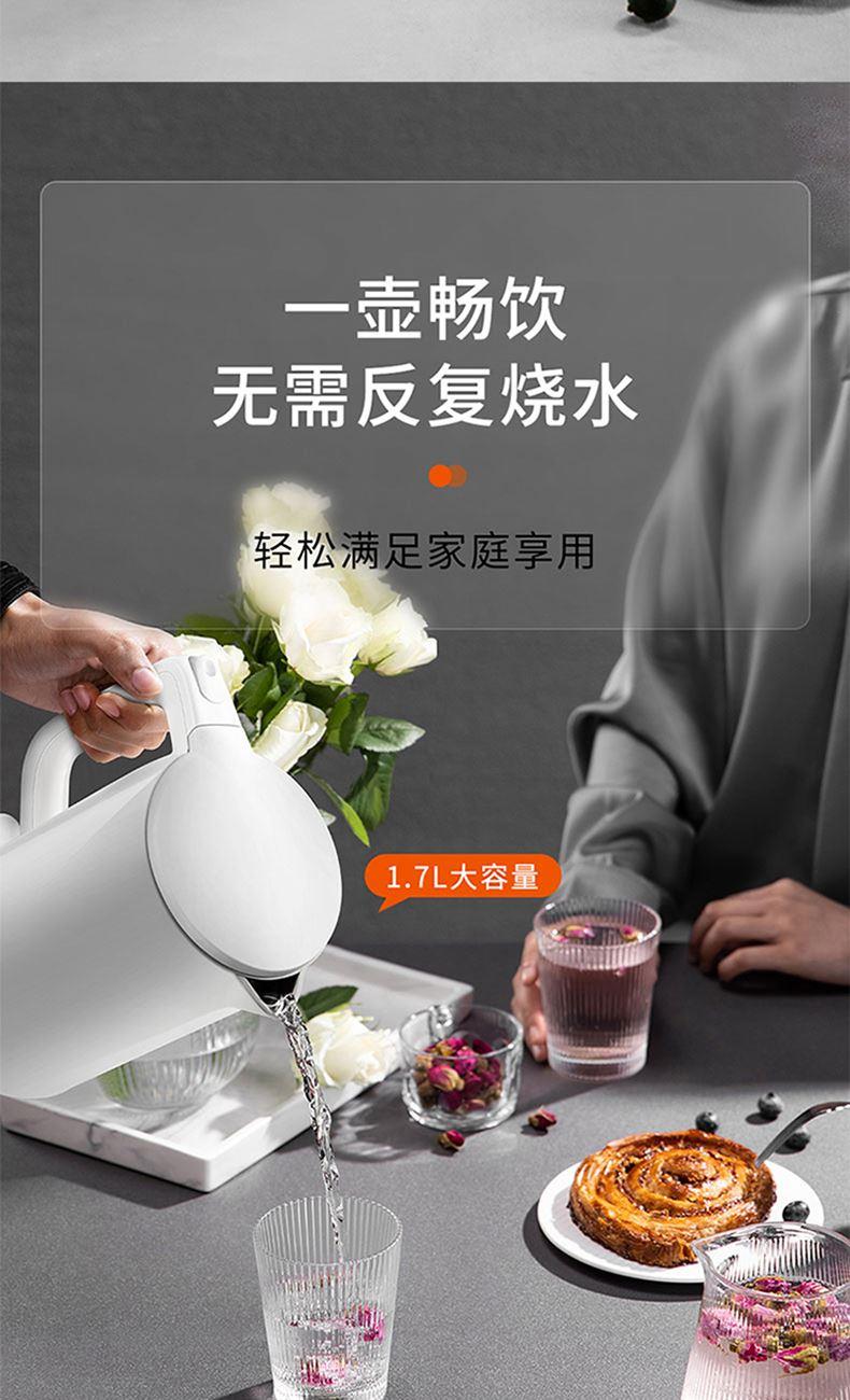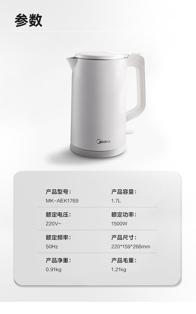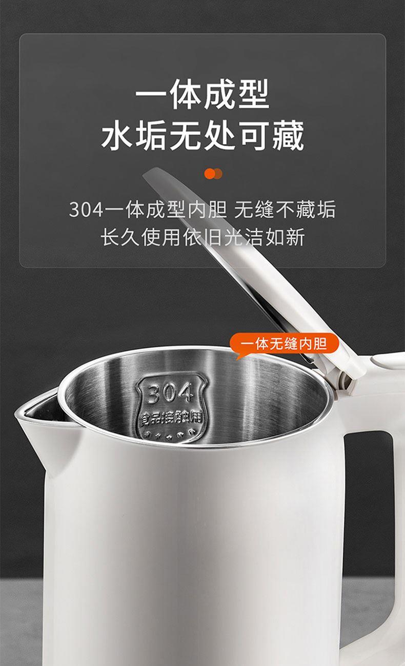 产品规格: 产品尺寸:219.65 x 159.08 x 265.8 mm 包装尺寸:222 x 207 x 285 mm 产品毛重:1.21 kg 产品特点: 简约洁白的设计,轻松勾勒艺术的美; 1500W大功率聚能加热环均衡加热,一首歌的时间从冷水到沸腾; 304-体成型内胆无缝不藏垢,长久使用依旧光洁如新; 外层采用食品级PP材质,形成中空隔热层,有效防止温度; 控温防止空壶干烧,延长使用寿命;