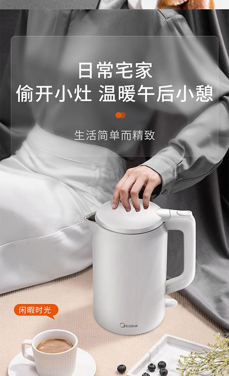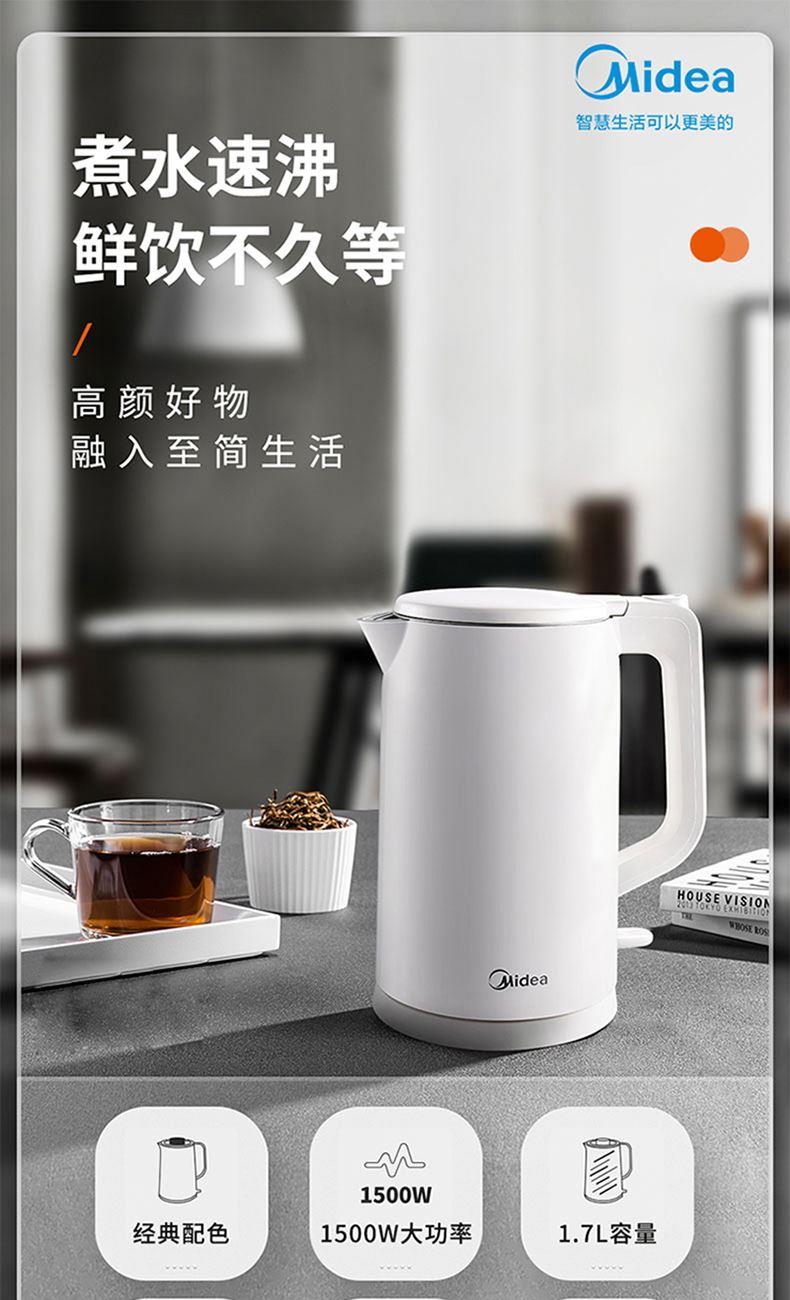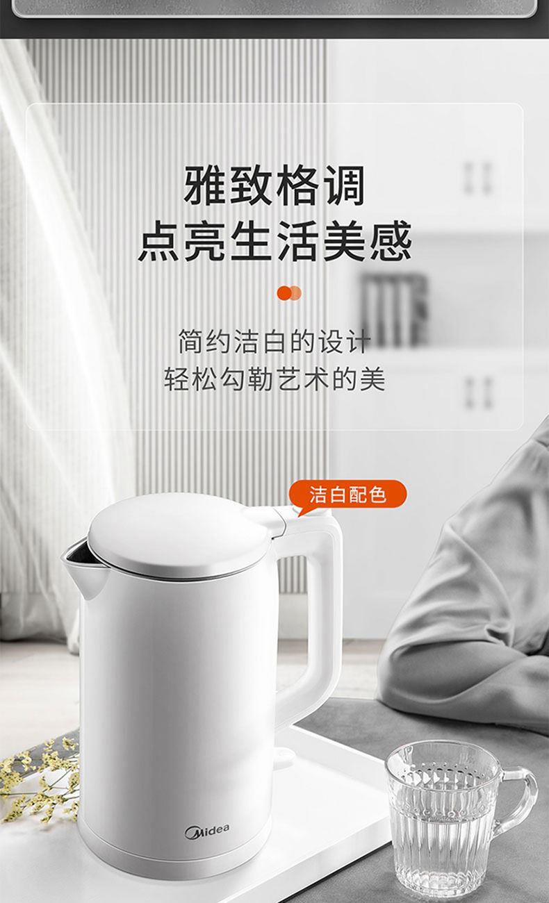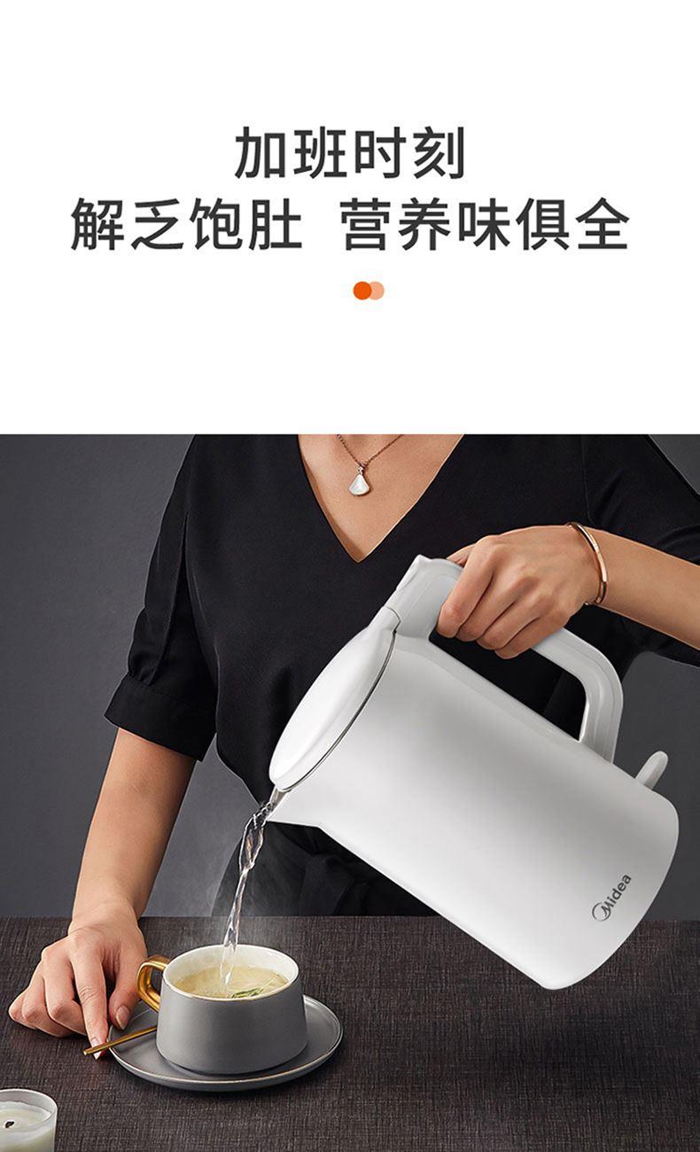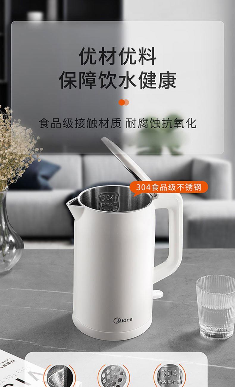 产品规格: 产品尺寸:219.65 x 159.08 x 265.8 mm 包装尺寸:222 x 207 x 285 mm 产品毛重:1.21 kg 产品特点: 简约洁白的设计,轻松勾勒艺术的美; 1500W大功率聚能加热环均衡加热,一首歌的时间从冷水到沸腾; 304-体成型内胆无缝不藏垢,长久使用依旧光洁如新; 外层采用食品级PP材质,形成中空隔热层,有效防止温度; 控温防止空壶干烧,延长使用寿命;