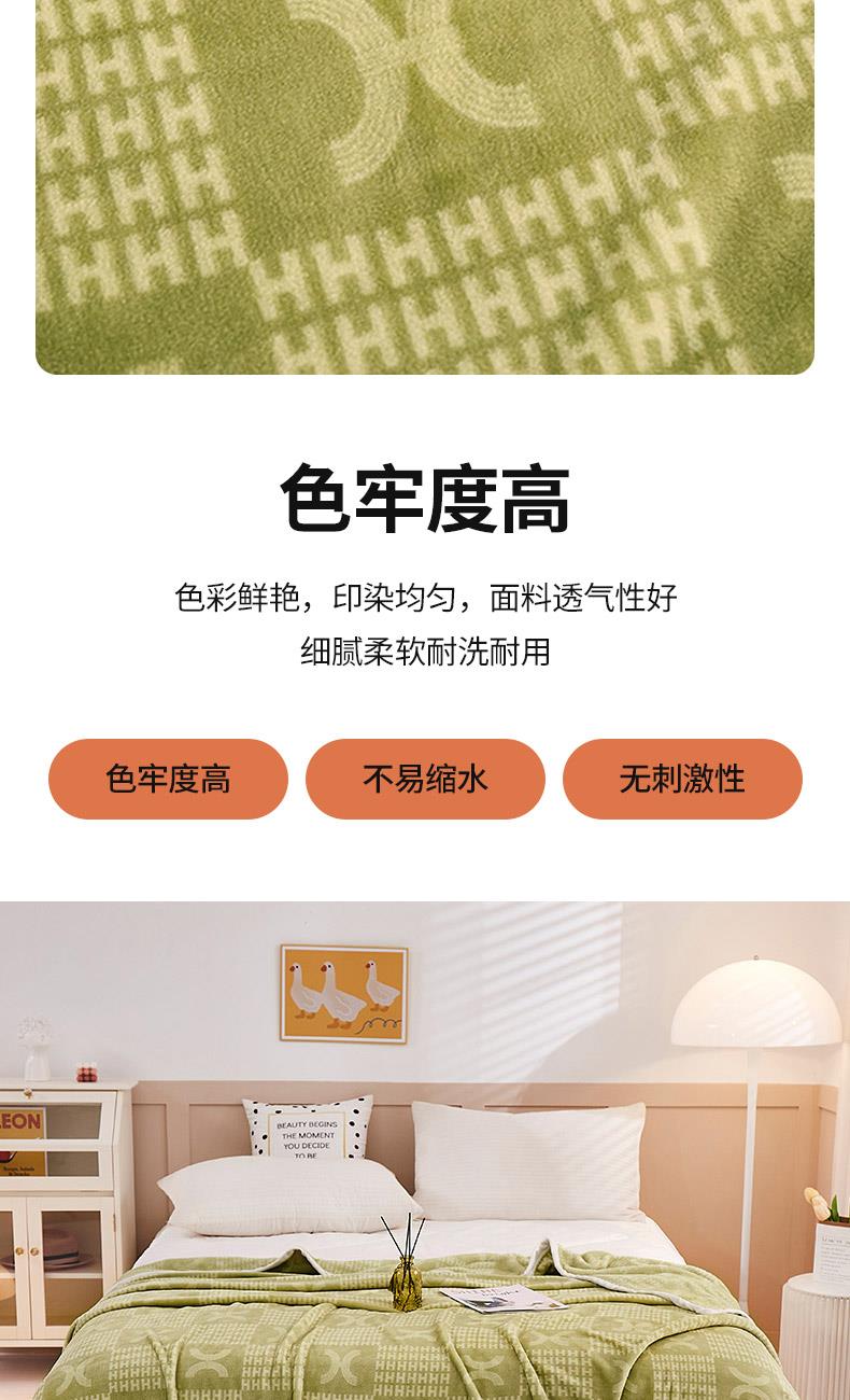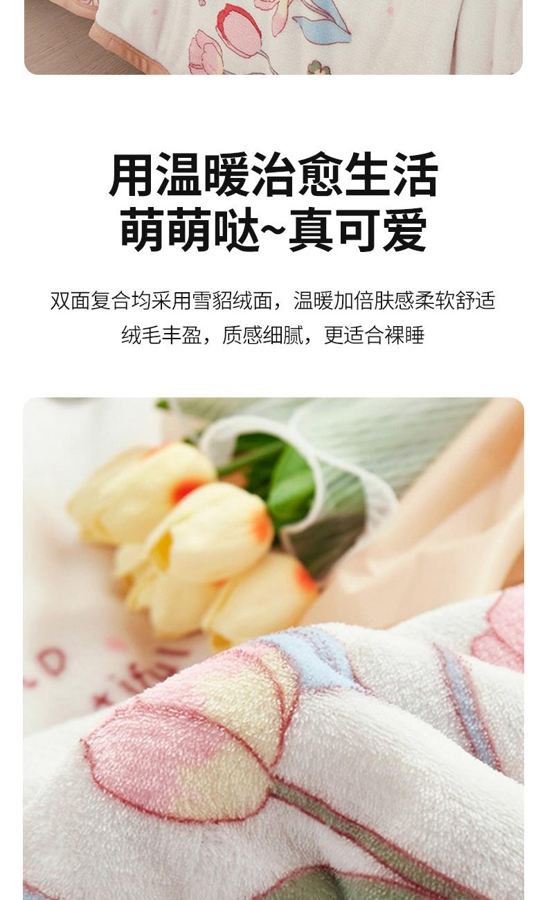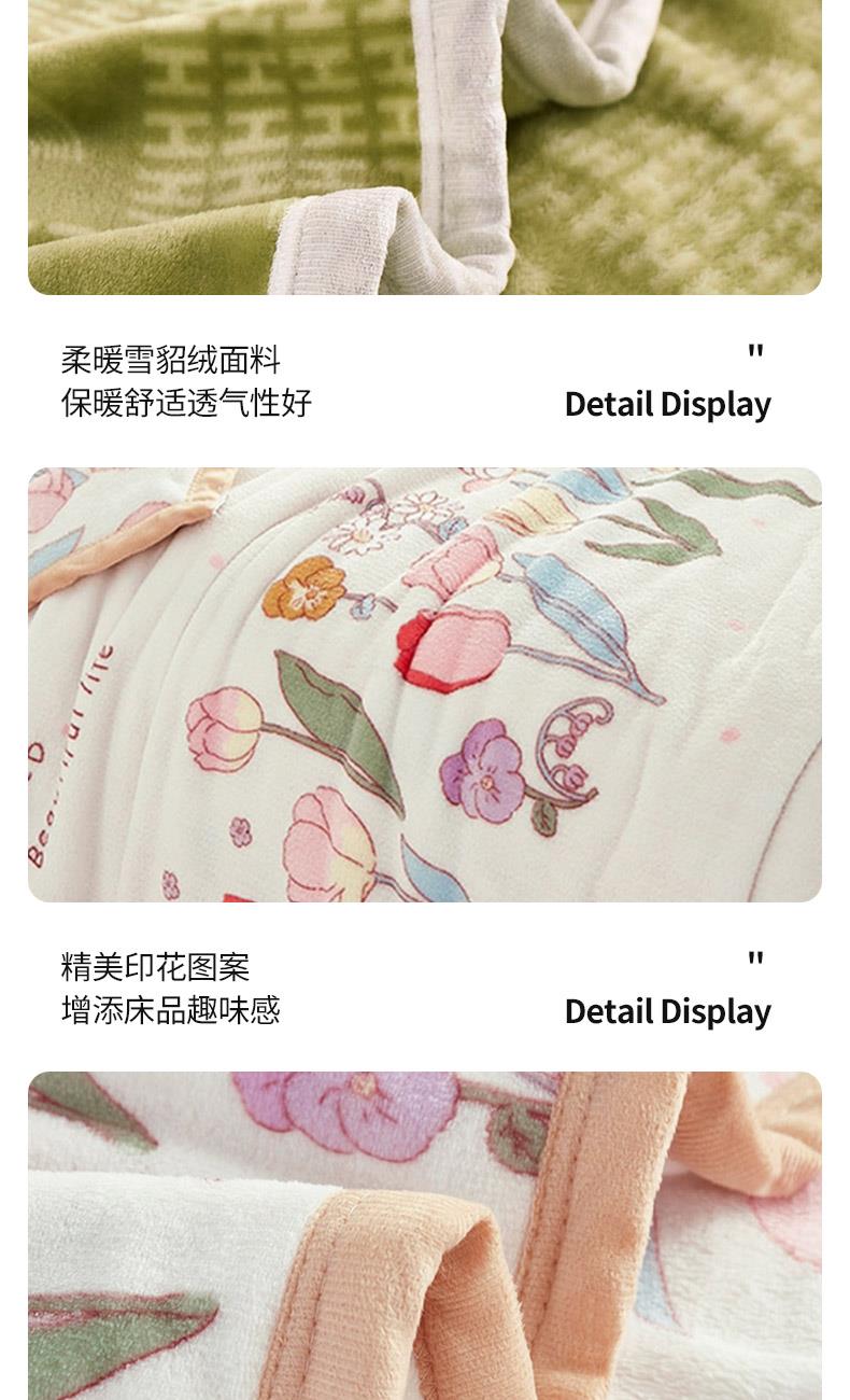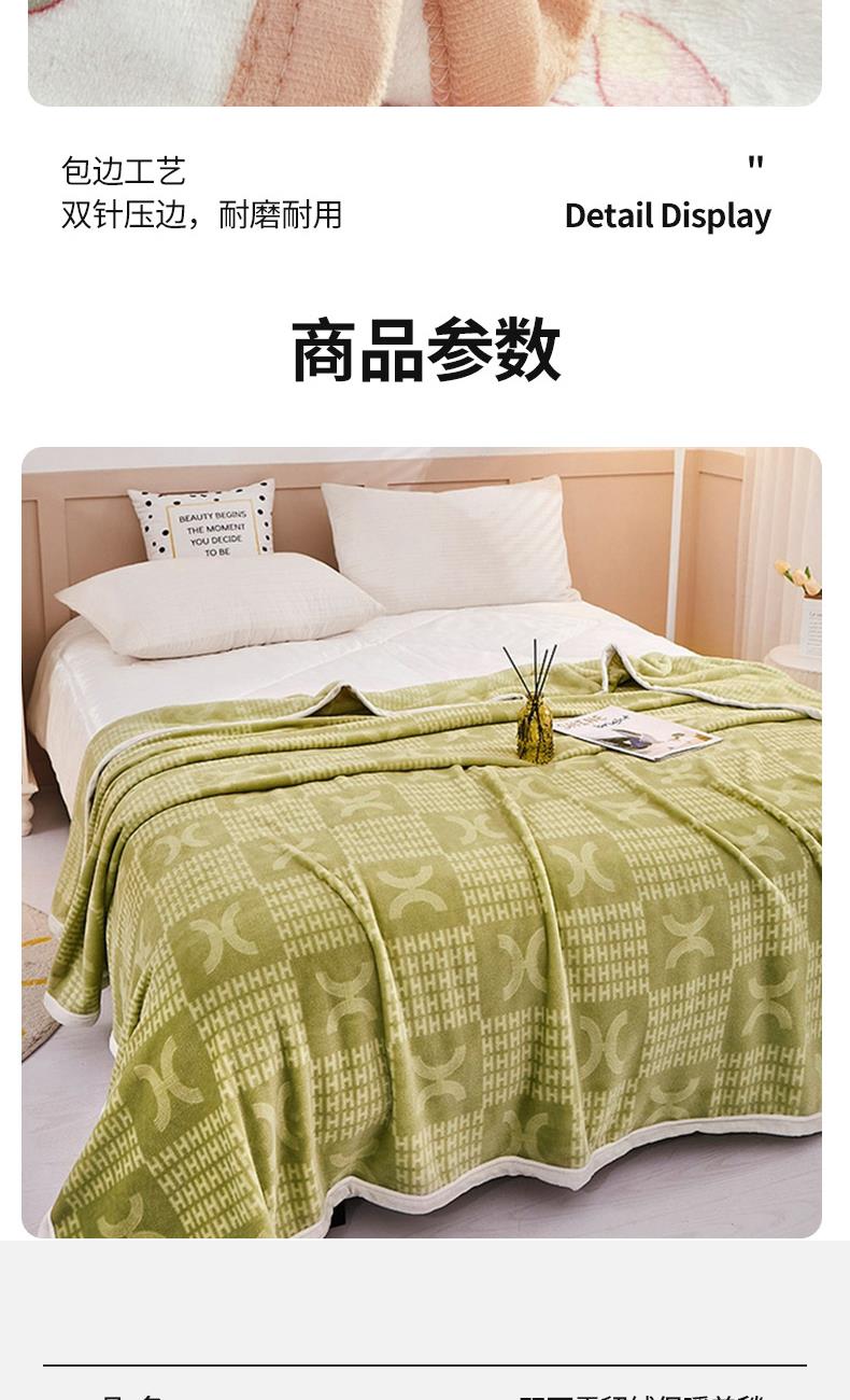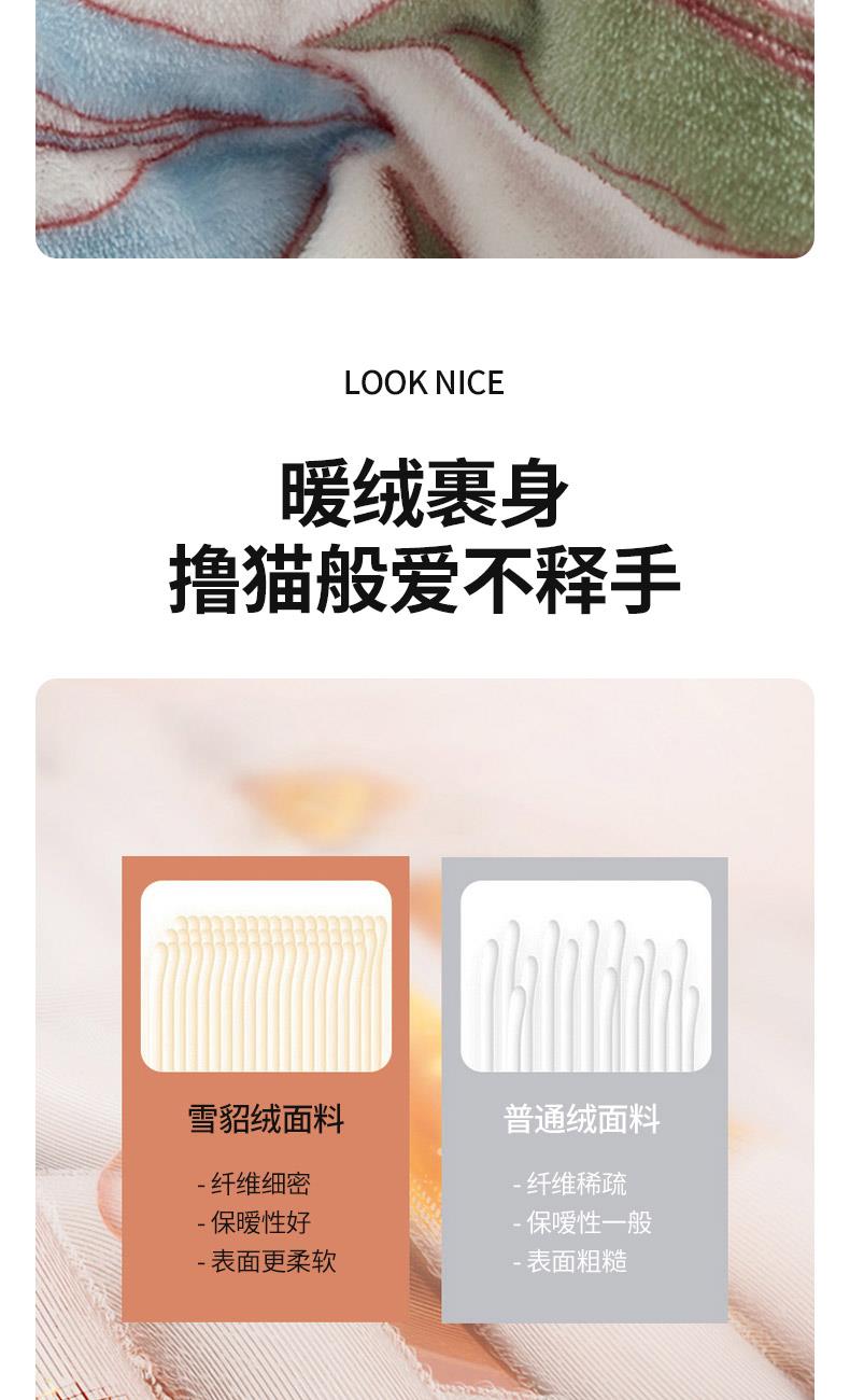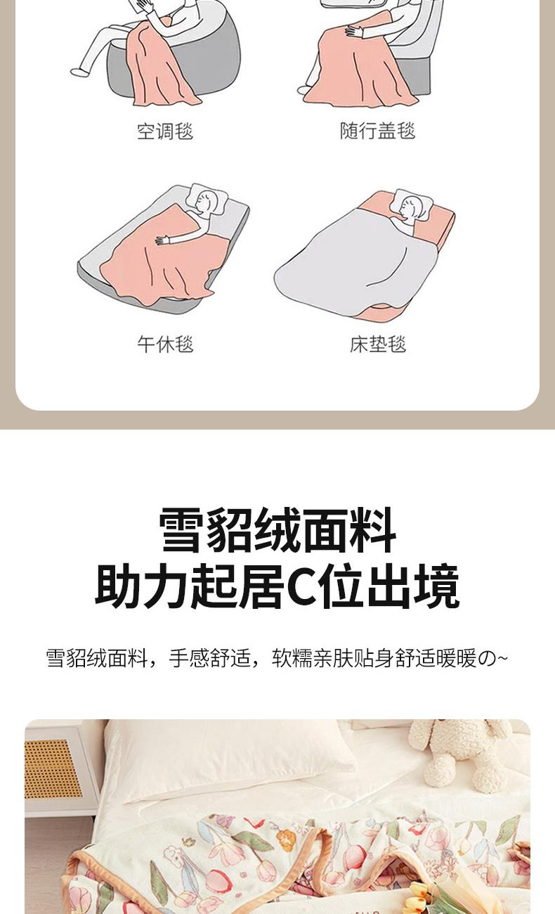 材质:云貂绒(聚酯纤维) 尺寸:180*200cm 产品介绍:1.面料采用A类水洗棉.高支高密,柔软亲肤享受高品质 带来的舒适感 2.触感如脂细腻丝滑,不含任何有害物质, 放心接触更安全双面触感,加宽包边设计更美观.