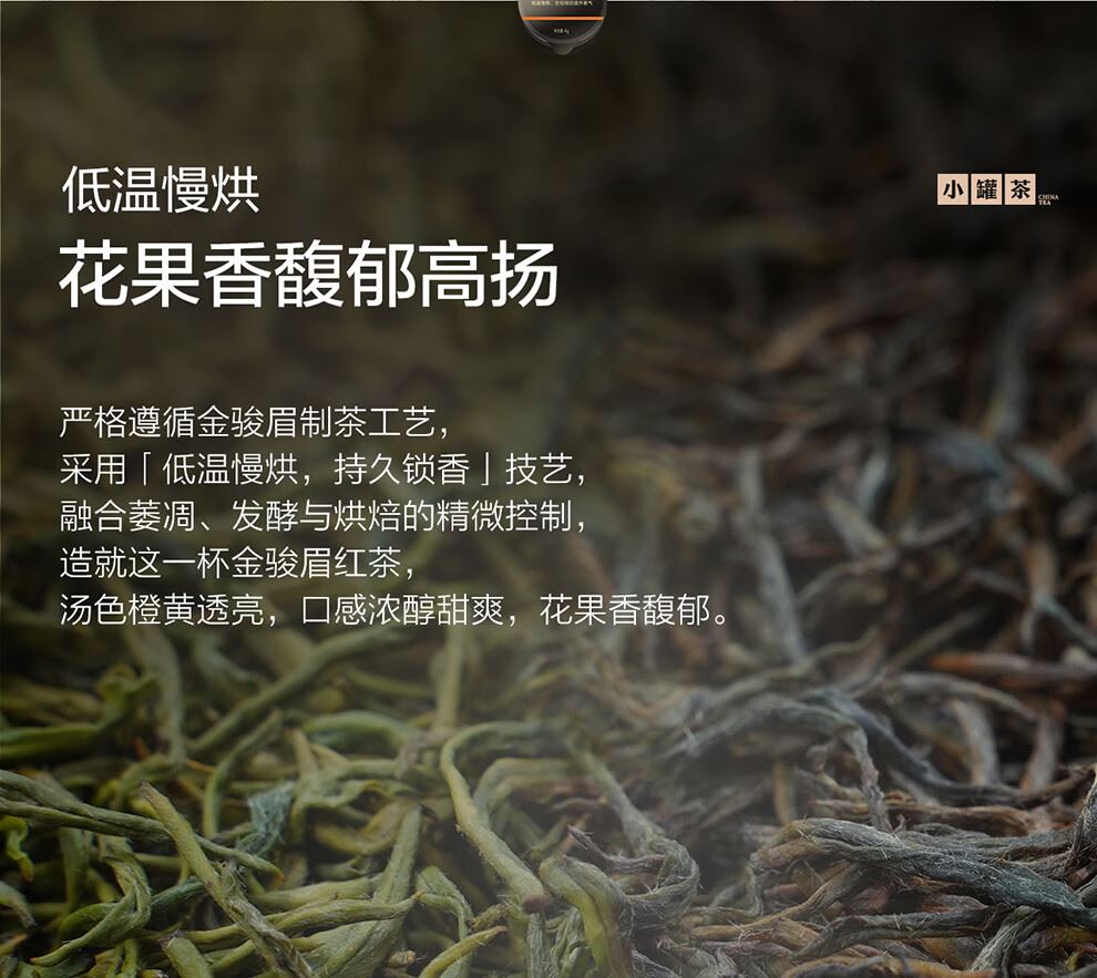 低温慢烘 花果香馥郁高扬 严格遵循金骏眉制茶工艺 采用「低温慢烘,持久锁香」技艺,融合萎凋、发酵与烘焙的精微控制,造就这一杯金骏眉红茶,汤色橙黄透亮,口感浓醇甜爽,花果香馥郁。