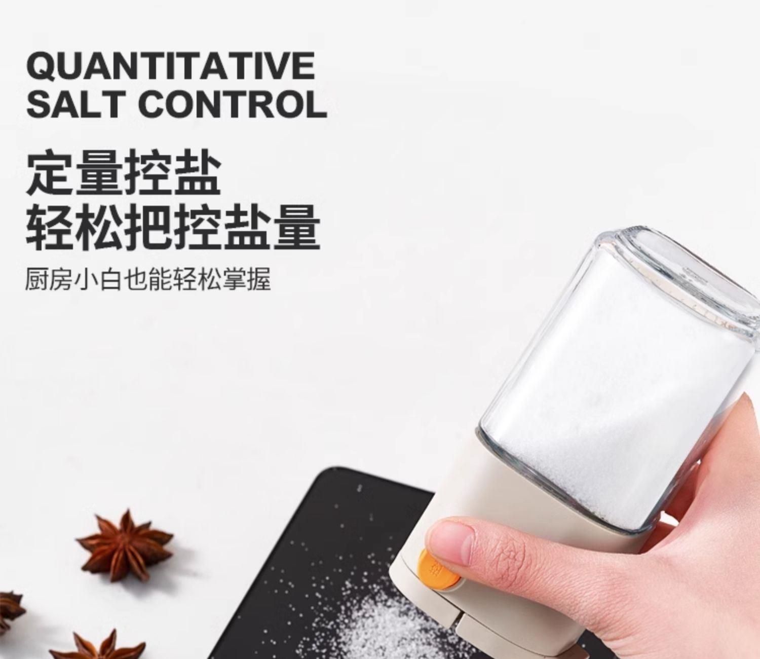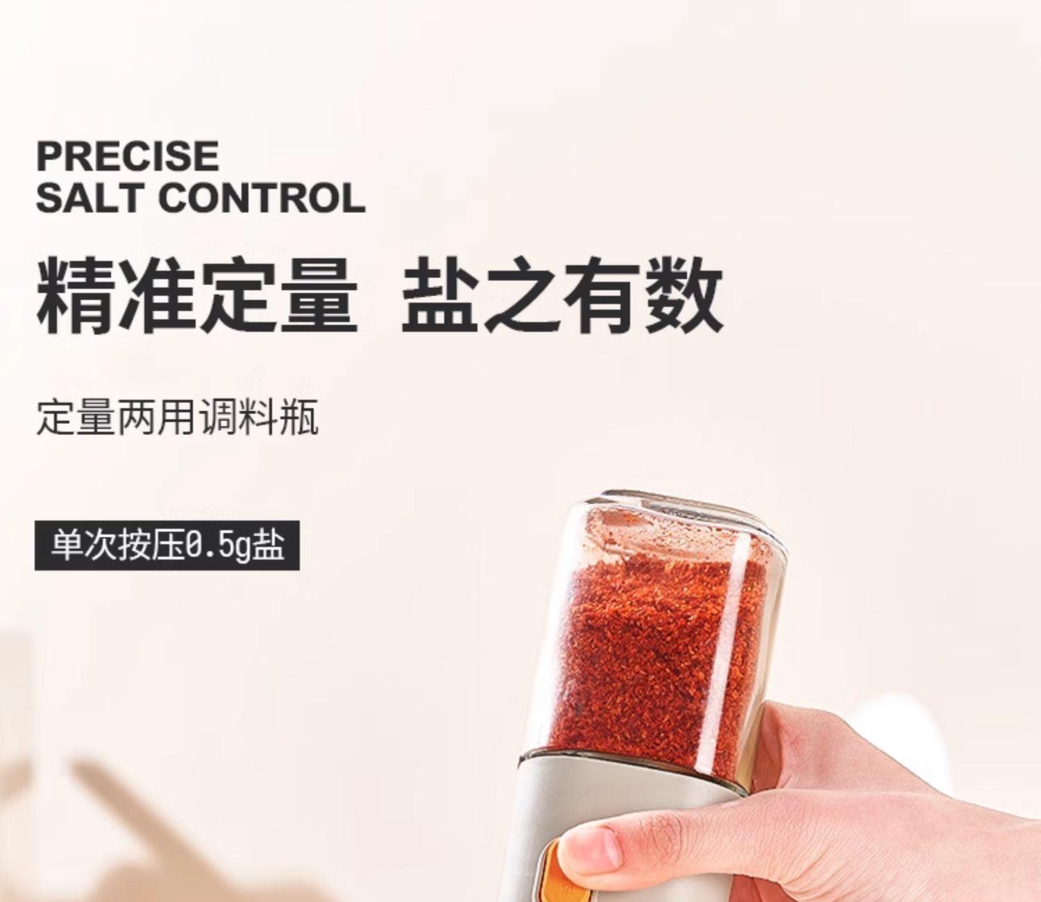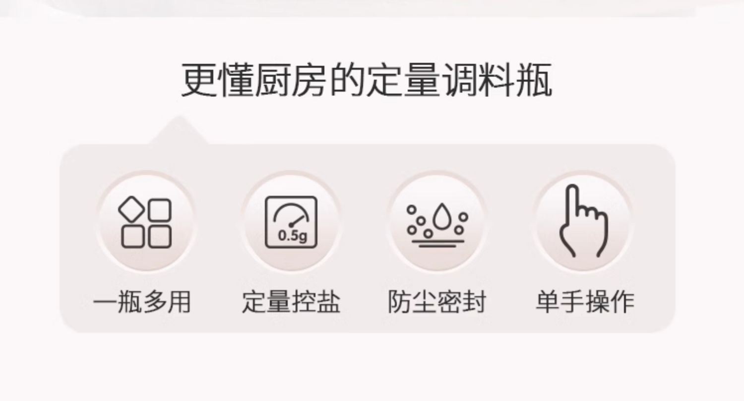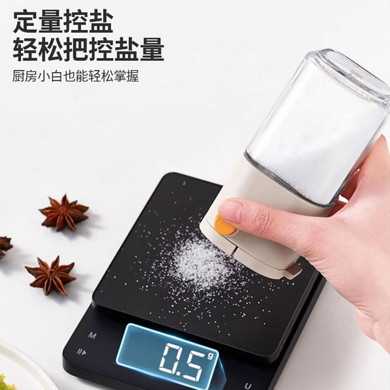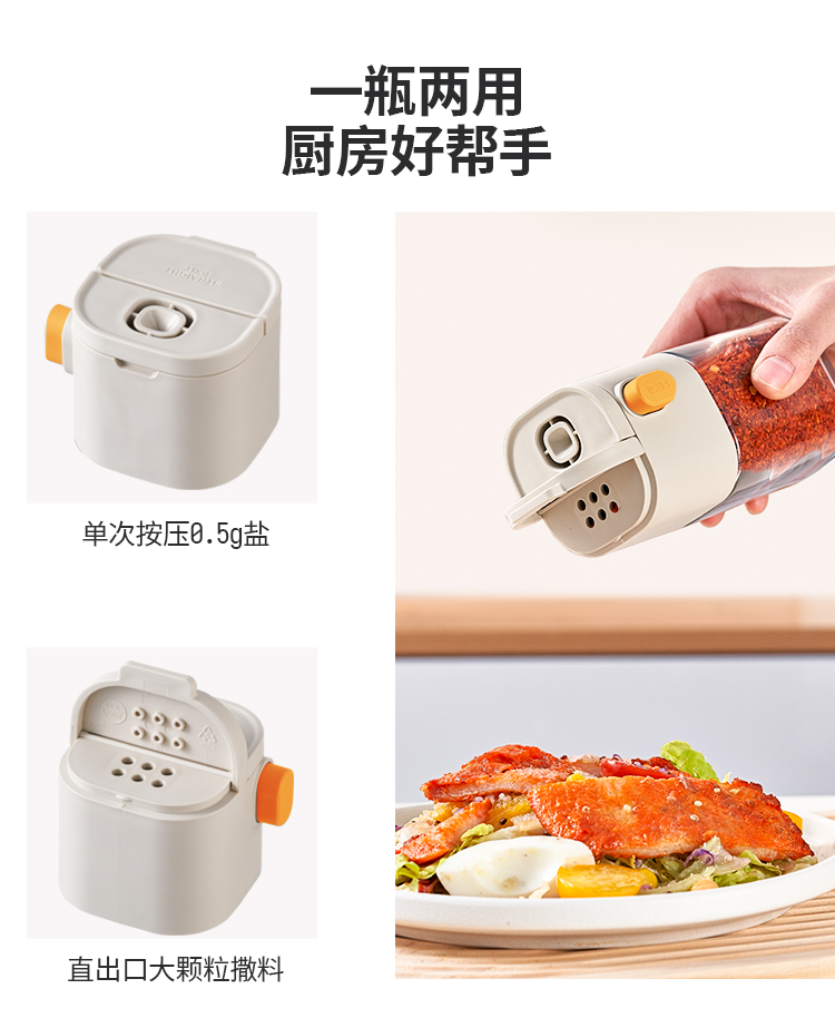 莱昂2.0定量两用调料瓶,单次按压0.5g盐 环形出料撒盐更均匀 斜坡导流设计分散出盐不结团 定量控盐,轻松把控盐量,厨房小白也能轻松掌握双重密封不给潮气可乘之机,导流坡有效阻隔油污潮气,避免卡盐结块 好拆易装 清洁无忧 全身可拆洗设计 易于清洁不藏污 单手即可按压,操作方便握感舒适 一瓶两用,控盐撒料一气呵成。 加厚瓶体耐磨耐用余量可视