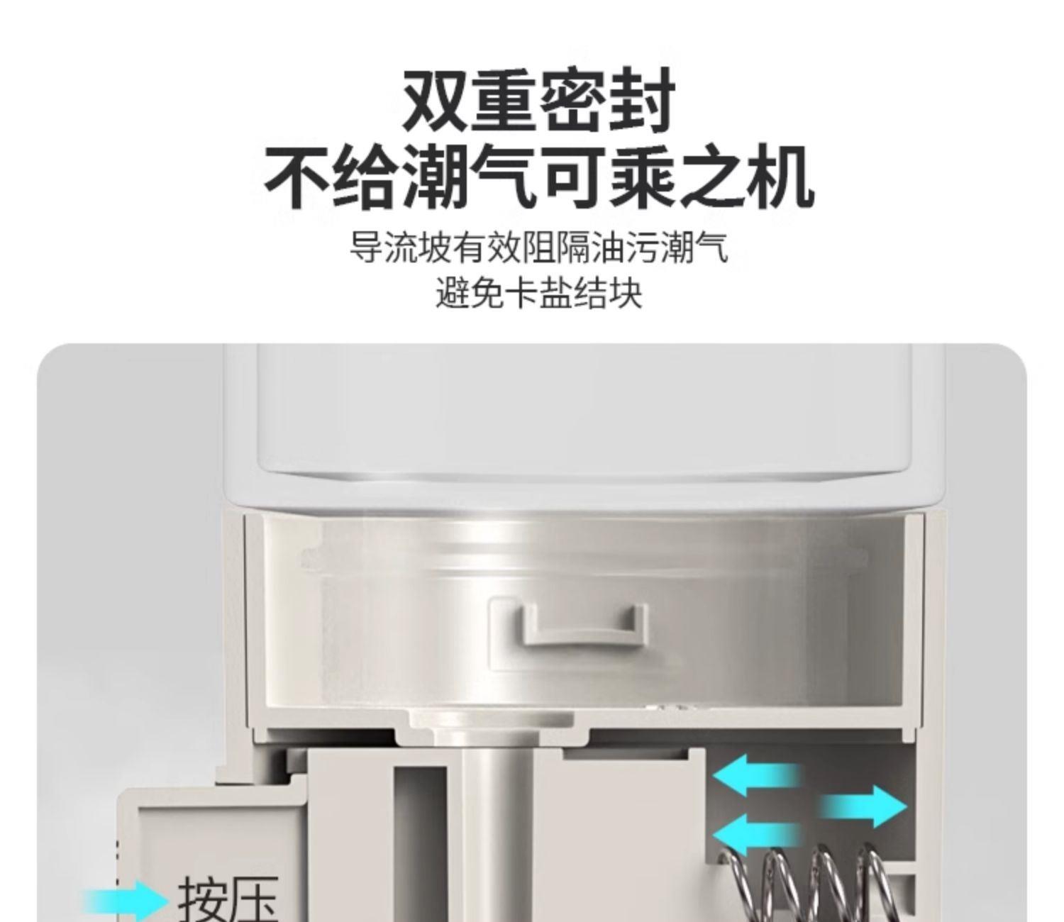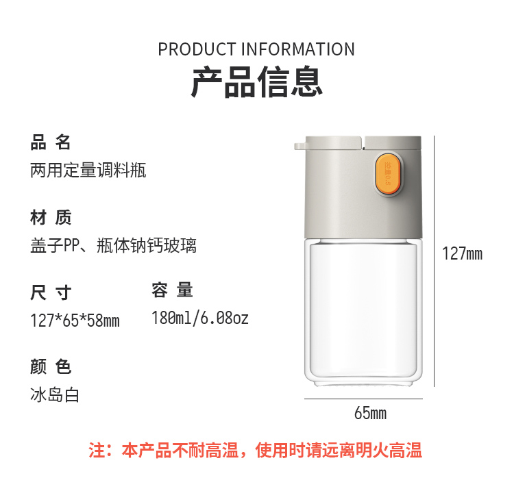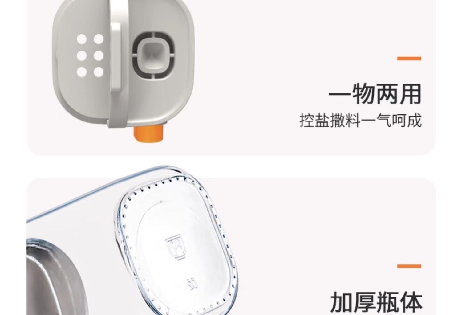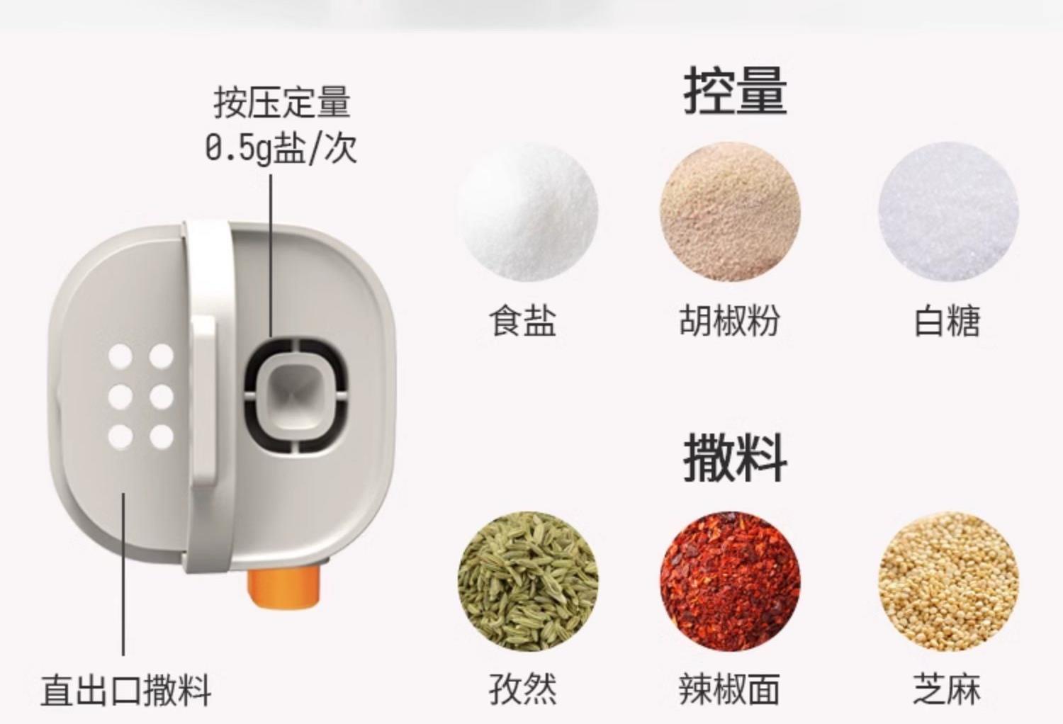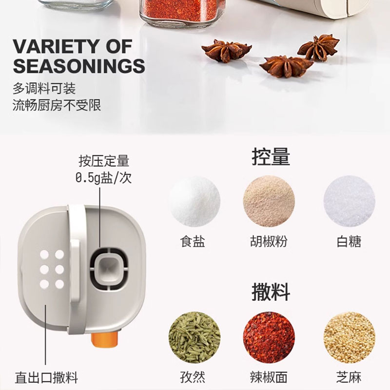 莱昂2.0定量两用调料瓶,单次按压0.5g盐 环形出料撒盐更均匀 斜坡导流设计分散出盐不结团 定量控盐,轻松把控盐量,厨房小白也能轻松掌握双重密封不给潮气可乘之机,导流坡有效阻隔油污潮气,避免卡盐结块 好拆易装 清洁无忧 全身可拆洗设计 易于清洁不藏污 单手即可按压,操作方便握感舒适 一瓶两用,控盐撒料一气呵成。 加厚瓶体耐磨耐用余量可视